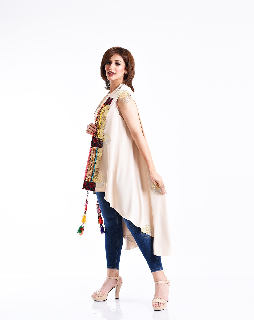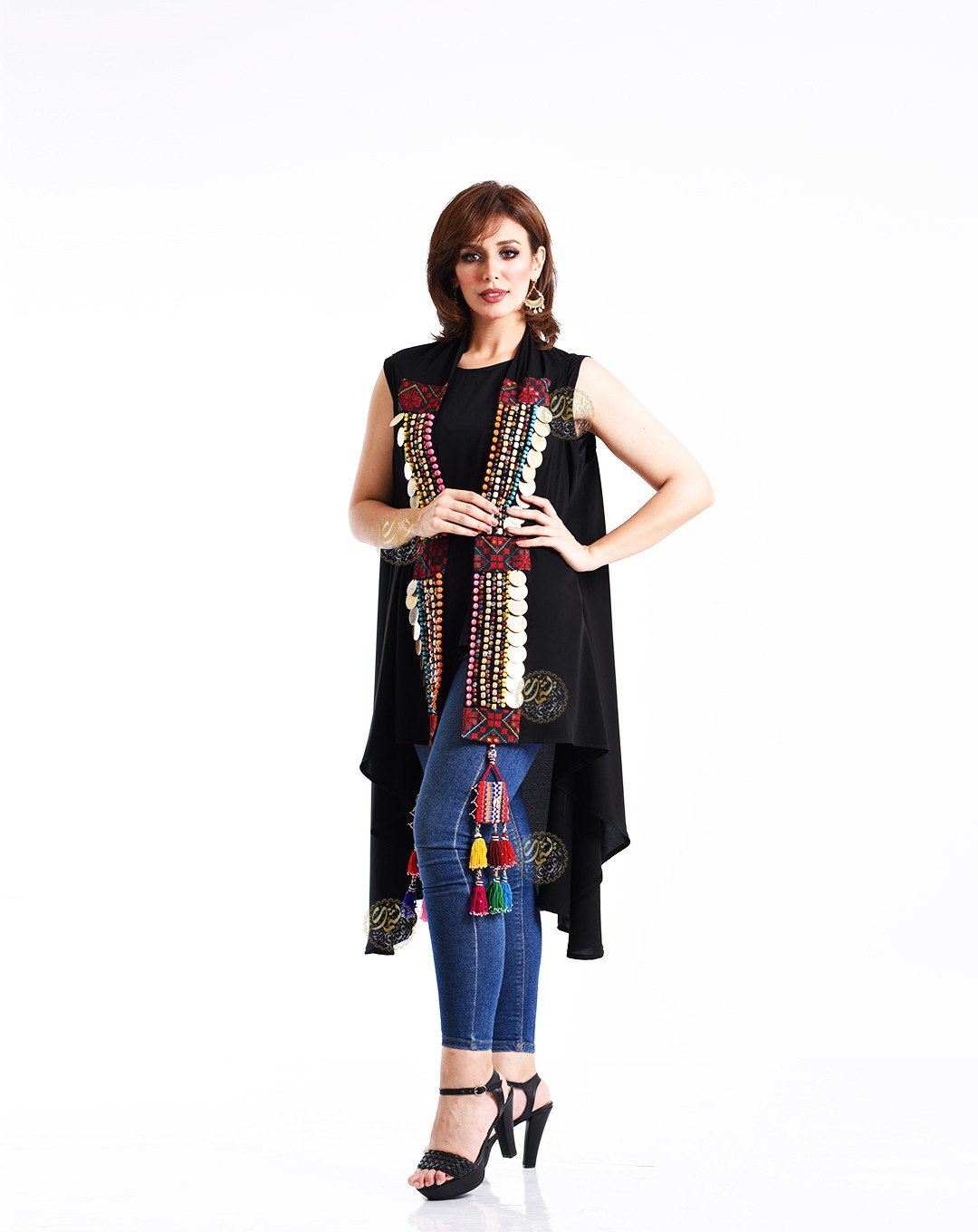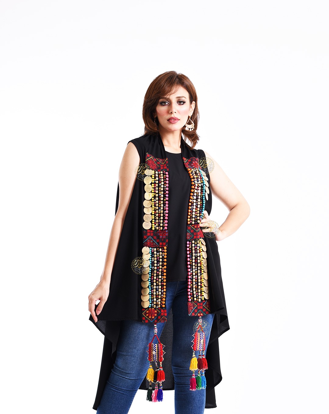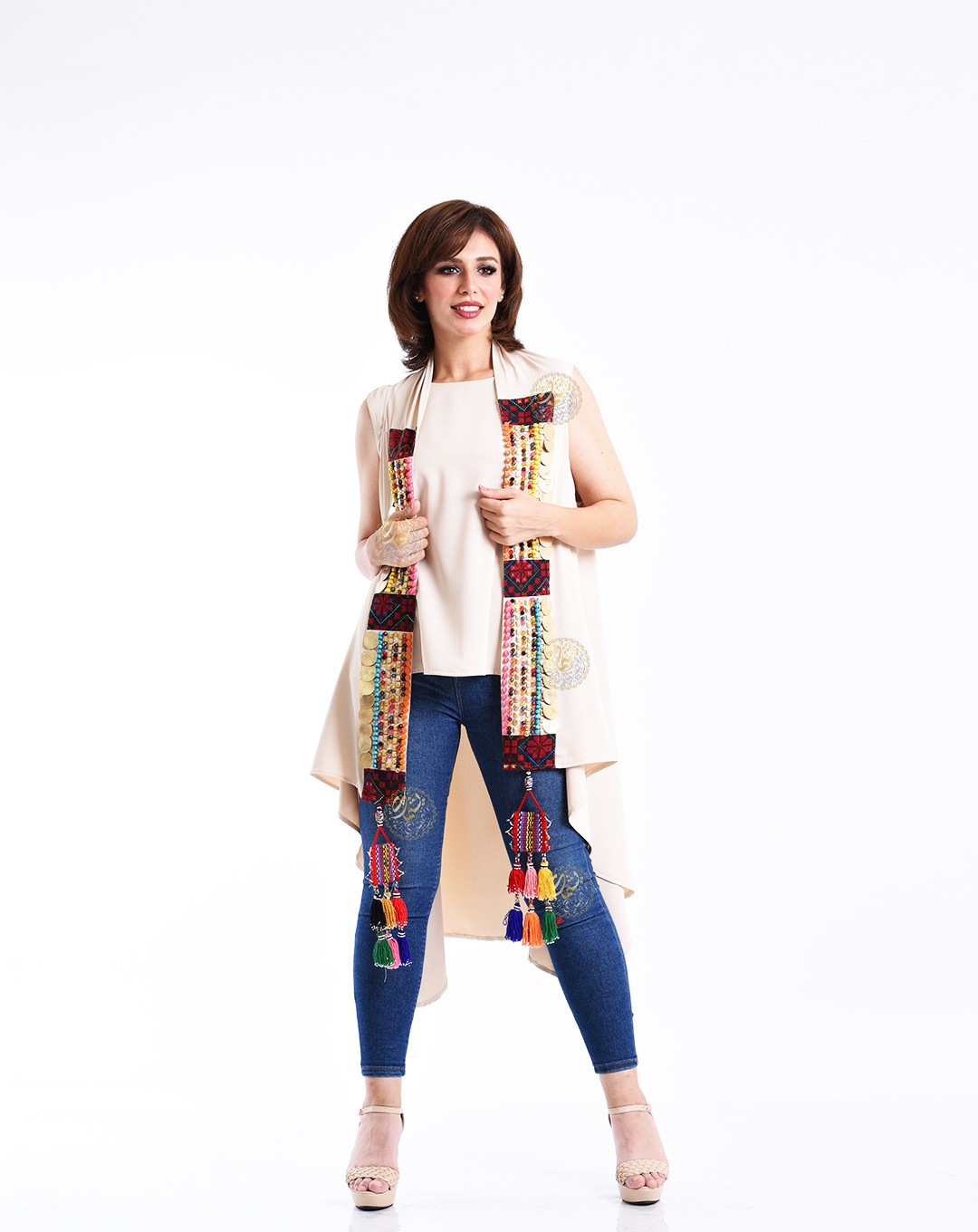 embroidered with copper, coins, and colorful Bedouin beads, complemented by
