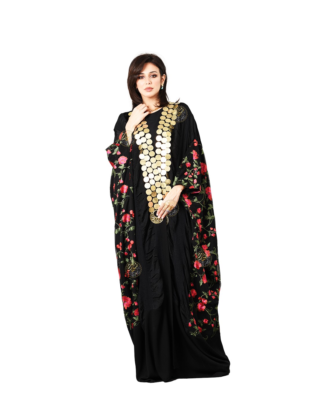 roses, and adorned with copper coins and gypsy earrings. The design is