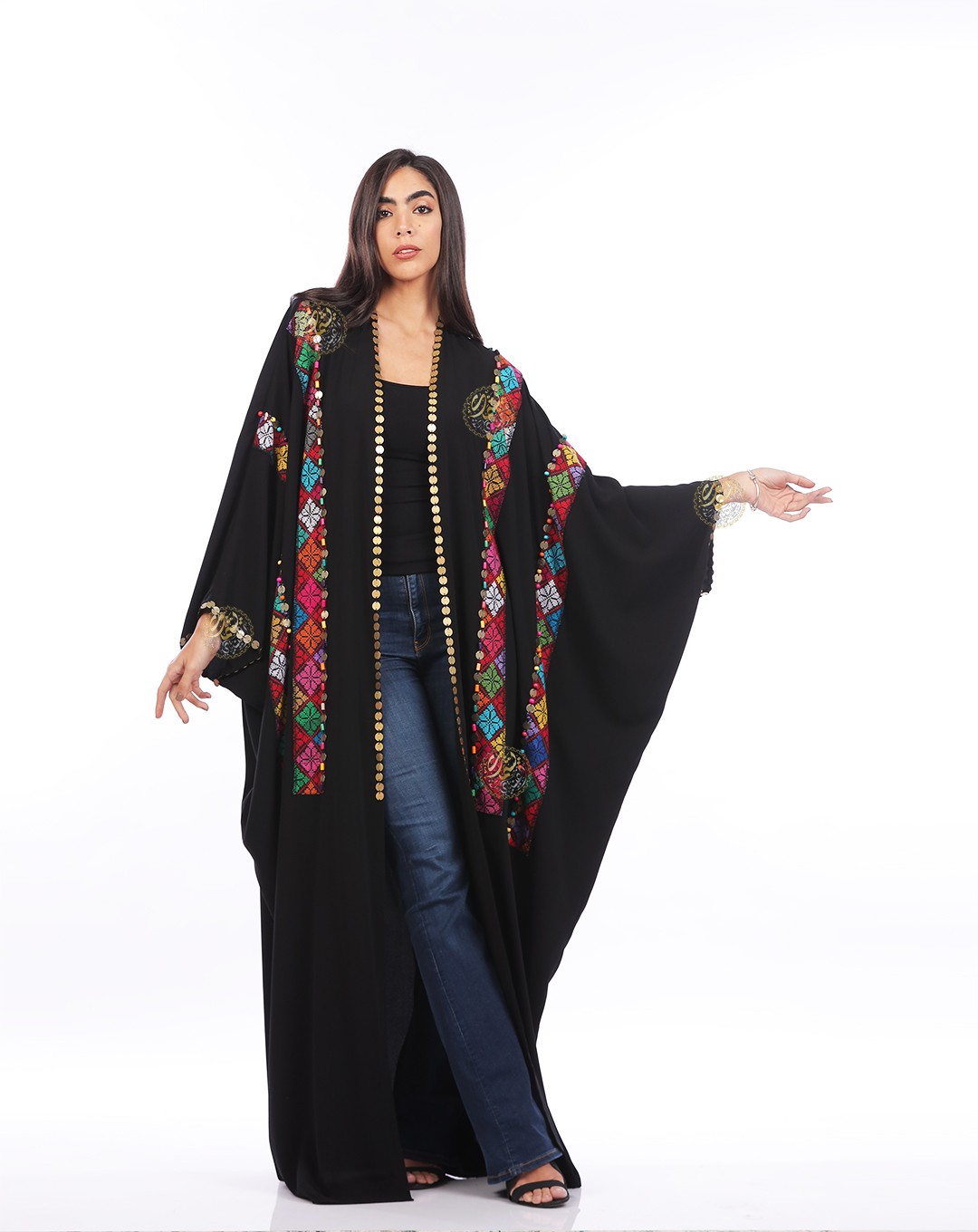 One of the most important and beautiful designs, this very elegant caftan is inspired by authentic Bedouin style. Made from luxurious royal crepe fabric with hand-embroidered etamin, and embellished with copper coins and colorful Bedouin beads. Available in a one-size fits all.
