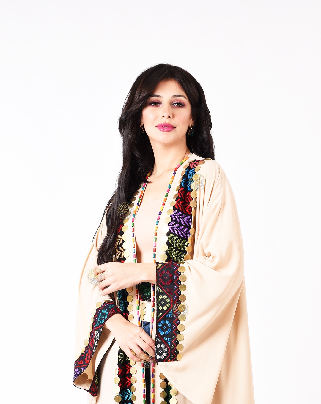 One of the most important and beautiful designs, this very elegant caftan is inspired by authentic Bedouin style. Made from luxurious royal crepe fabric with hand-embroidered etamin, and embellished with copper coins and colorful Bedouin beads. Available in a one-size fits all.