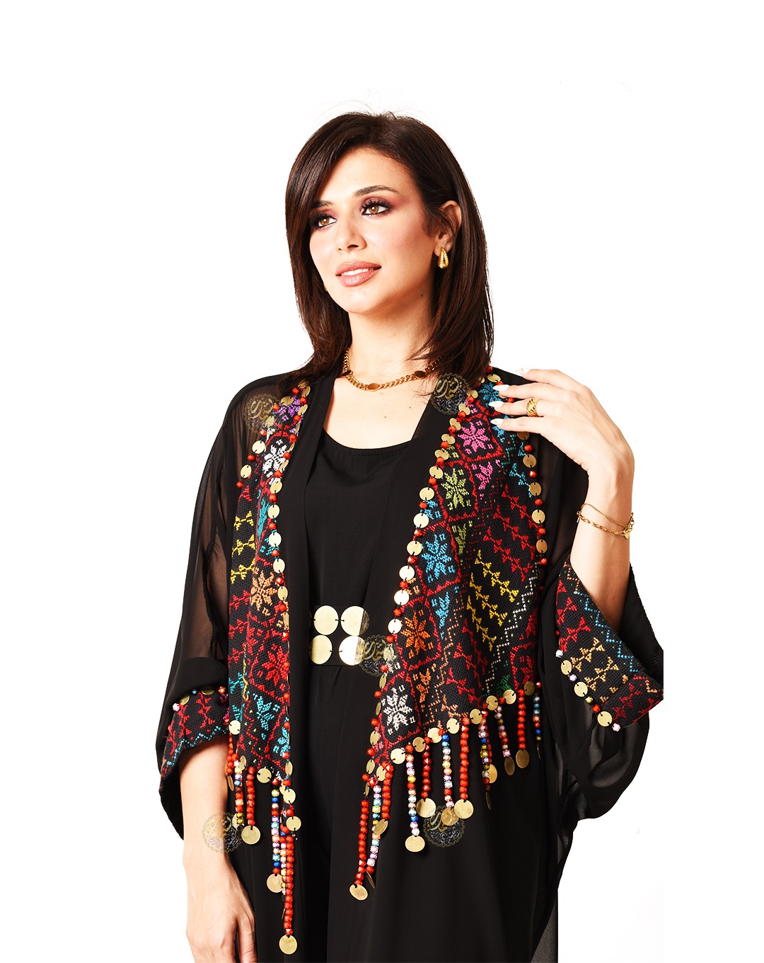 One of the most important and beautiful designs, this very elegant caftan is inspired by authentic Bedouin style. Made from luxurious royal Chiffon fabric with hand-embroidered etamin, and embellished with copper coins and colorful Bedouin beads. Available in a one-size fits all.