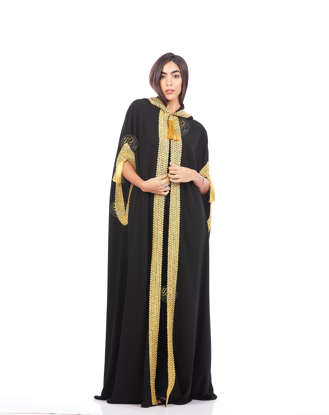 A luxurious royal crepe kaftan, inspired by Moroccan heritage, adorned with golden sirma threads. Perfect for soirées, simple occasions, and Ramadan nights. Available in a one-size-fits-all (free size) to suit all body types.