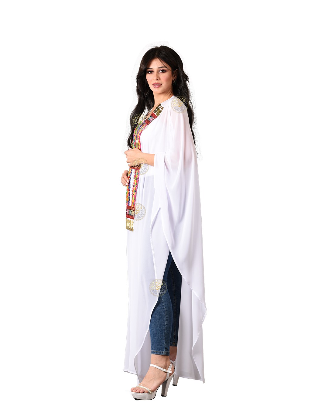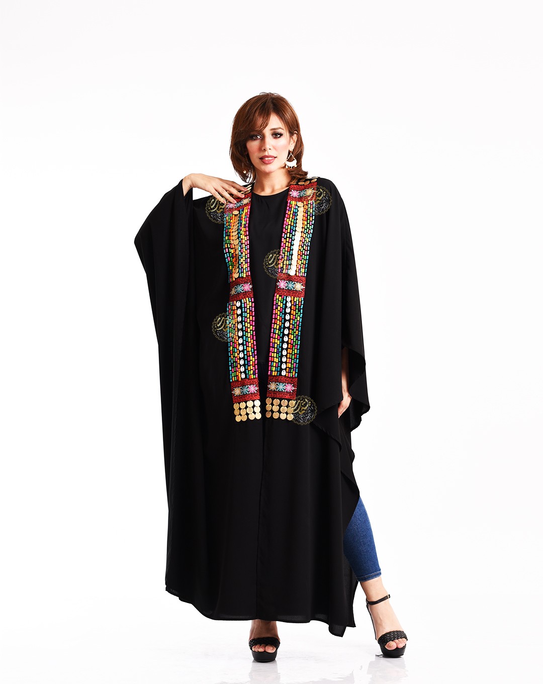 One of the most important and beautiful designs, this very elegant caftan is inspired by authentic Bedouin style. Made from luxurious royal Chiffon fabric with hand-embroidered etamin, and embellished with copper coins and colorful Bedouin beads. Available in a one-size fits all.