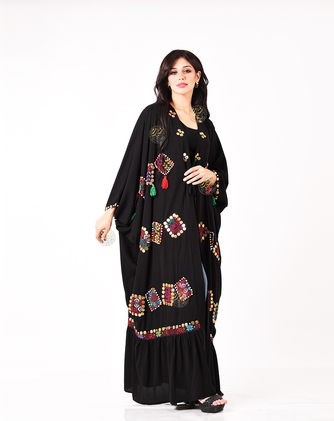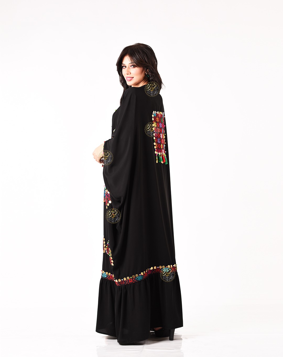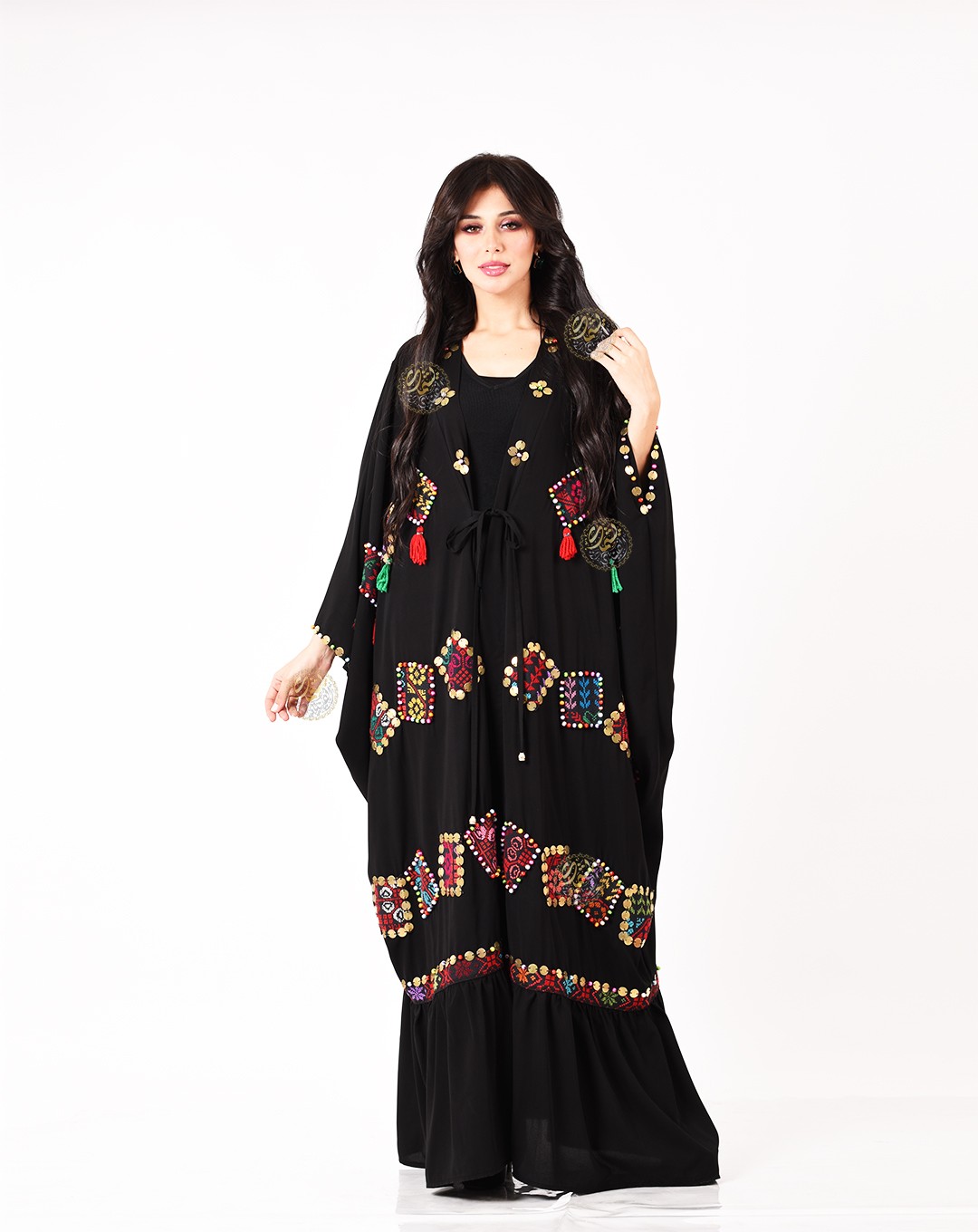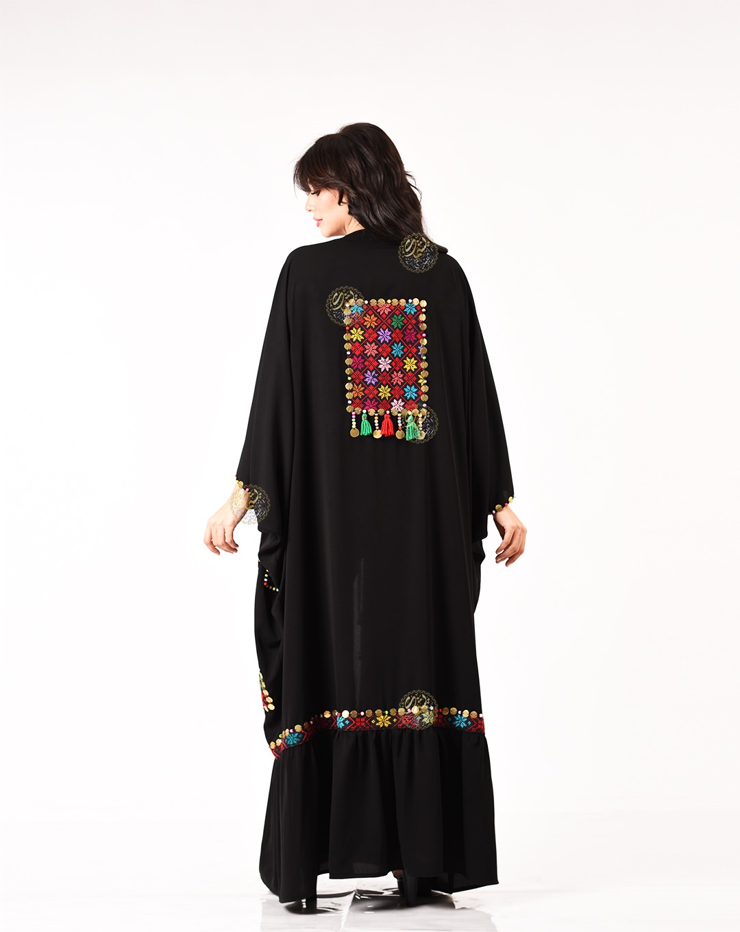 One of the most important and beautiful designs, this very elegant caftan is inspired by authentic Bedouin style. Made from luxurious royal crepe fabric with hand-embroidered etamin, and embellished with copper coins and colorful Bedouin beads. Available in a one-size fits all.