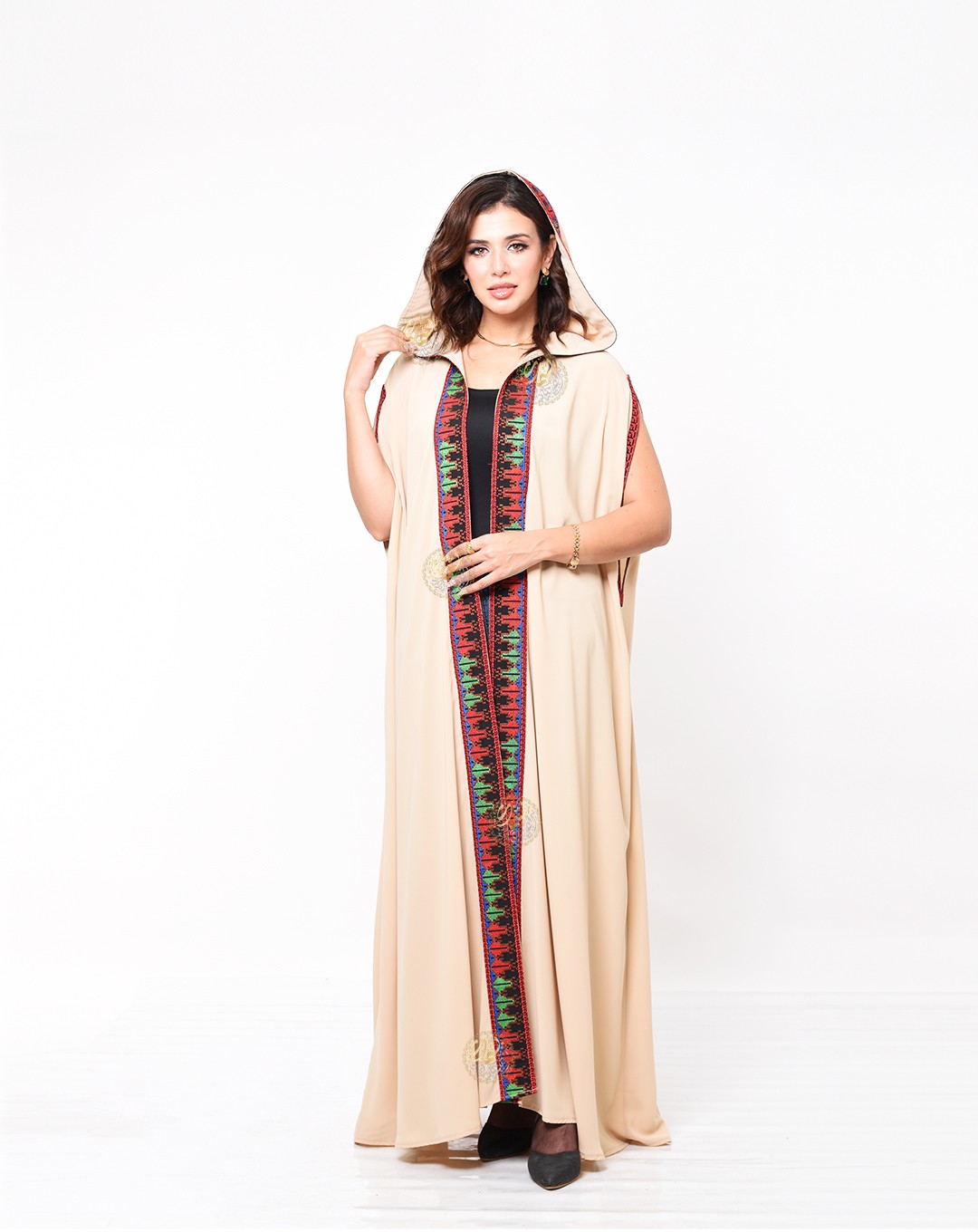 An elegant Moroccan-style cape made from luxurious royal crepe fabric, adorned with unique Palestinian embroidery, adding a distinctive oriental touch. Available in one size (Free Size) to fit all body types.