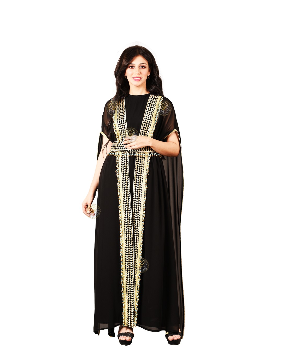 made from luxurious royal crepe fabric, paired with a black chiffon cape,