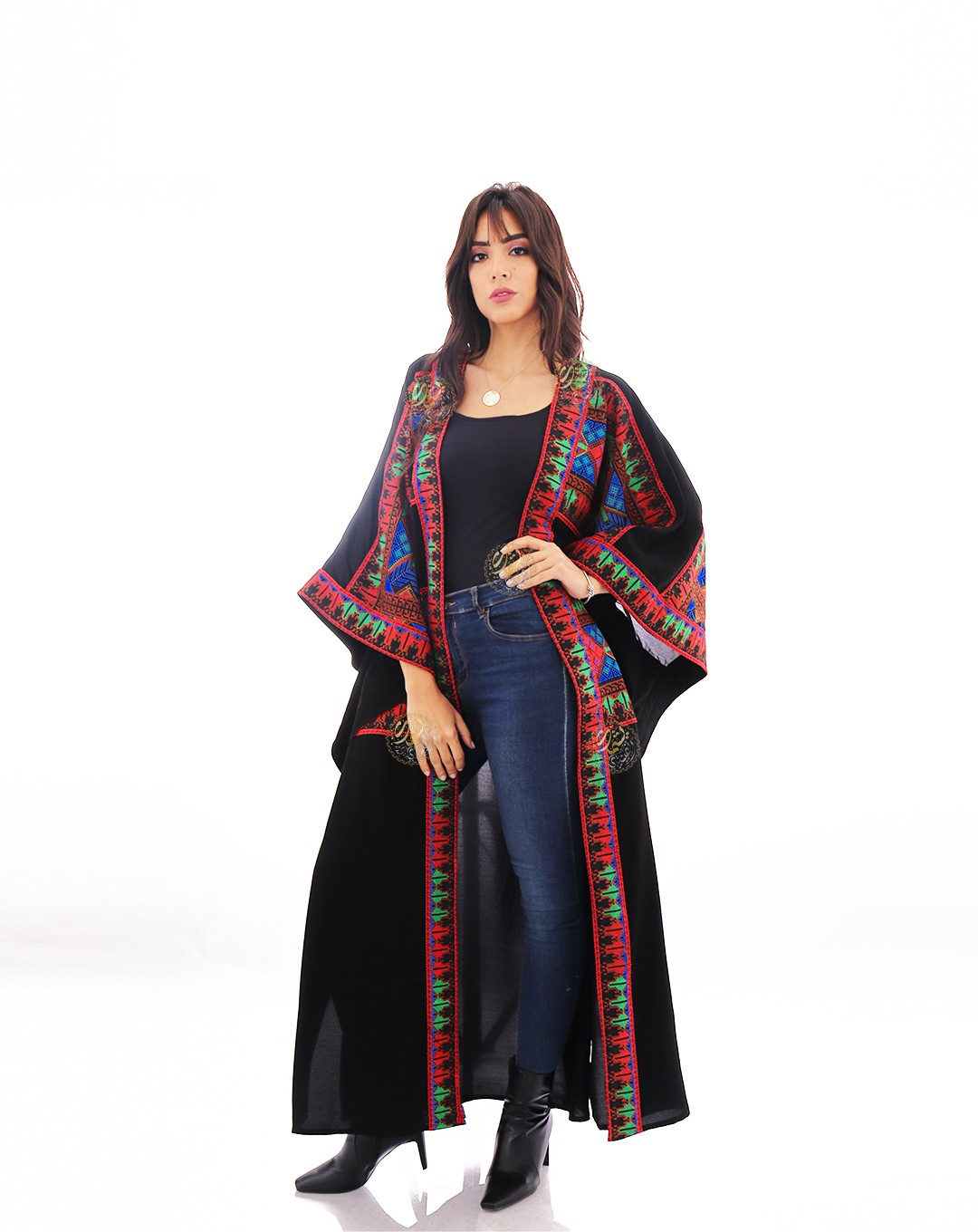 Palestinian design, embellished with oriental fabric and raised stitching,