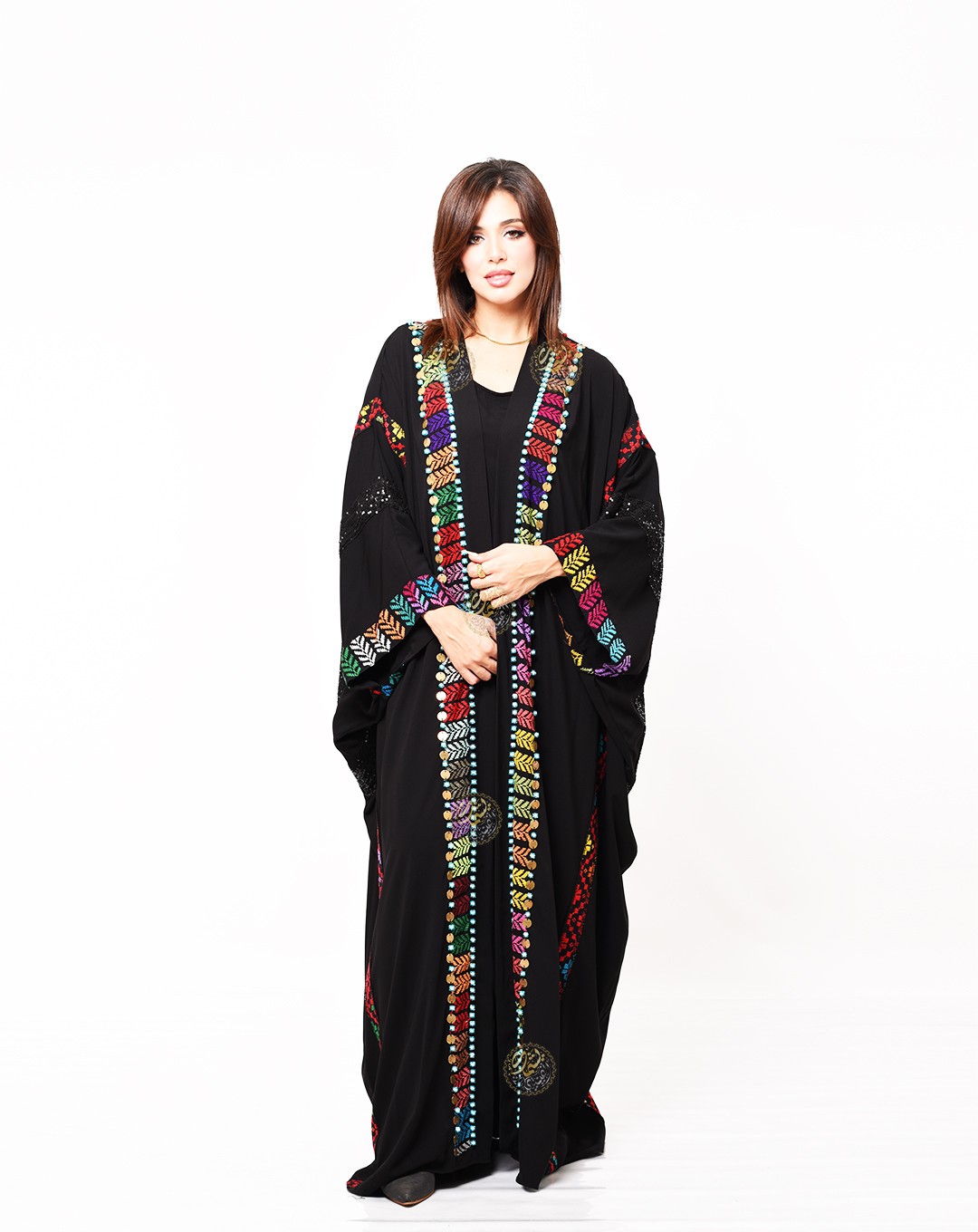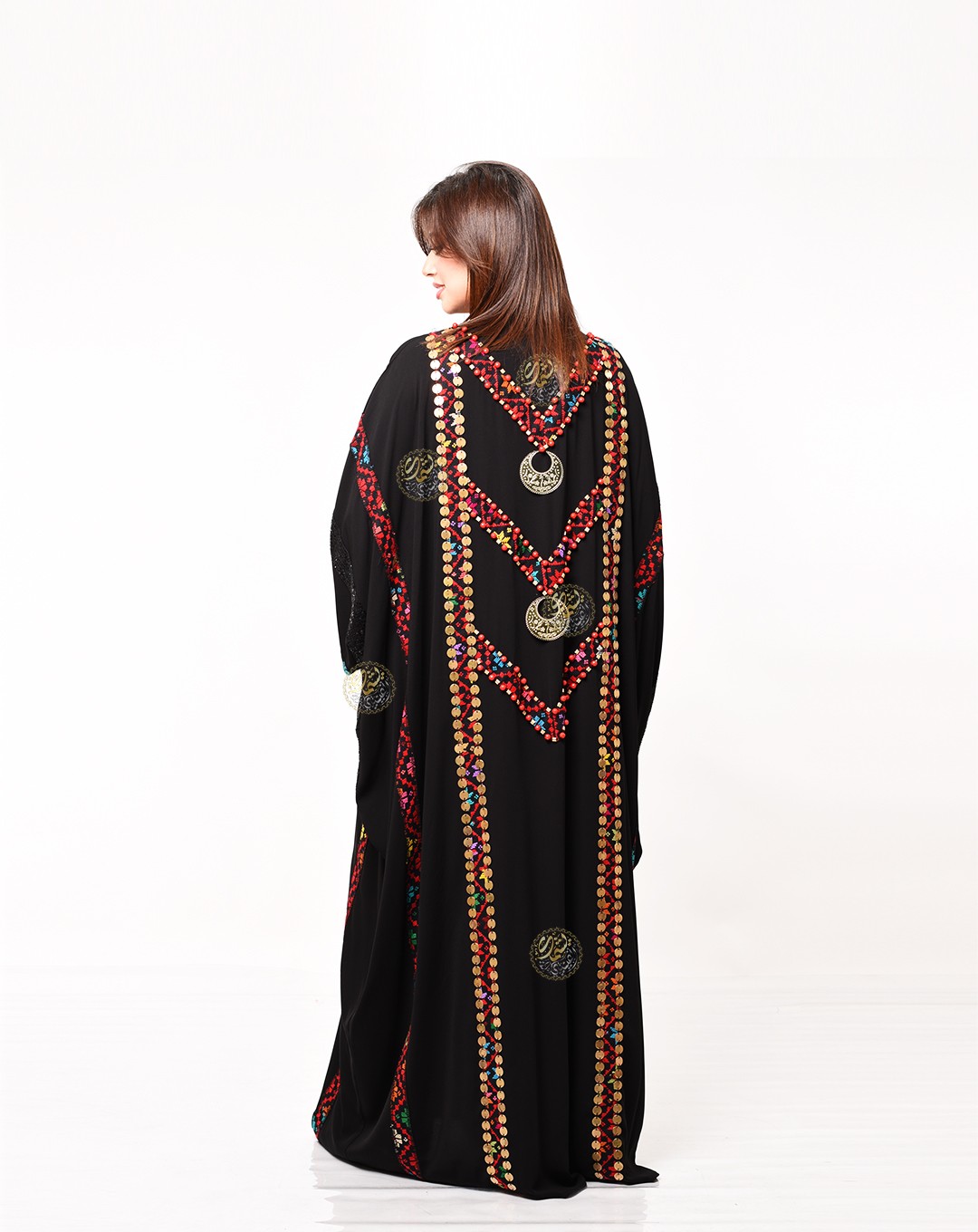 and fully hand-embroidered with brass, colorful beads, and gypsy earrings. An