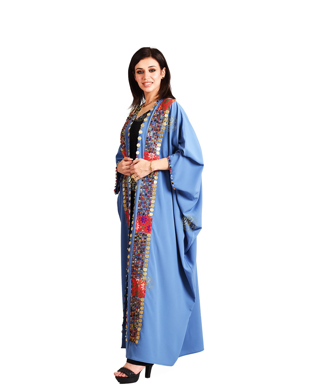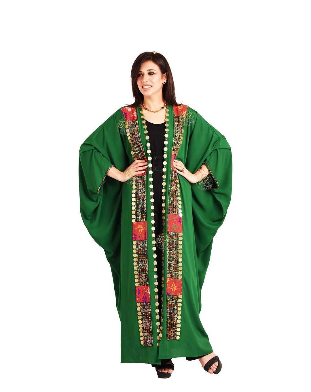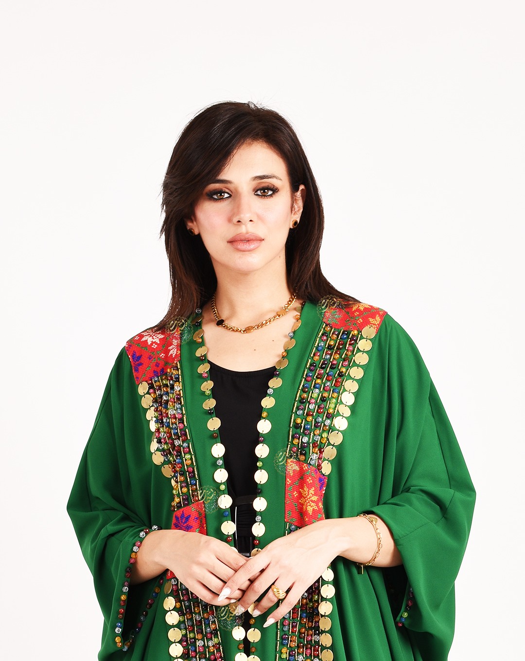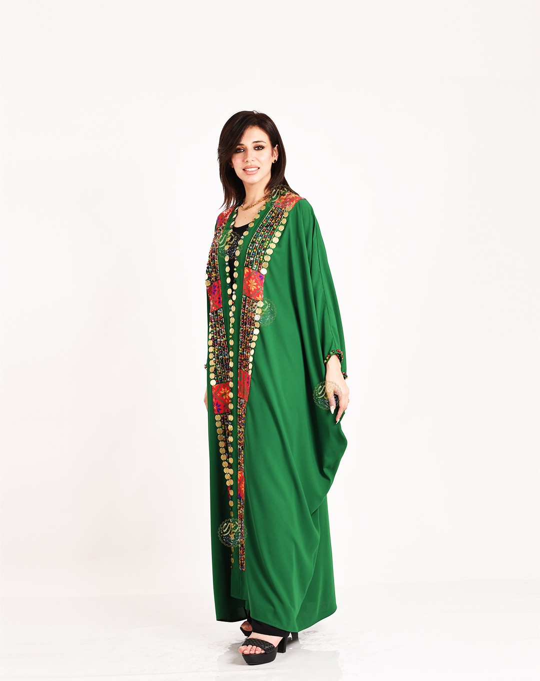 One of the most important and beautiful designs, this very elegant caftan is inspired by authentic Bedouin style. Made from luxurious royal crepe fabric with hand-embroidered etamin, and embellished with copper coins and colorful Bedouin beads. Available in a one-size fits all.