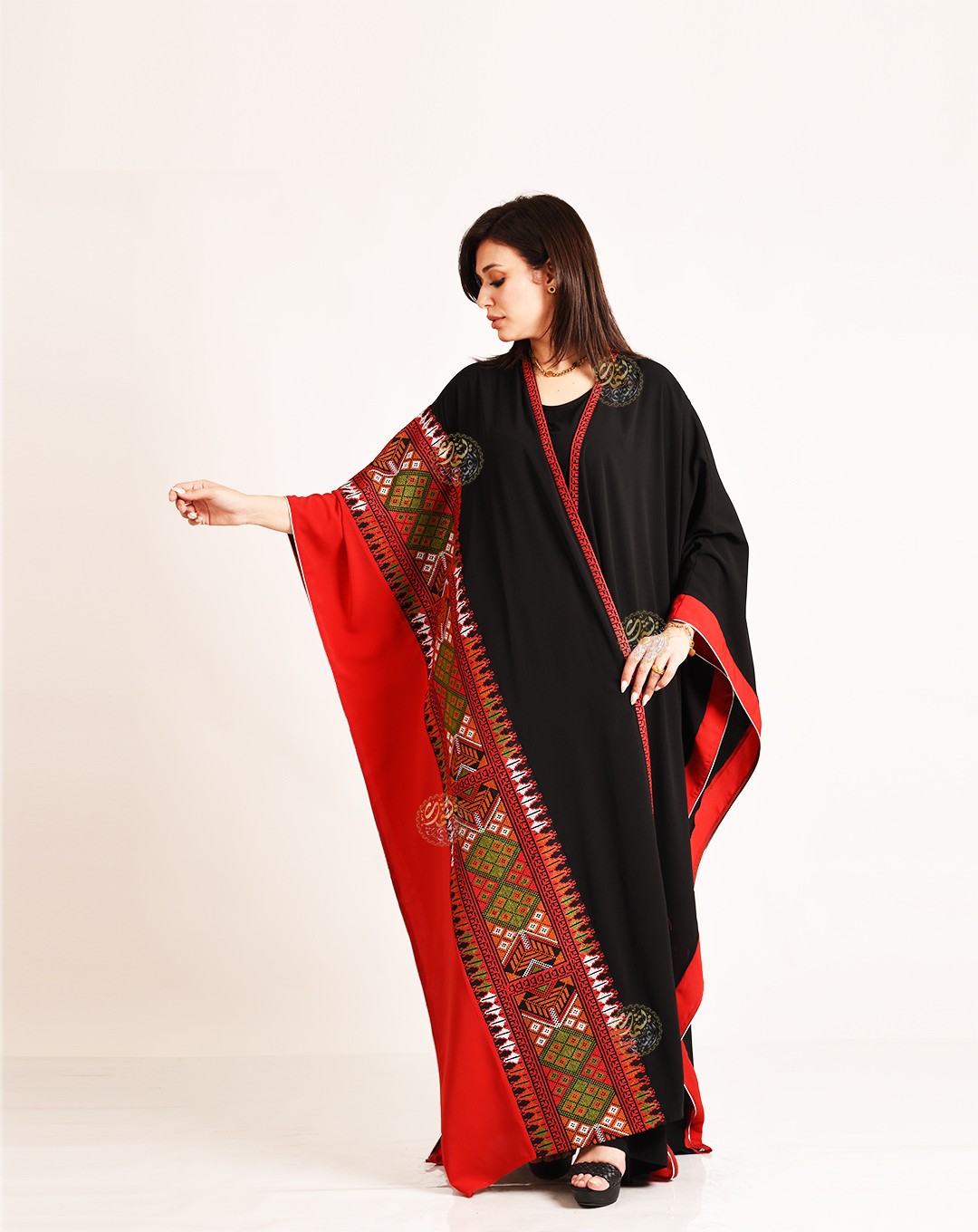 A beautiful kaftan with a unique design made from royal crepe, adorned with authentic Palestinian embroidery. Available in one size (Free Size).