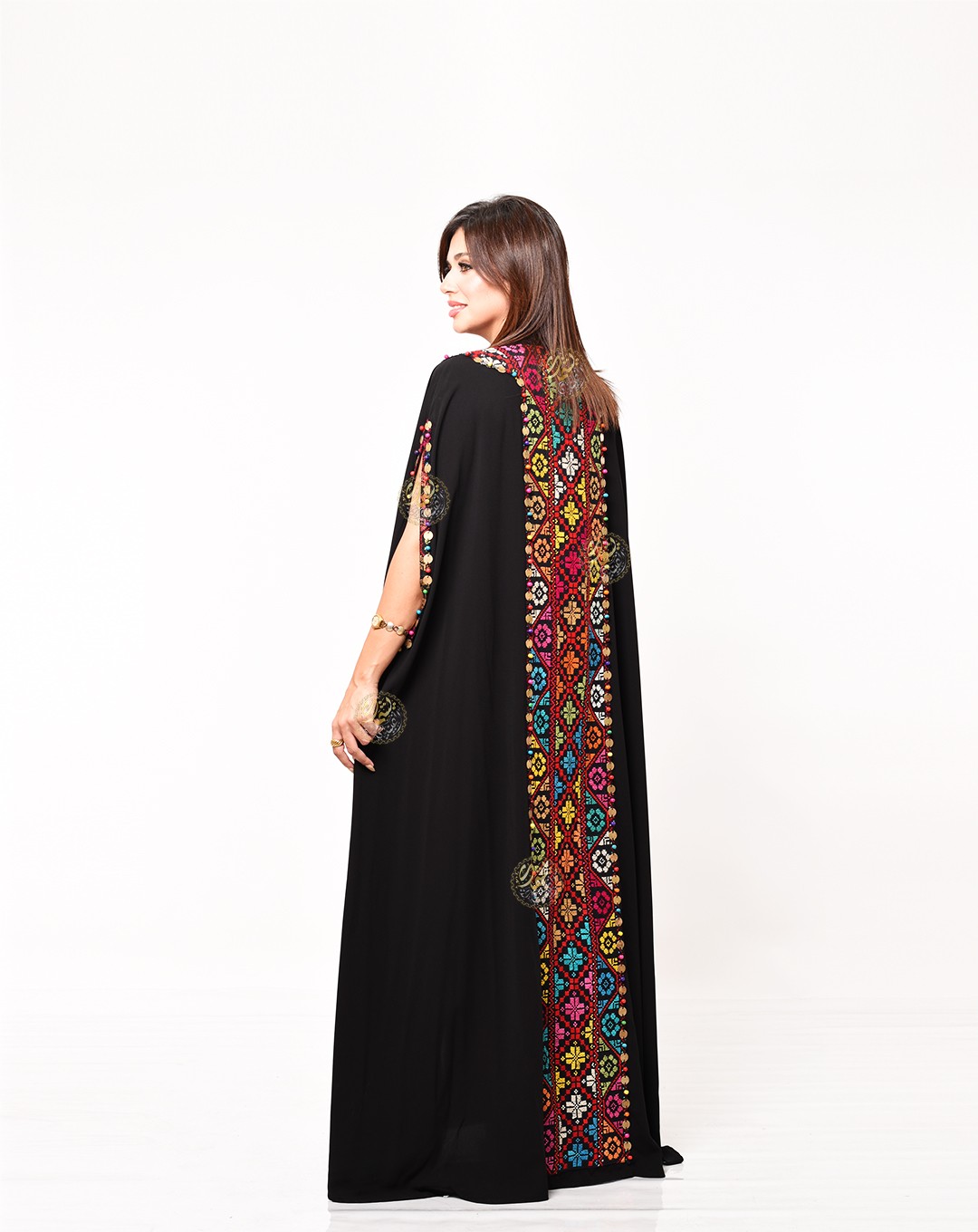 One of the most important and beautiful designs, this very elegant caftan is inspired by authentic Bedouin style. Made from luxurious royal crepe fabric with hand-embroidered etamin, and embellished with copper coins and colorful Bedouin beads. Available in a one-size fits all.