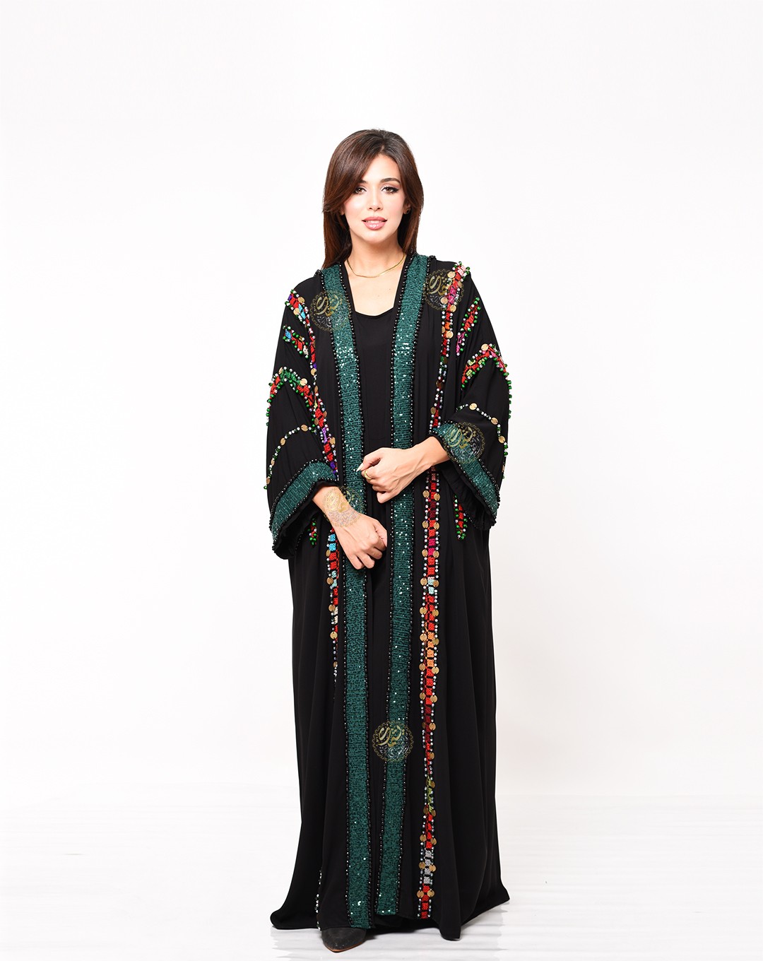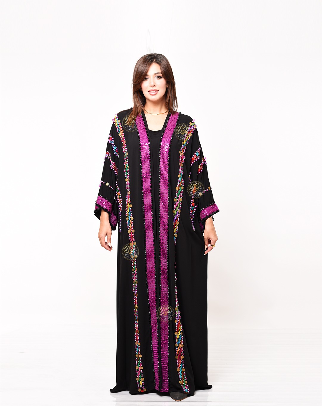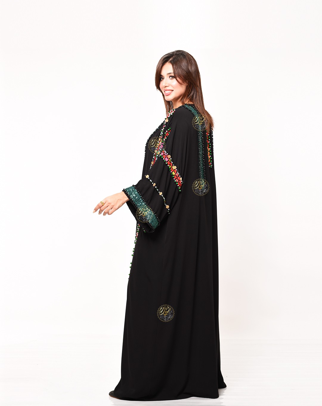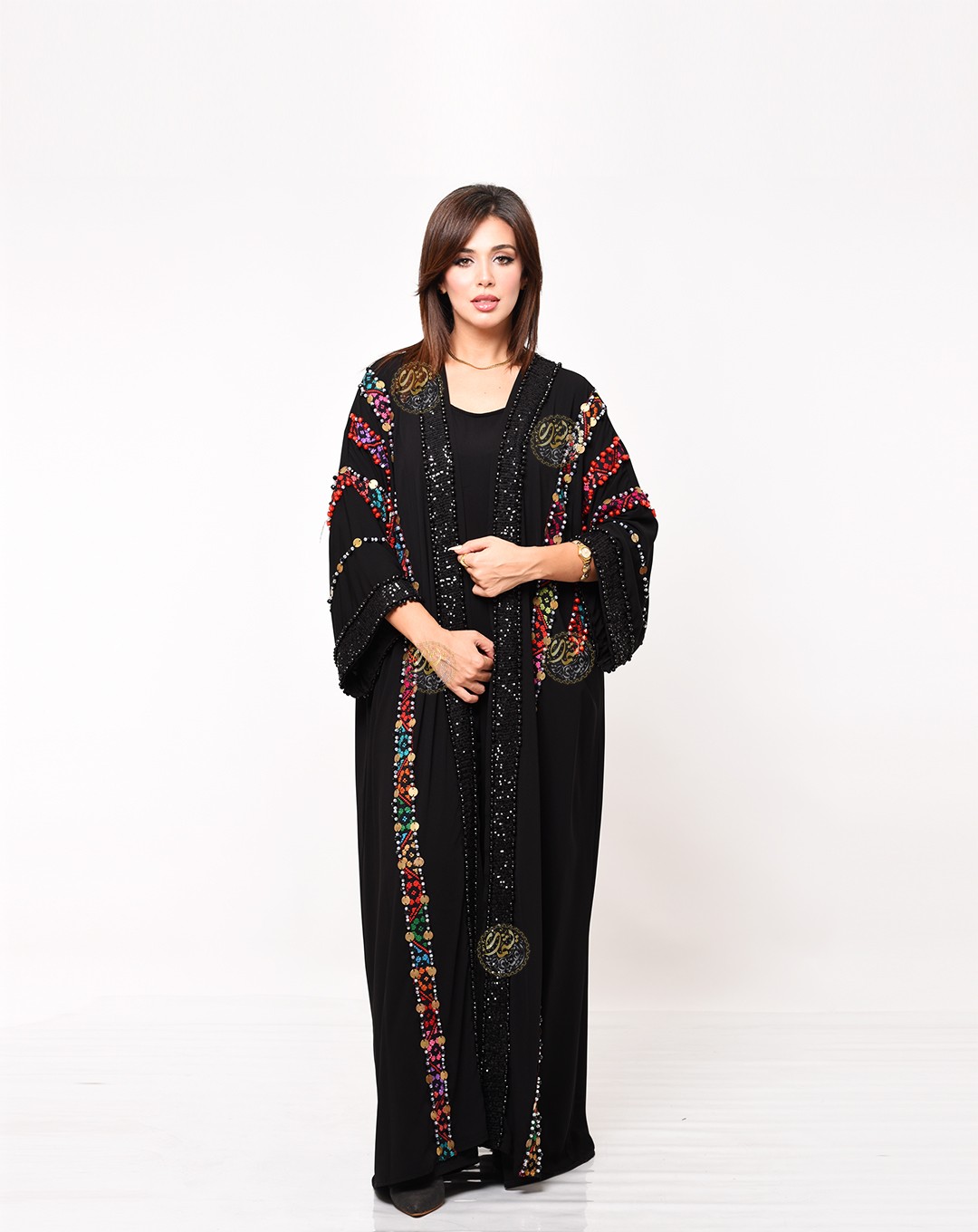 crepe fabric with multicolored sequins, hand-embroidered with etamin, colorful