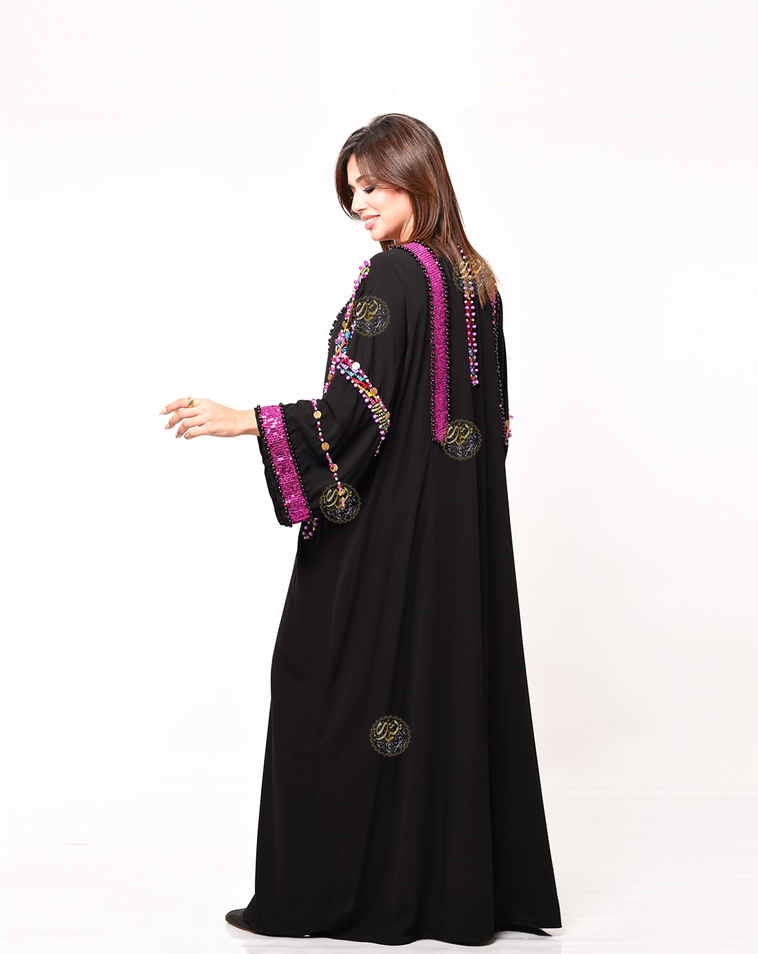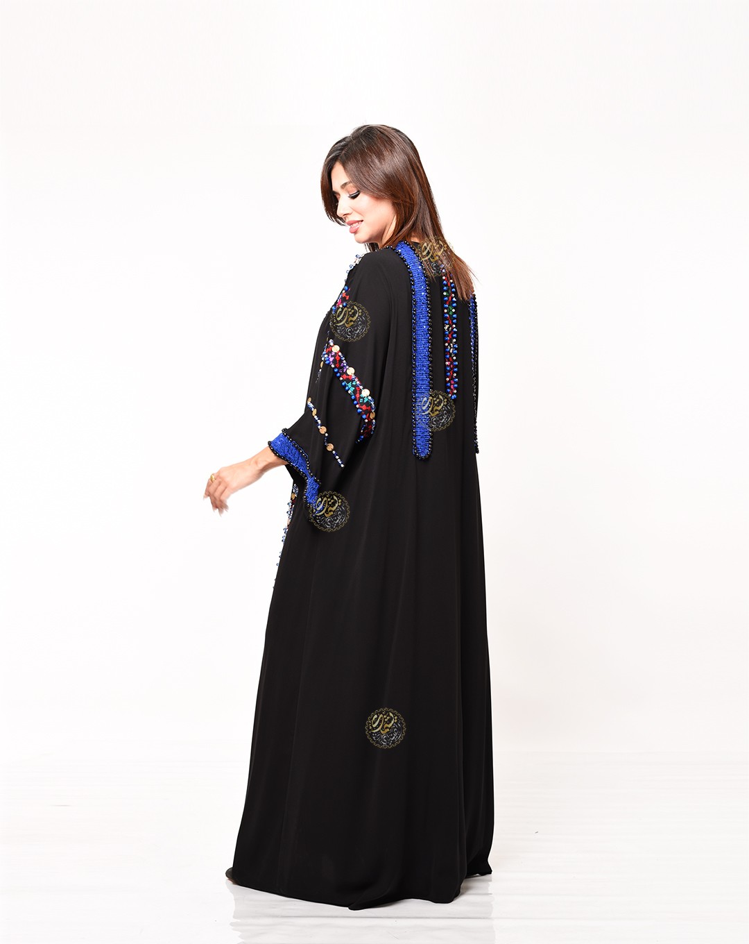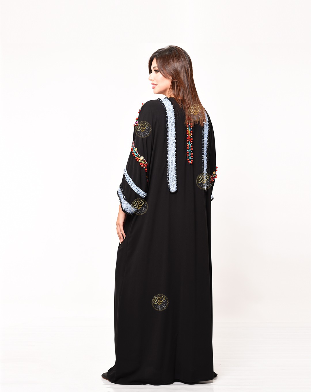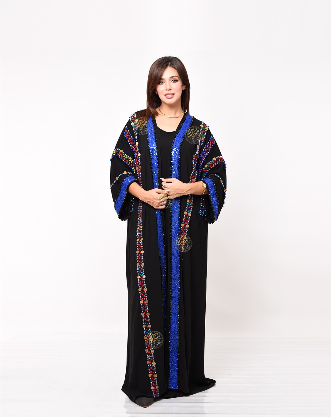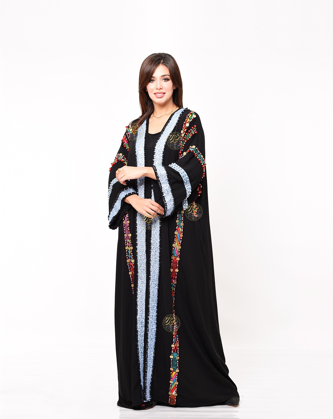crepe fabric with multicolored sequins, hand-embroidered with etamin, colorful
