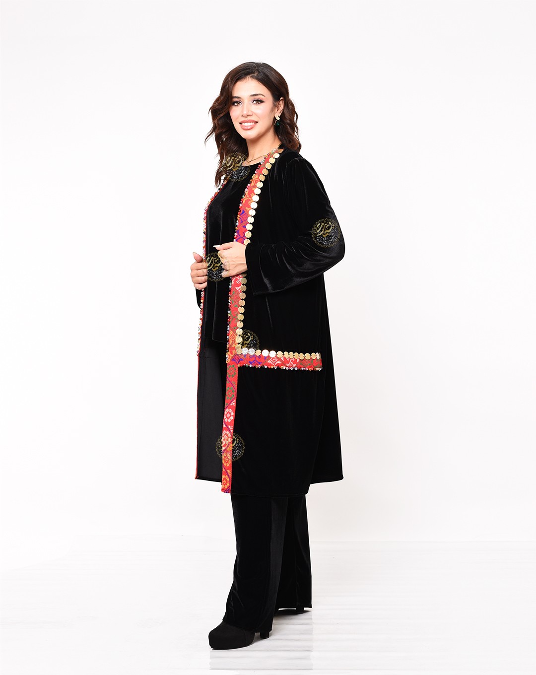 deep black Korean velvet, adorned with red handmade Itamin details and