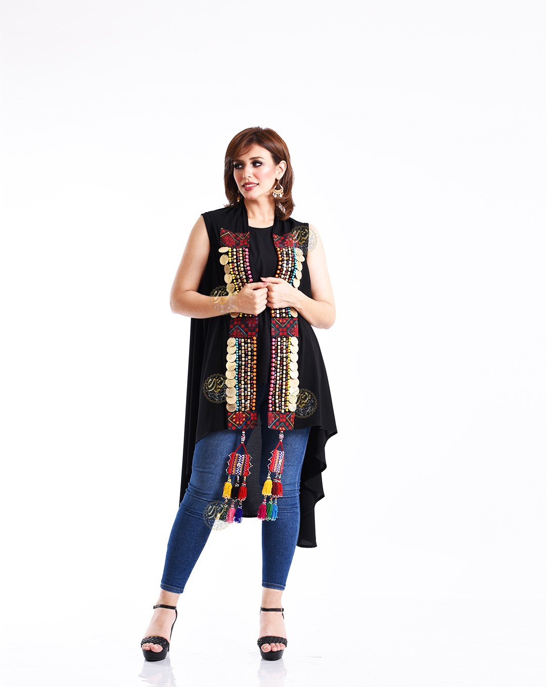 embroidered with copper, coins, and colorful Bedouin beads, complemented by
