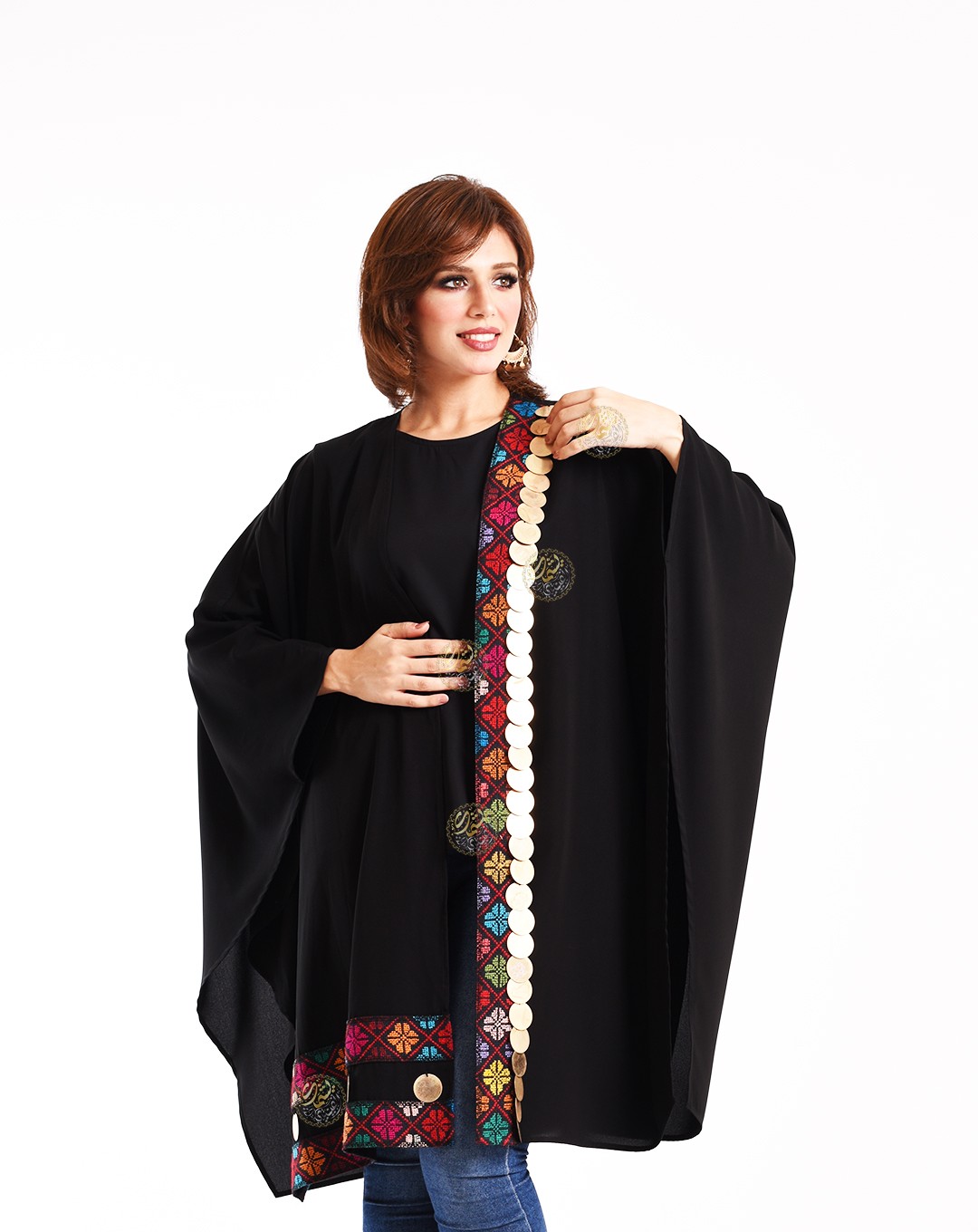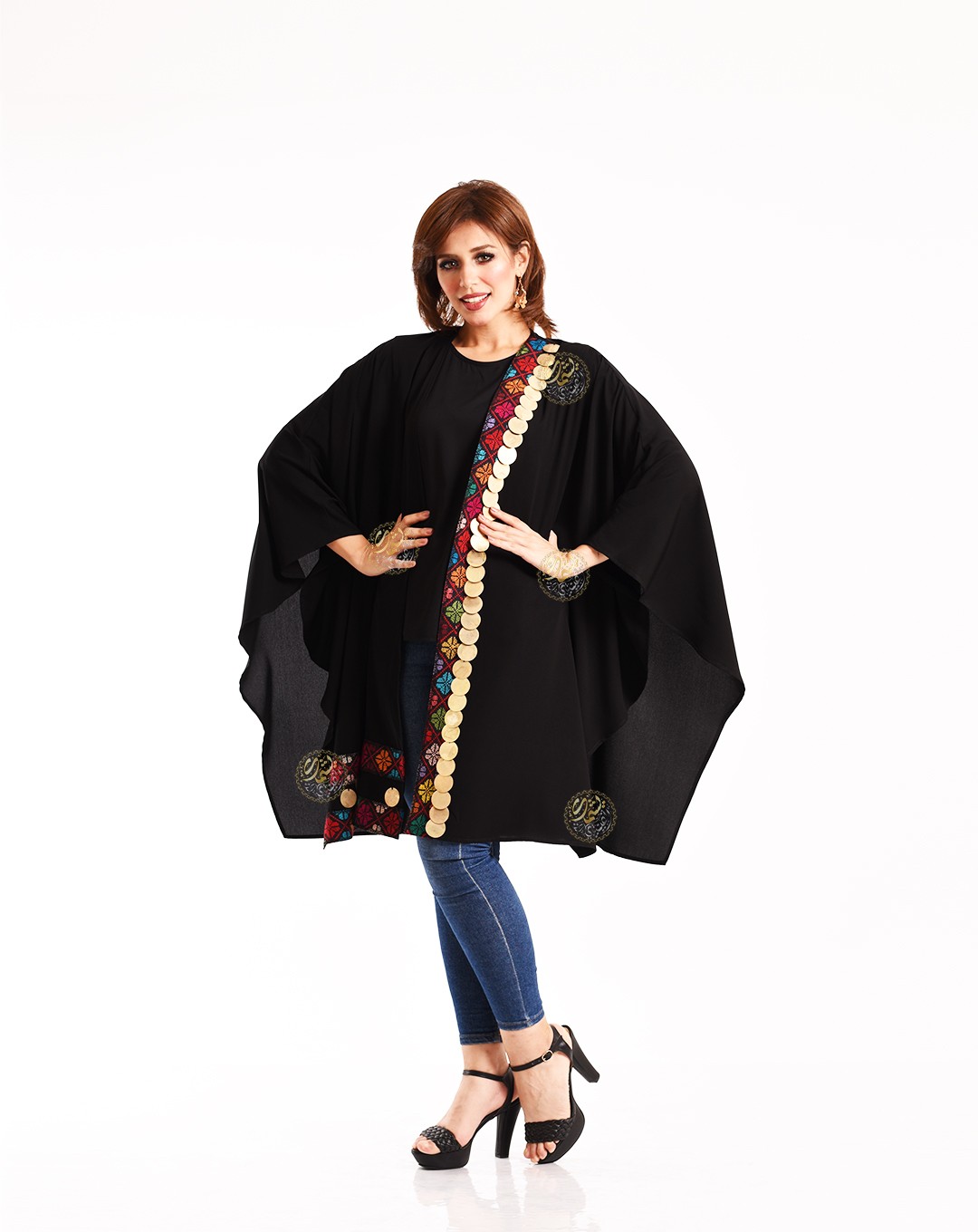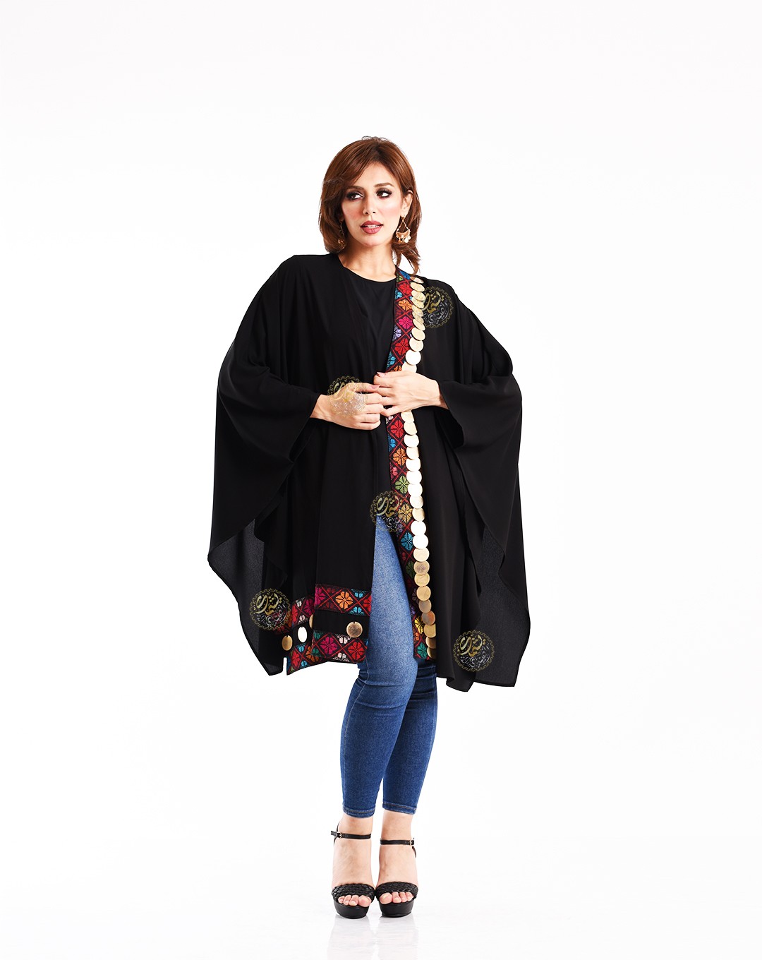 A modern and youthful cardigan made from luxurious royal crepe fabric, adorned with handmade etamin accents and embroidered with copper coins for a unique touch. Its flowing design fits all body types, available in one size (Free Size).