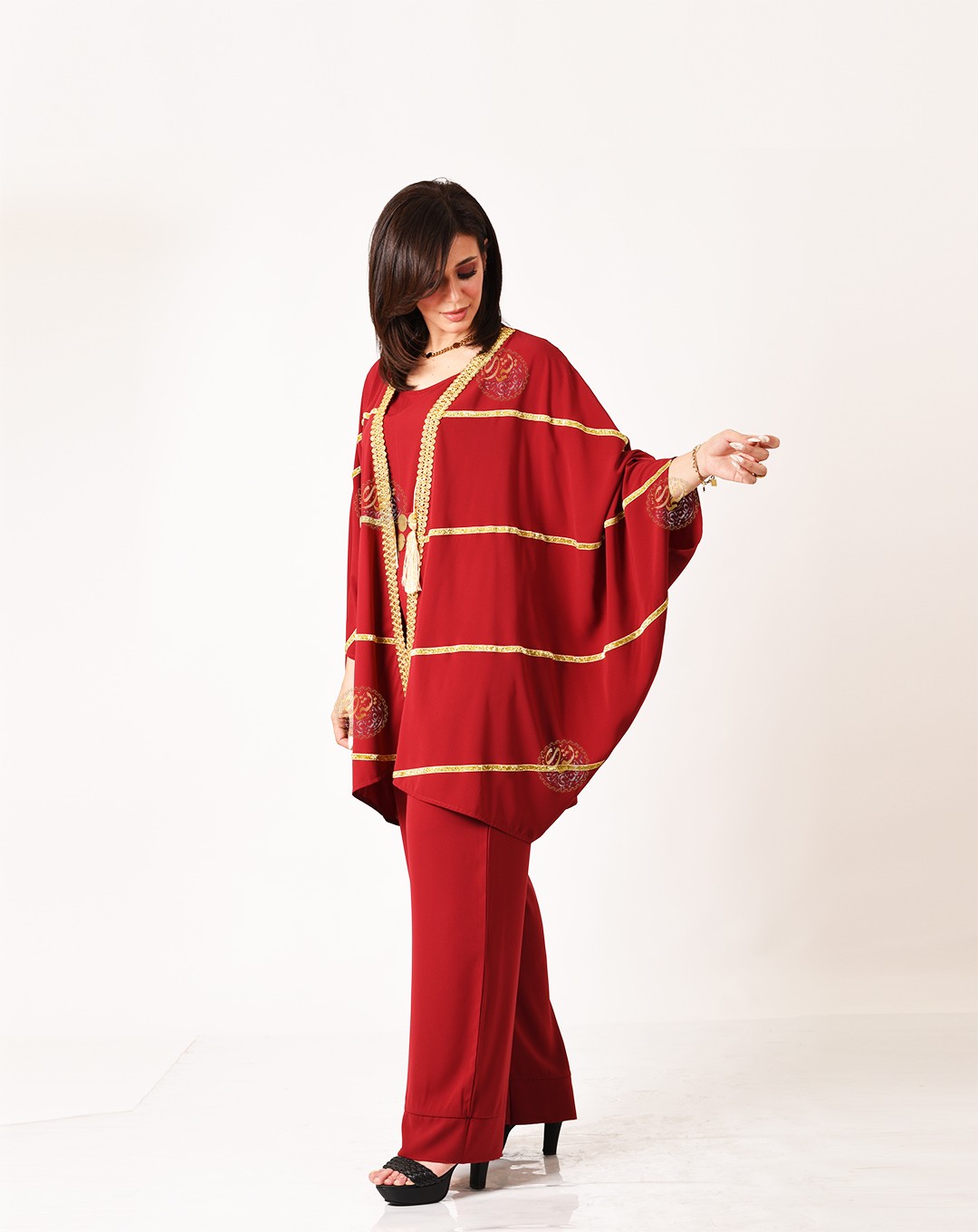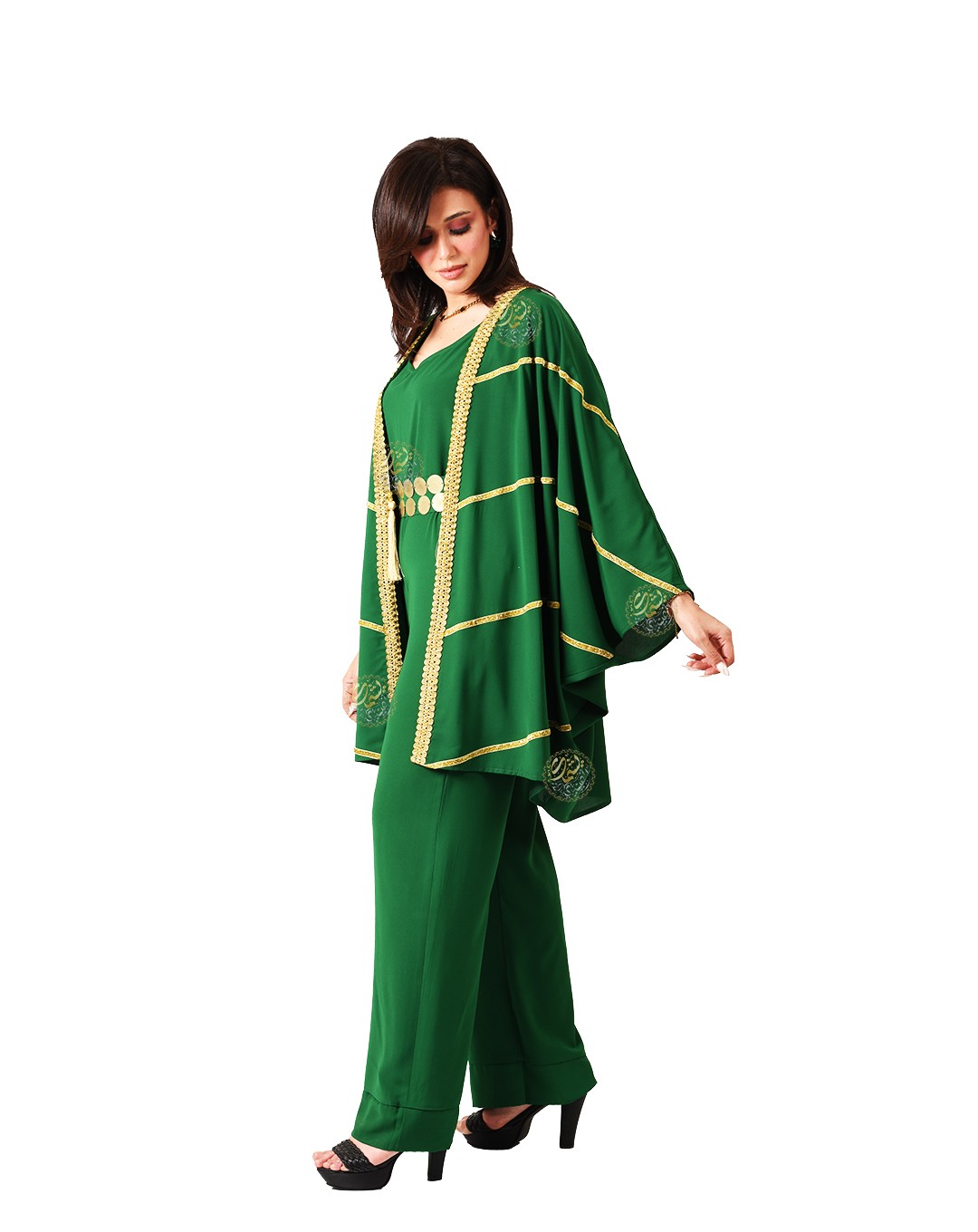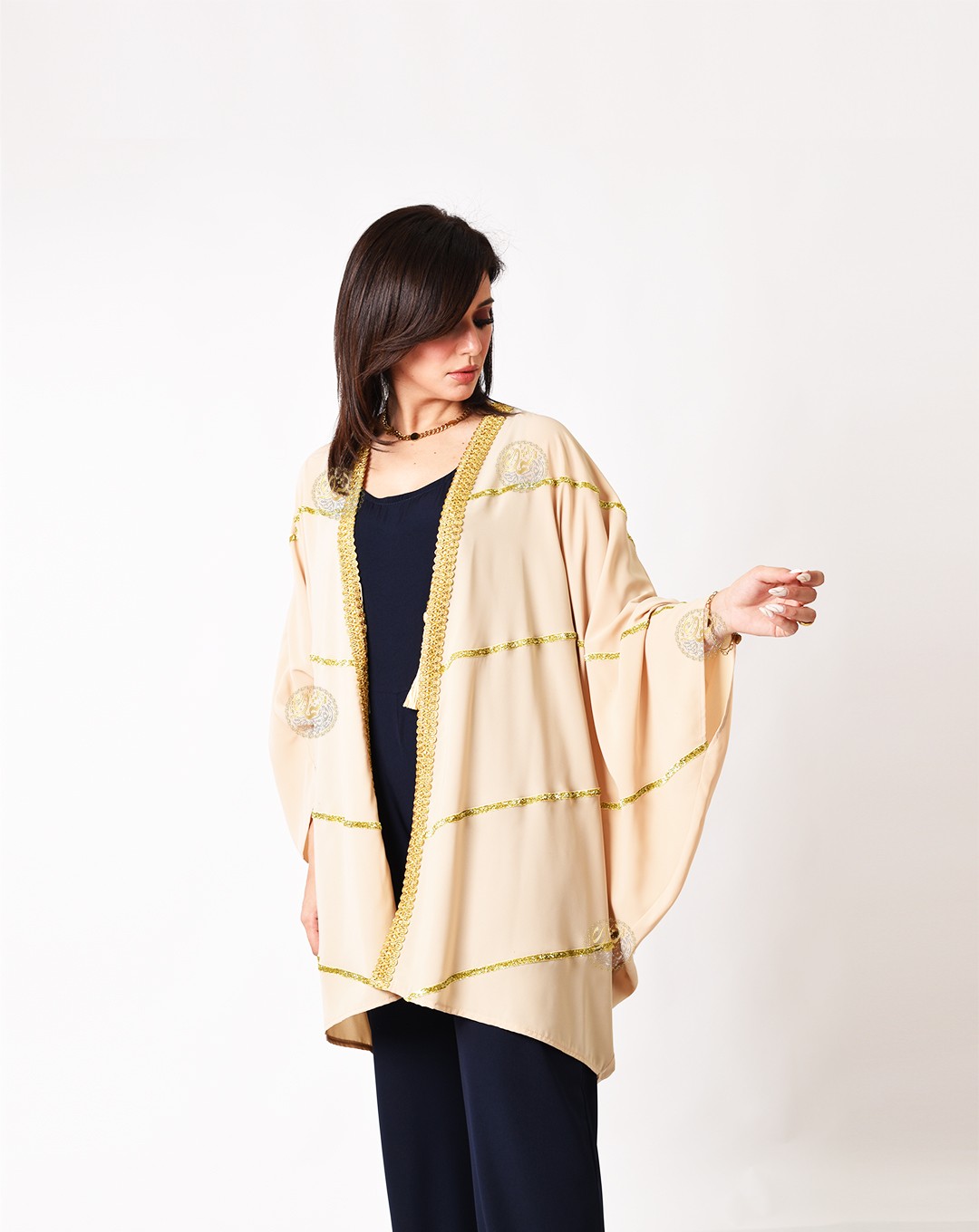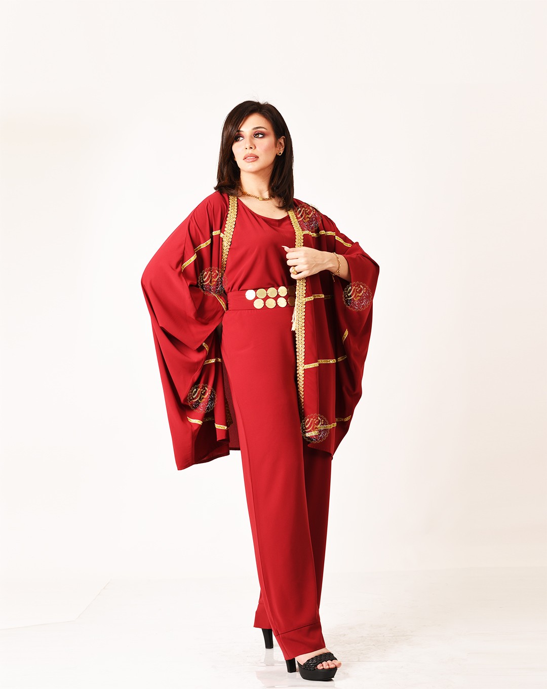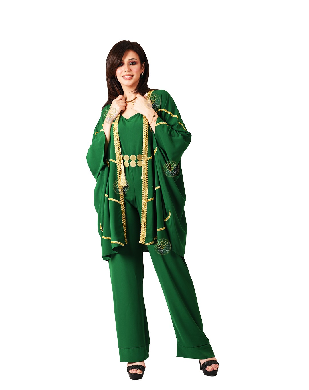 A three-piece set made from luxurious royal crepe fabric (jumpsuit + belt + 90 cm cardigan), adorned with elegant accents of golden serma threads, adding a touch of sophistication. Available in one size (Free Size) to fit all body types.