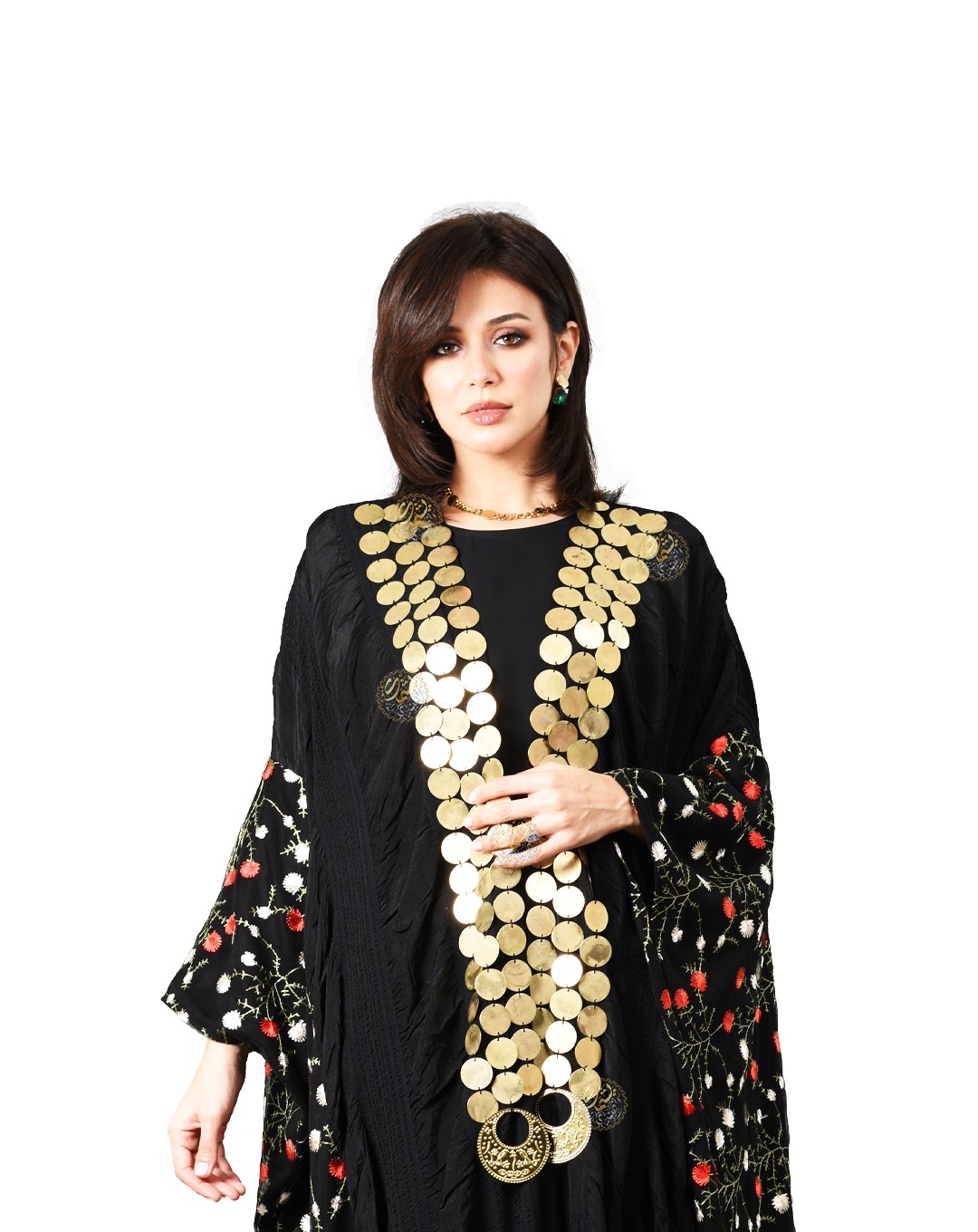 roses, and adorned with copper coins and gypsy earrings. The design is
