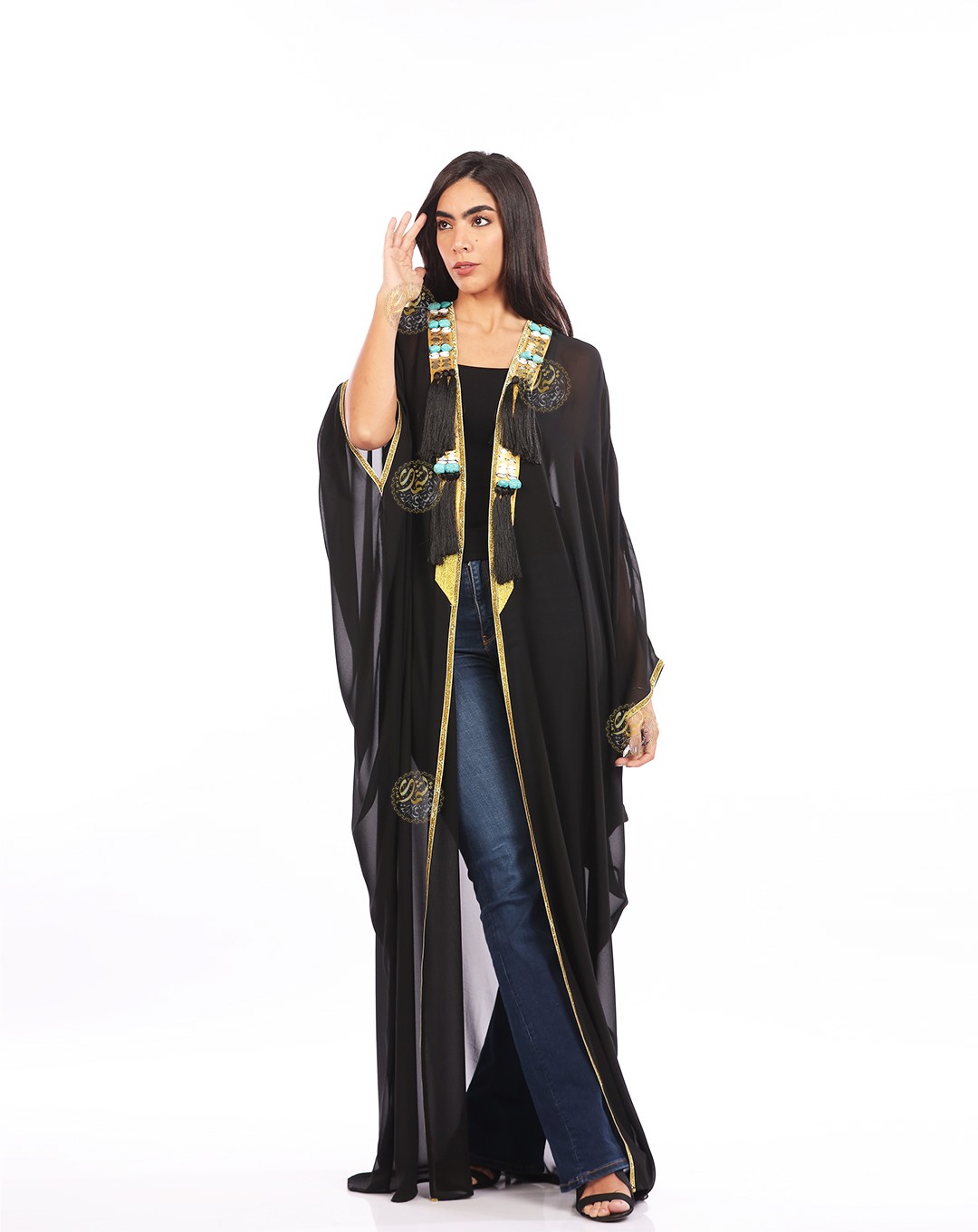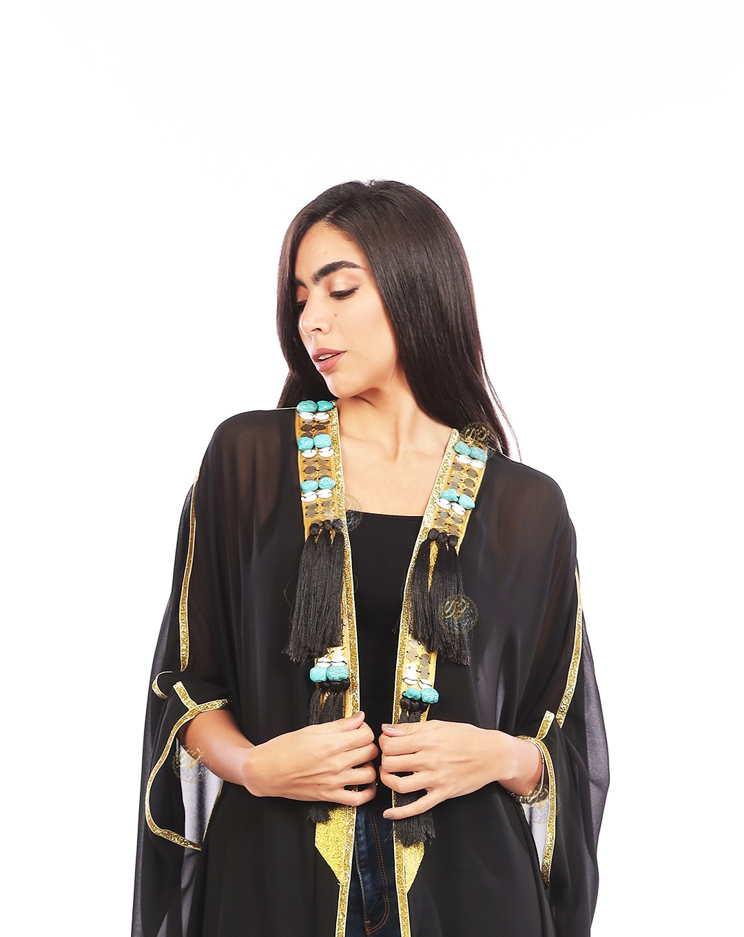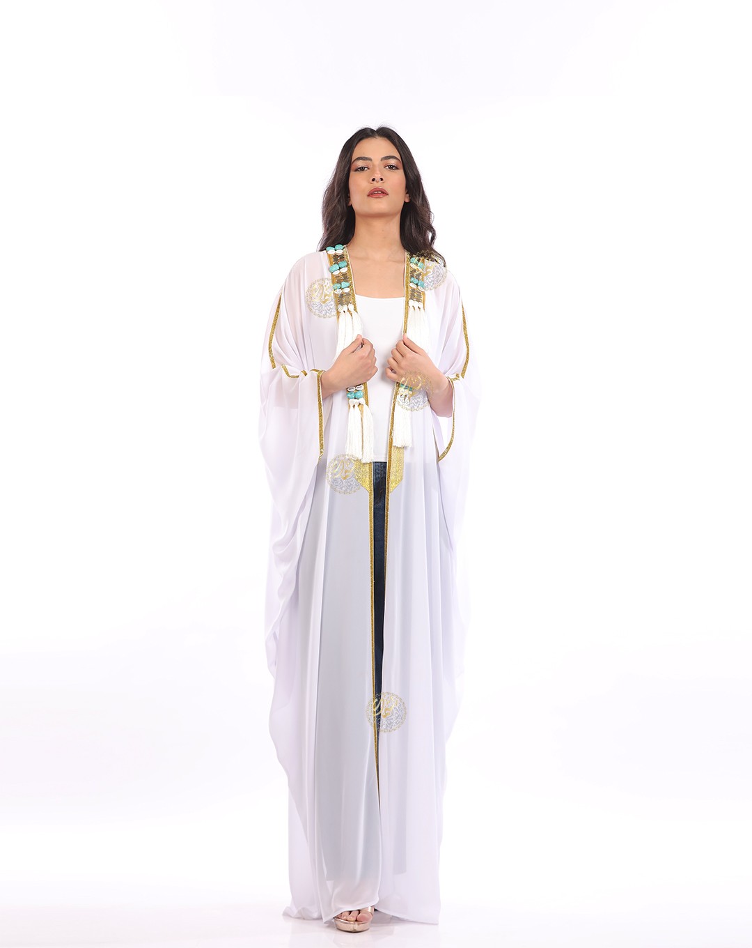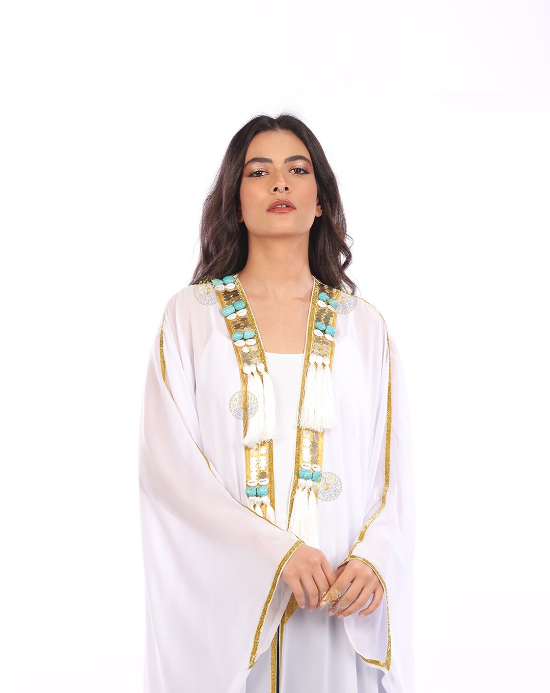 with golden sirma threads, embroidered with white pearls, turquoise stones, and