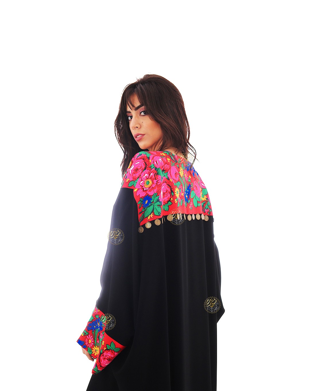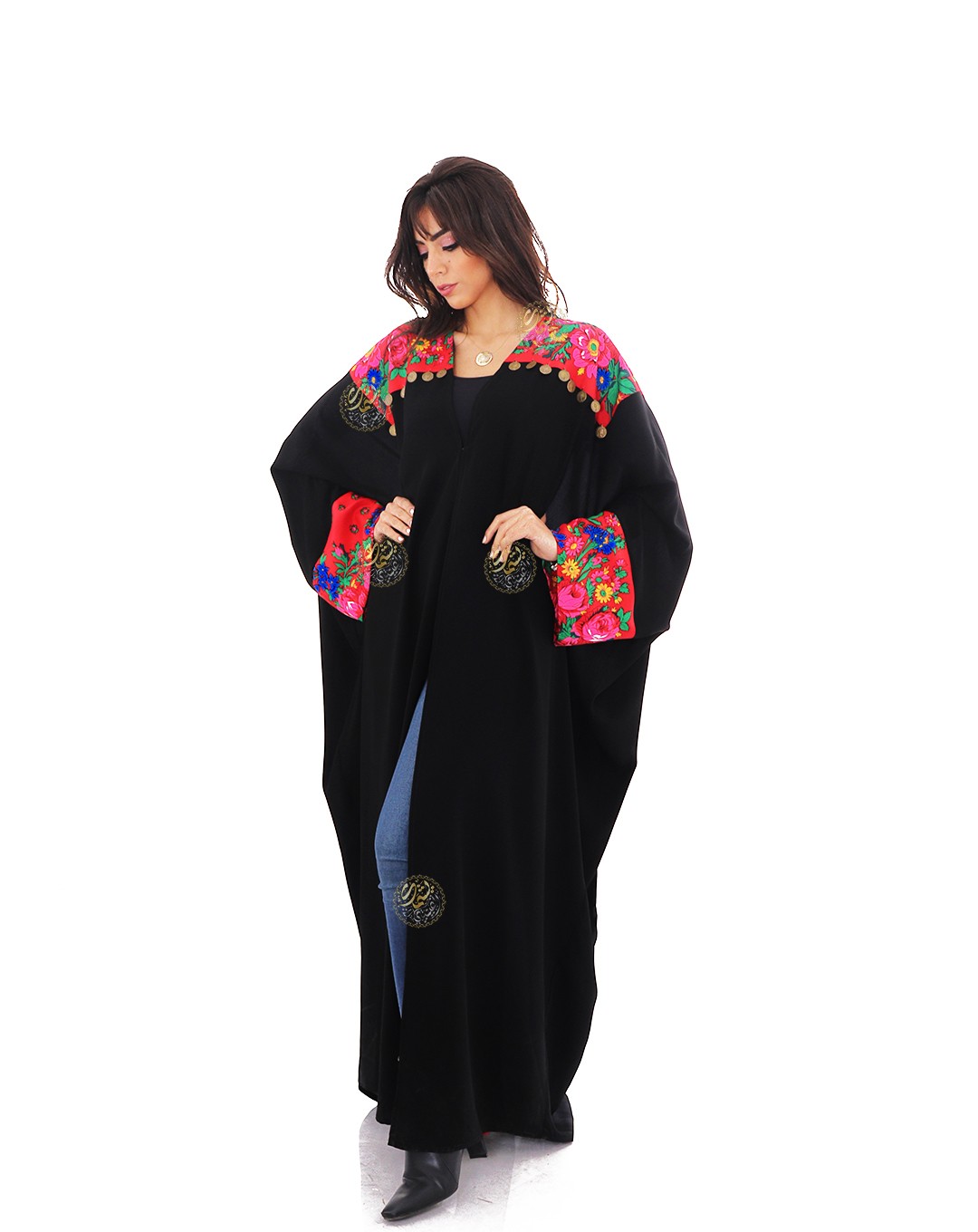 A luxurious royal crepe kaftan, adorned with bright-colored pink scarves and hand-embroidered with copper coins. It features a unique design that suits all tastes. Available in a one-size-fits-all (free size) to fit all body types.