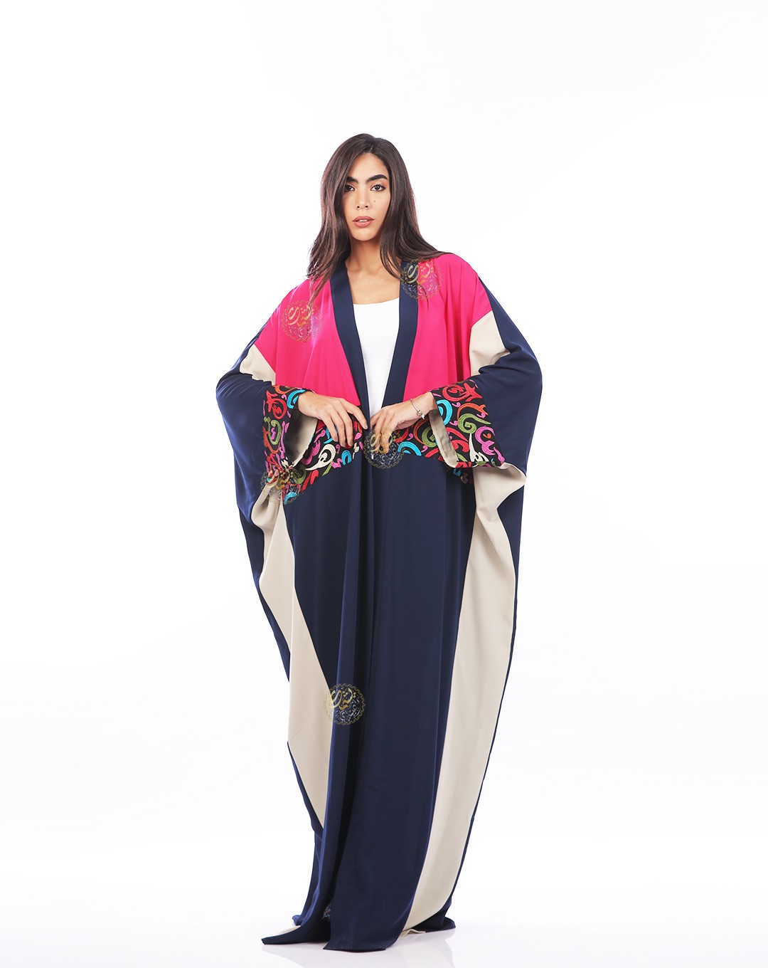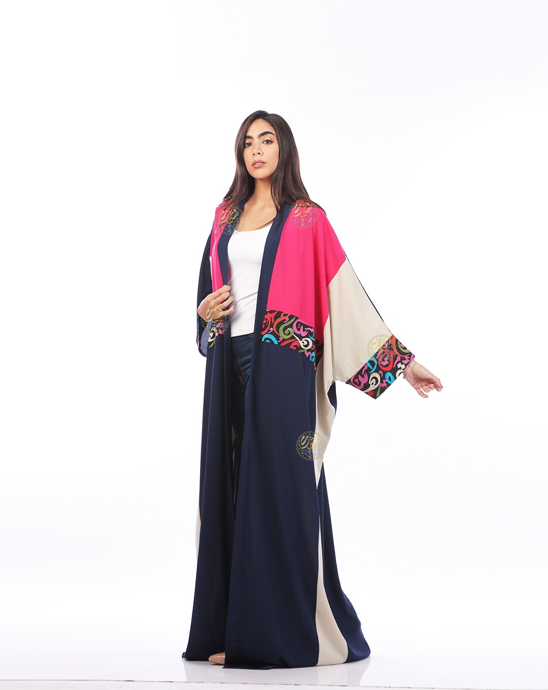 A luxurious royal crepe kaftan, featuring a blend of distinctive colors, adorned with oriental fabric and an embossed stitch in the unique Kufic script design. Available in a one-size-fits-all (free size) to suit all body types.