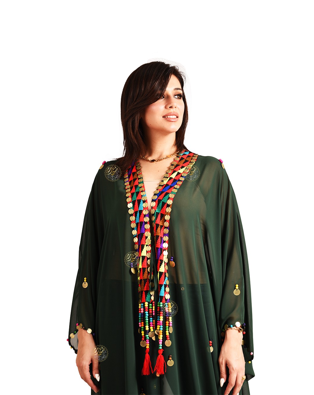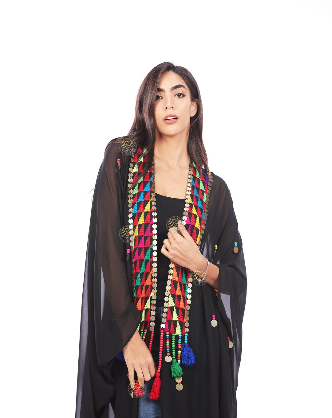 and embellished with copper coins and colorful Bedouin beads. Available in a