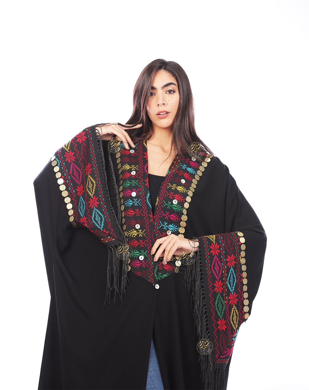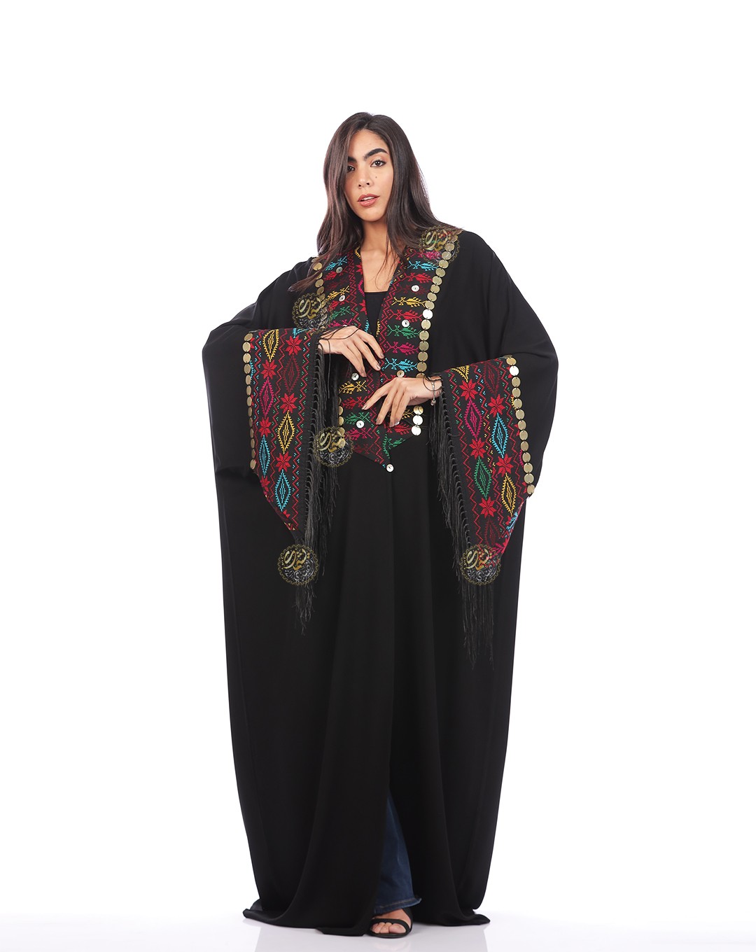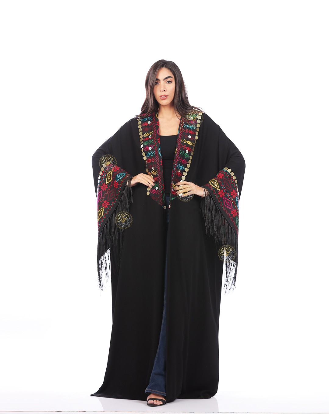 One of the most important and beautiful designs, this very elegant caftan is inspired by authentic Bedouin style. Made from luxurious royal crepe fabric with hand-embroidered etamin, and embellished with copper coins and colorful Bedouin beads. Available in a one-size fits all.
