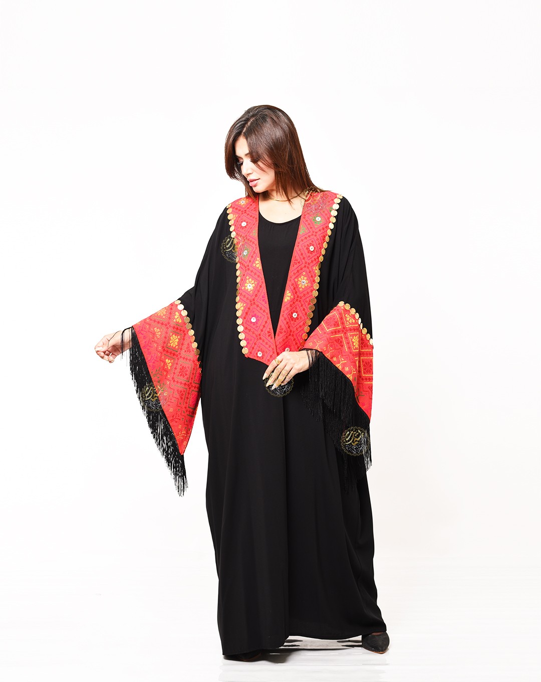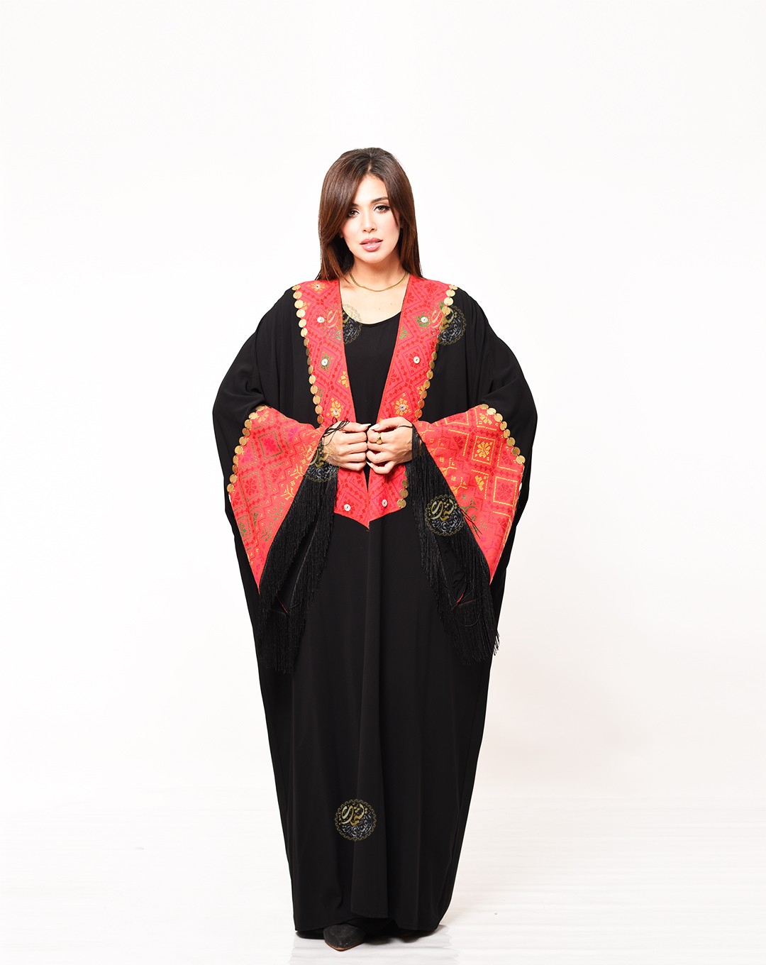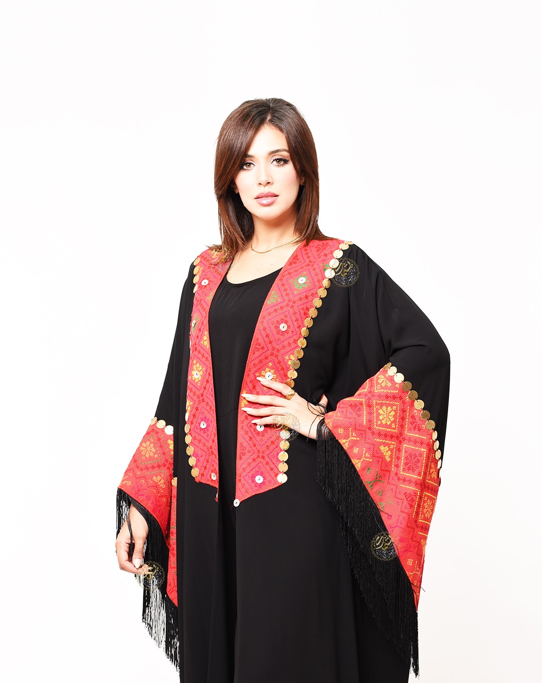 One of the most important and beautiful designs, this very elegant caftan is inspired by authentic Bedouin style. Made from luxurious royal crepe fabric with hand-embroidered etamin, and embellished with copper coins and colorful Bedouin beads. Available in a one-size fits all.