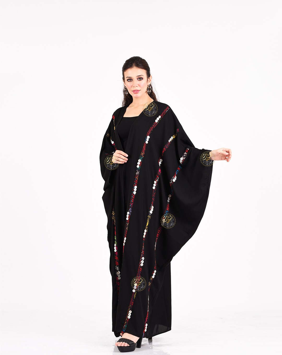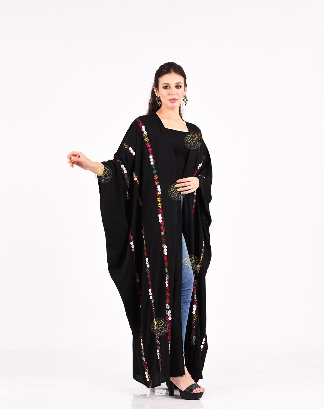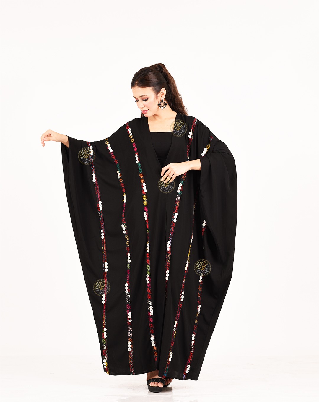 A luxurious royal crepe kaftan, hand-embroidered with handmade etamine and natural seashell beads. Available in a one-size-fits-all (free size) to suit all body types.