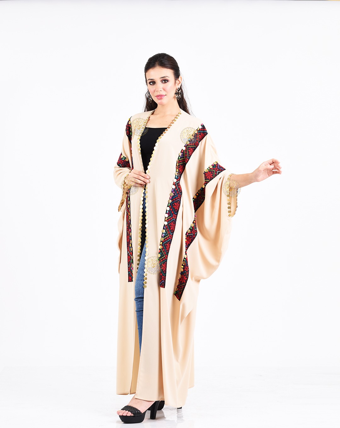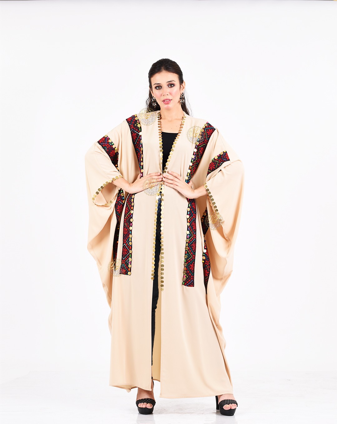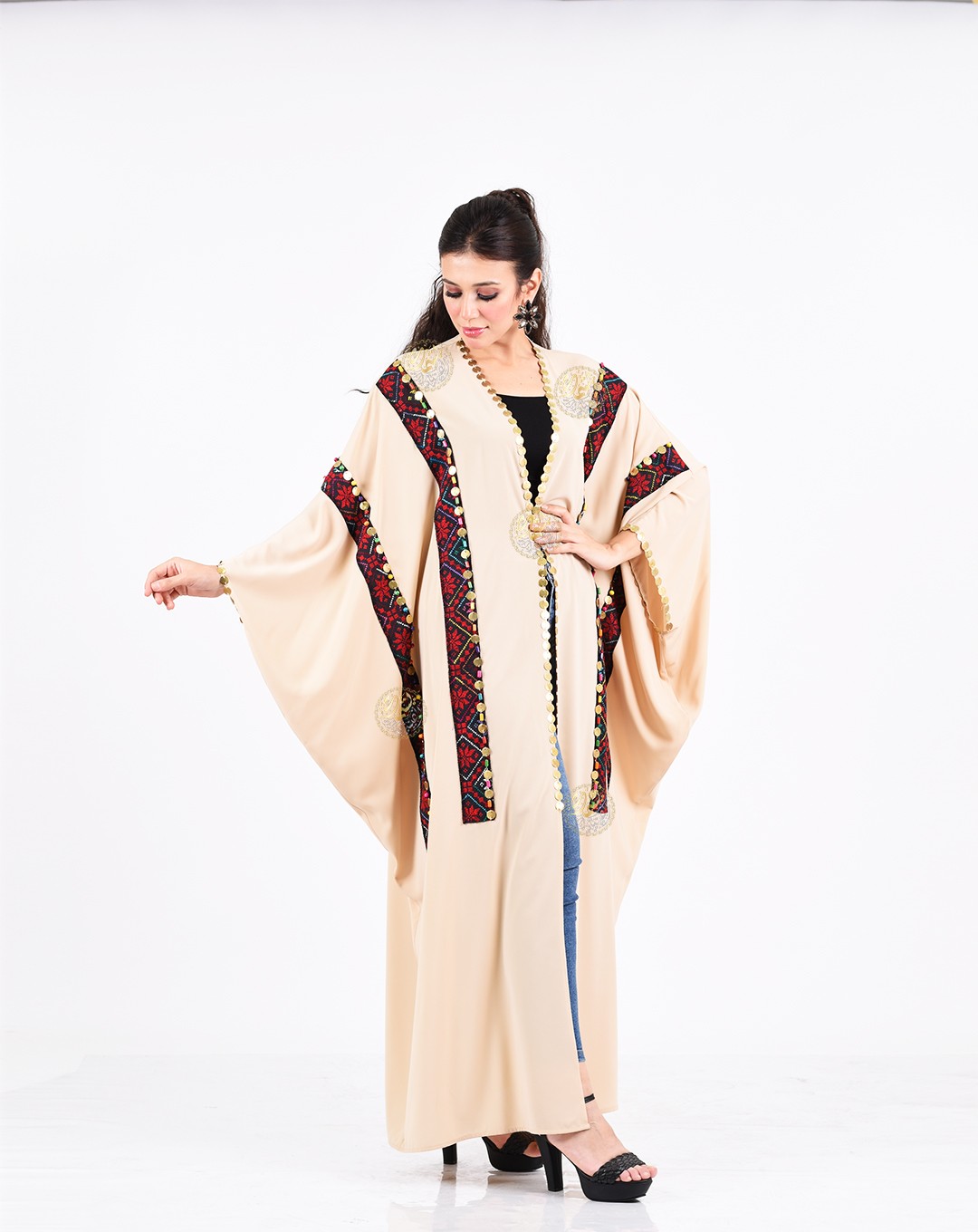 One of the most important and beautiful designs, this very elegant caftan is inspired by authentic Bedouin style. Made from luxurious royal crepe fabric with hand-embroidered etamin, and embellished with copper coins and colorful Bedouin beads. Available in a one-size fits all.