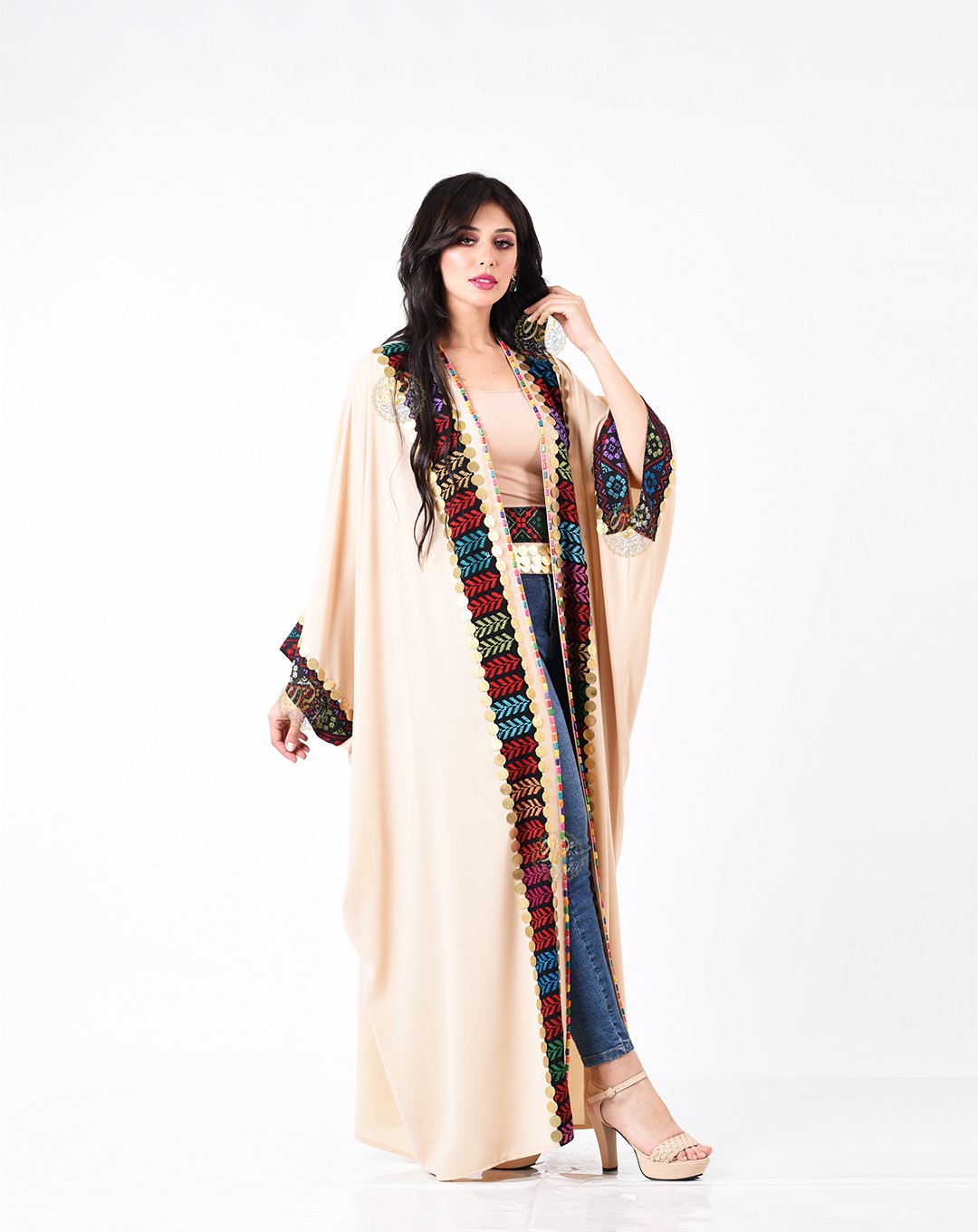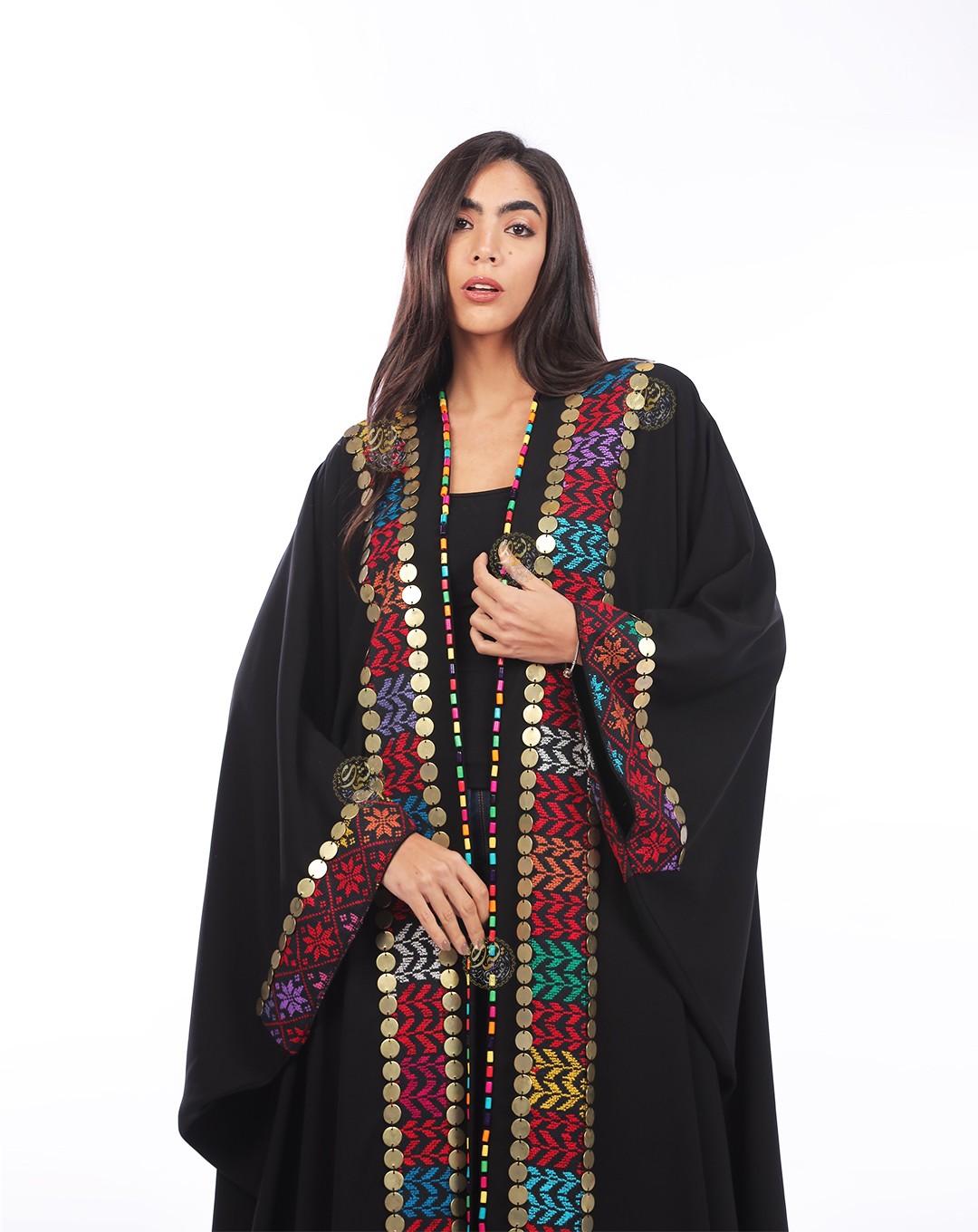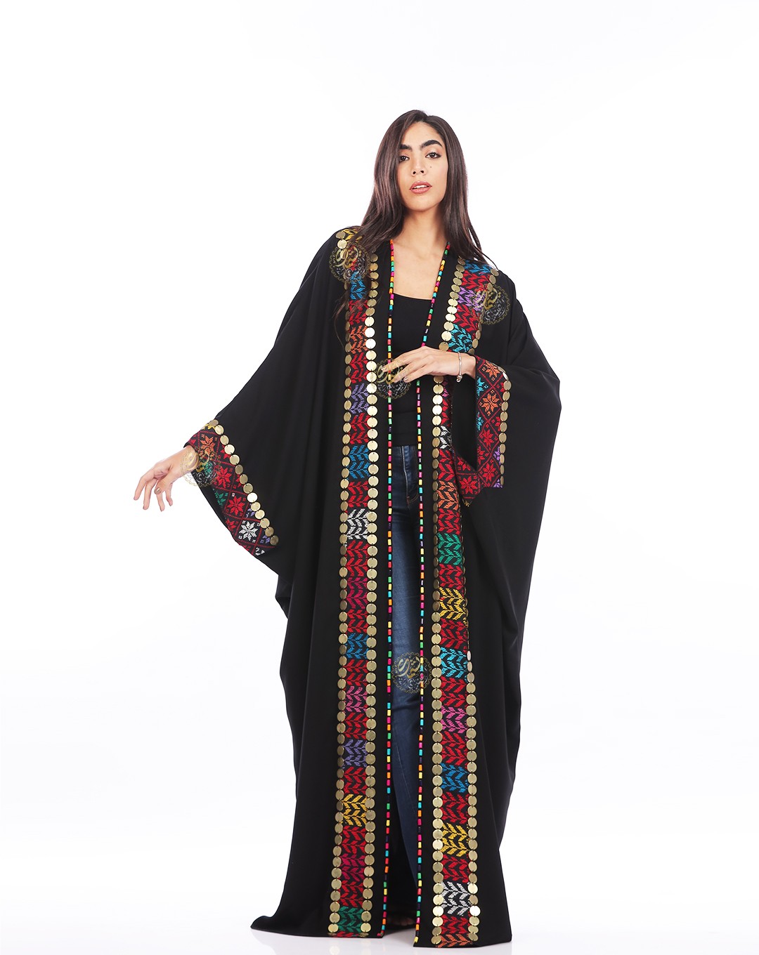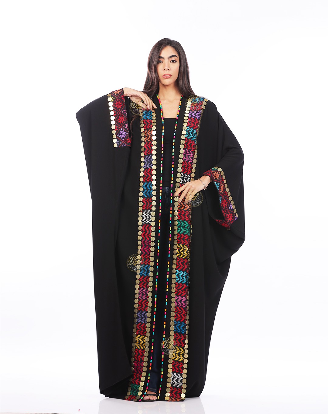 One of the most important and beautiful designs, this very elegant caftan is inspired by authentic Bedouin style. Made from luxurious royal crepe fabric with hand-embroidered etamin, and embellished with copper coins and colorful Bedouin beads. Available in a one-size fits all.