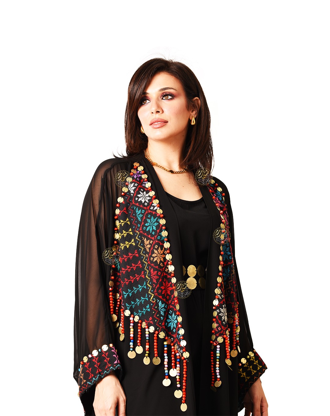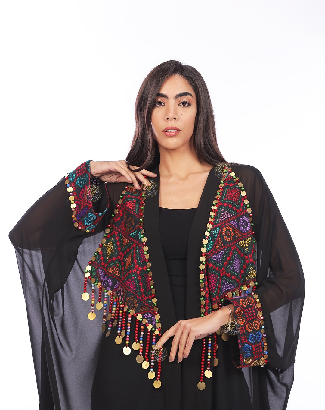 and embellished with copper coins and colorful Bedouin beads. Available in a