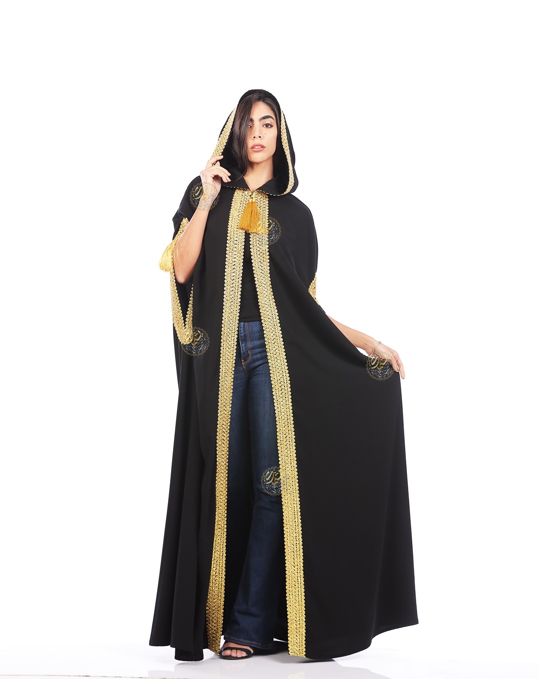 A luxurious royal crepe kaftan, inspired by Moroccan heritage, adorned with golden sirma threads. Perfect for soirées, simple occasions, and Ramadan nights. Available in a one-size-fits-all (free size) to suit all body types.