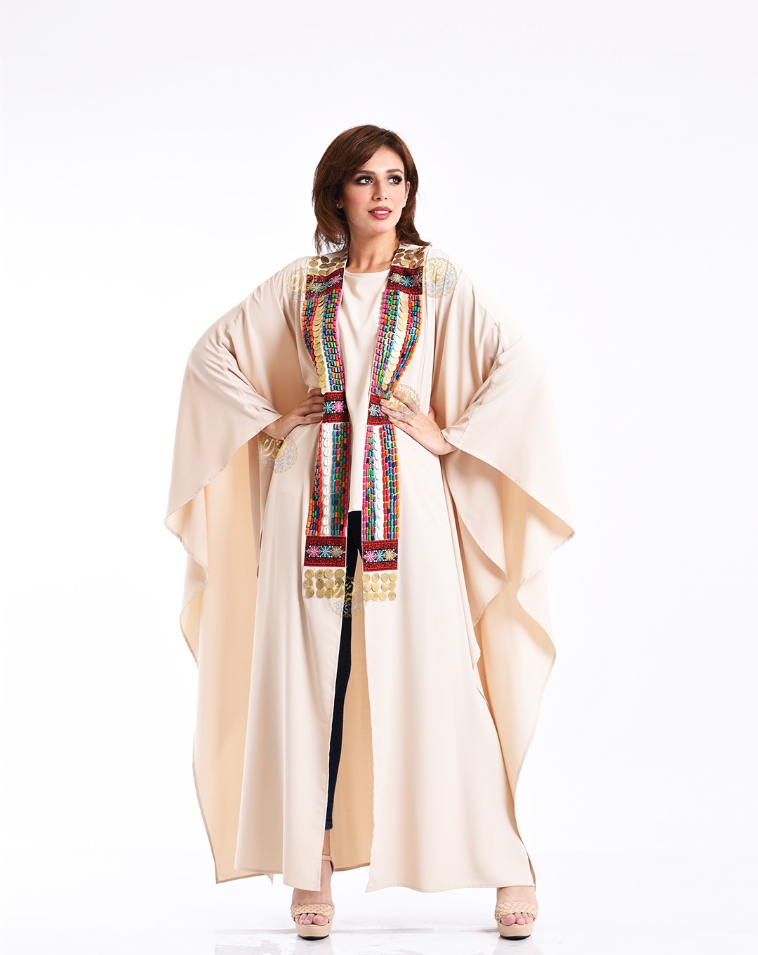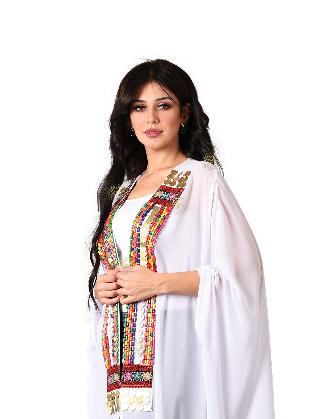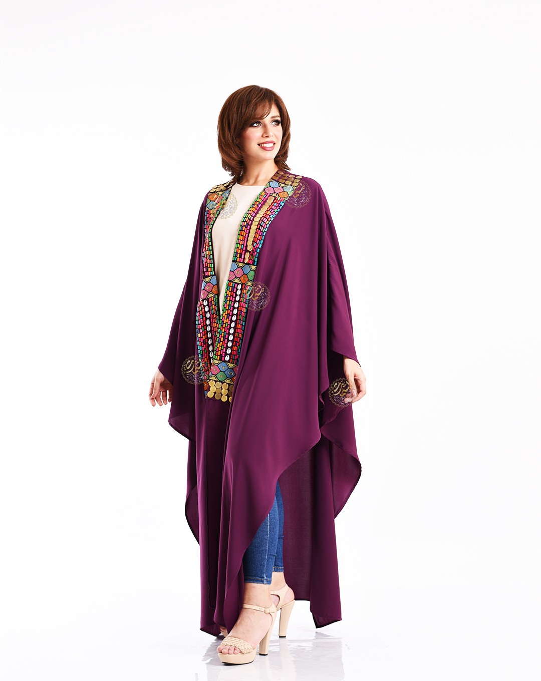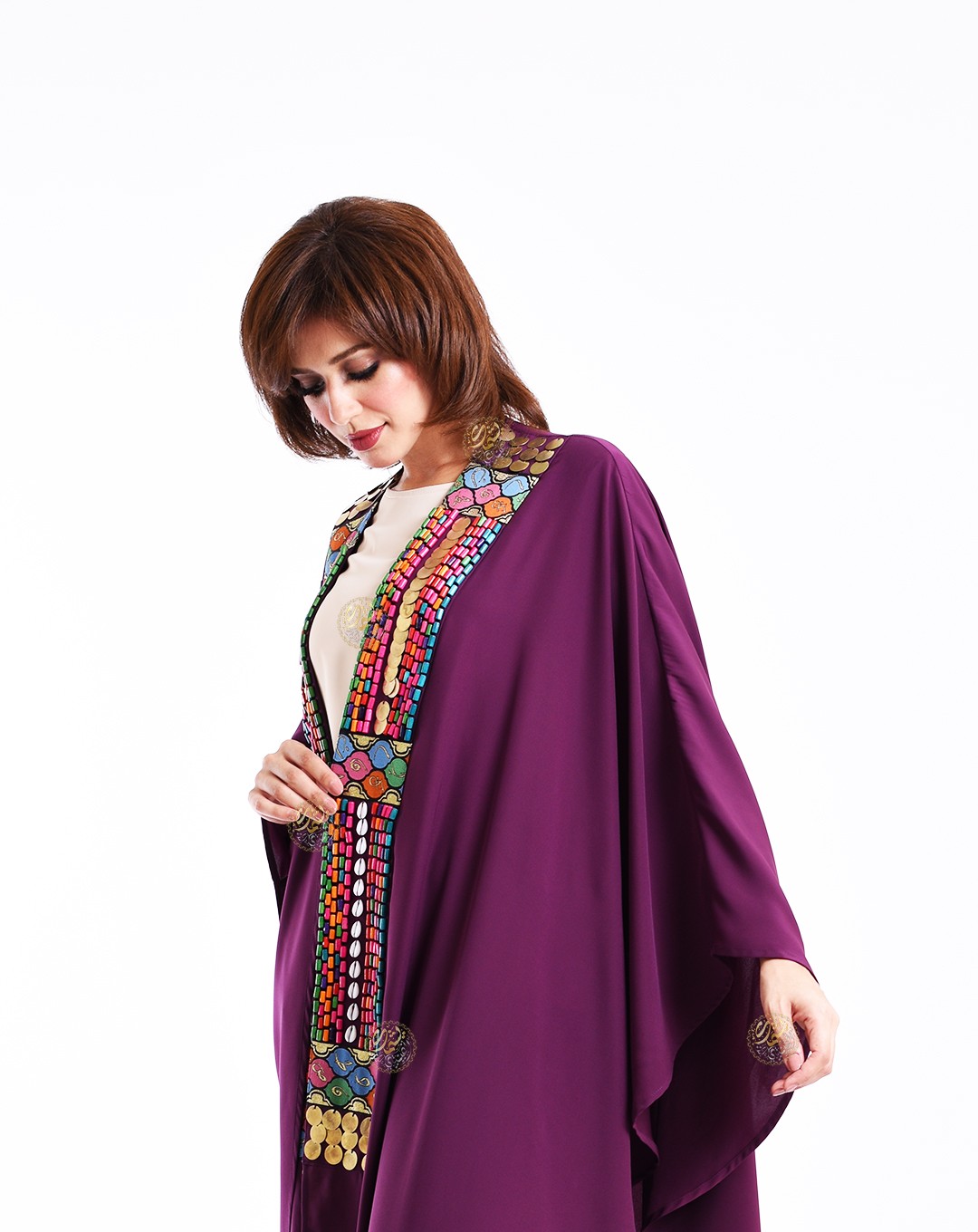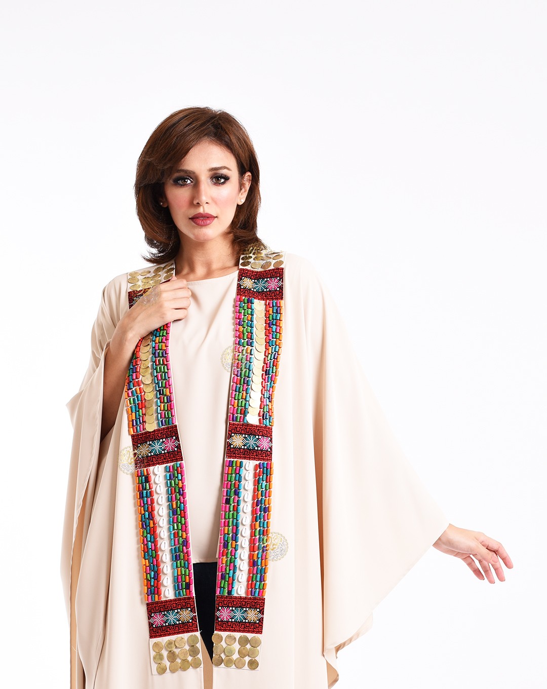 One of the most important and beautiful designs, this very elegant caftan is inspired by authentic Bedouin style. Made from luxurious royal Chiffon fabric with hand-embroidered etamin, and embellished with copper coins and colorful Bedouin beads. Available in a one-size fits all.
