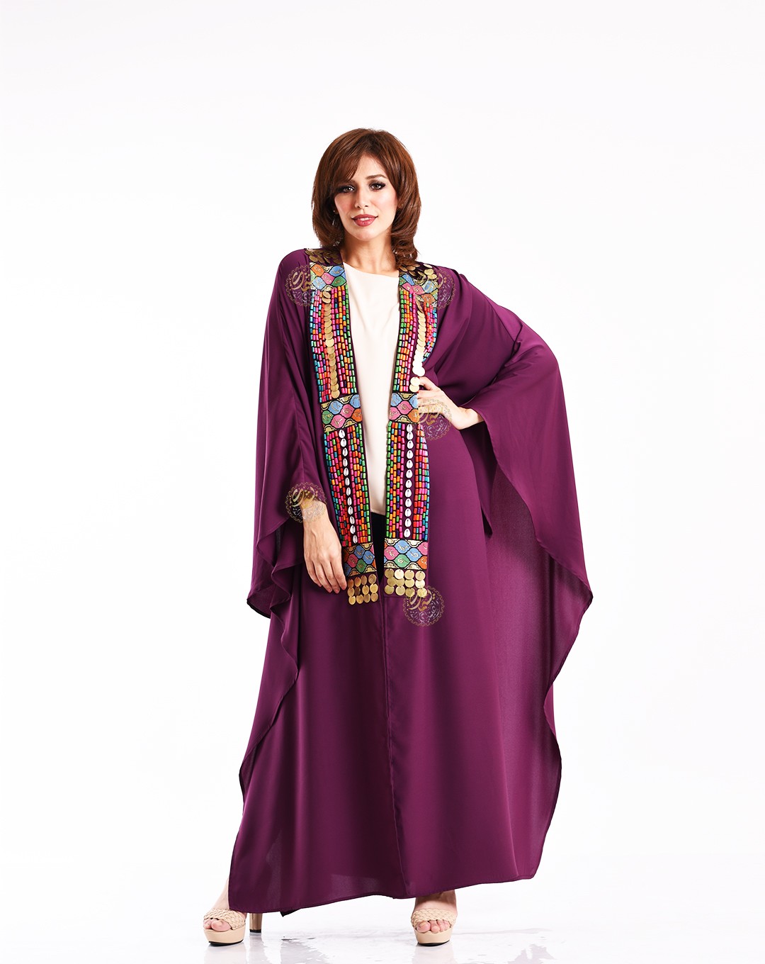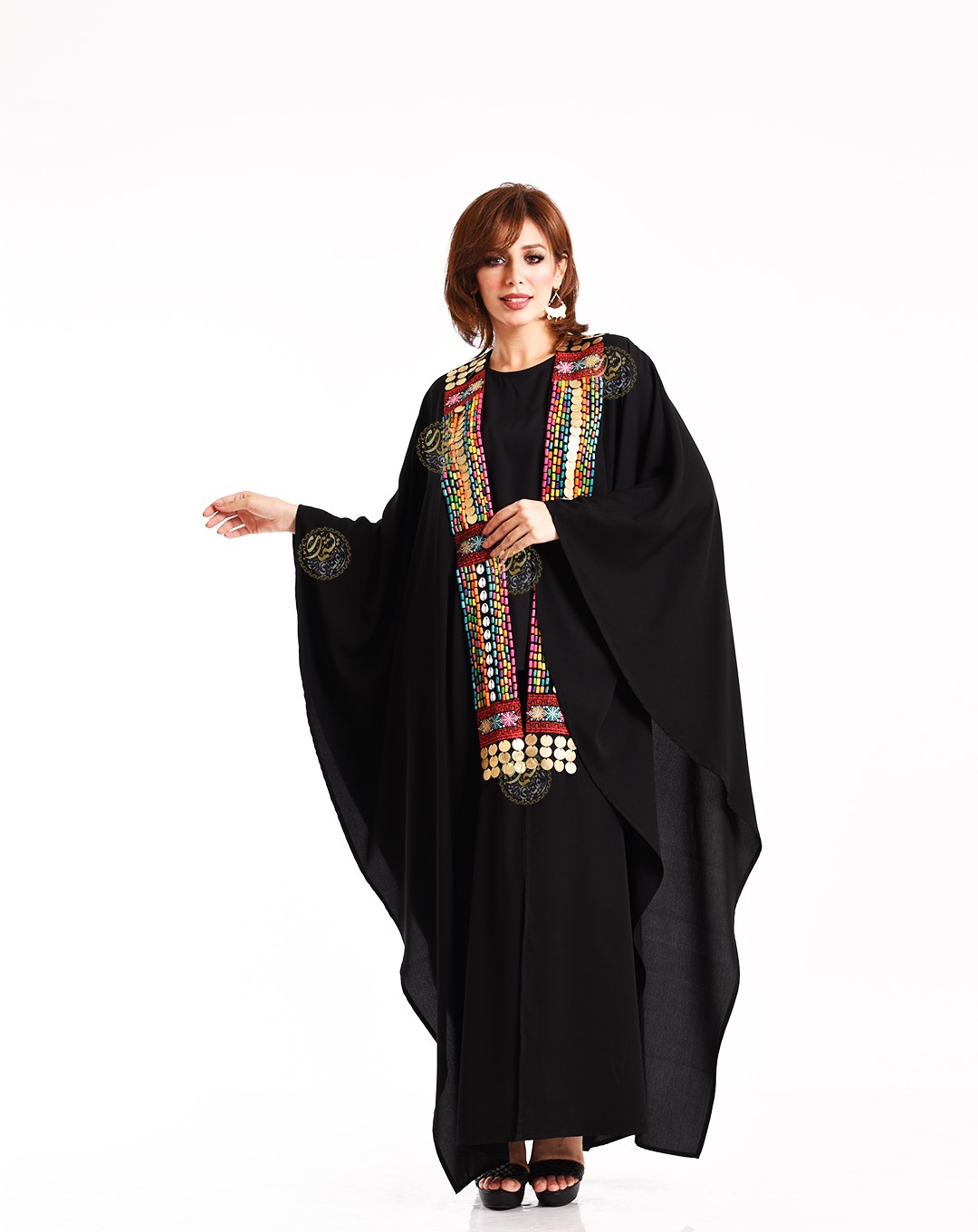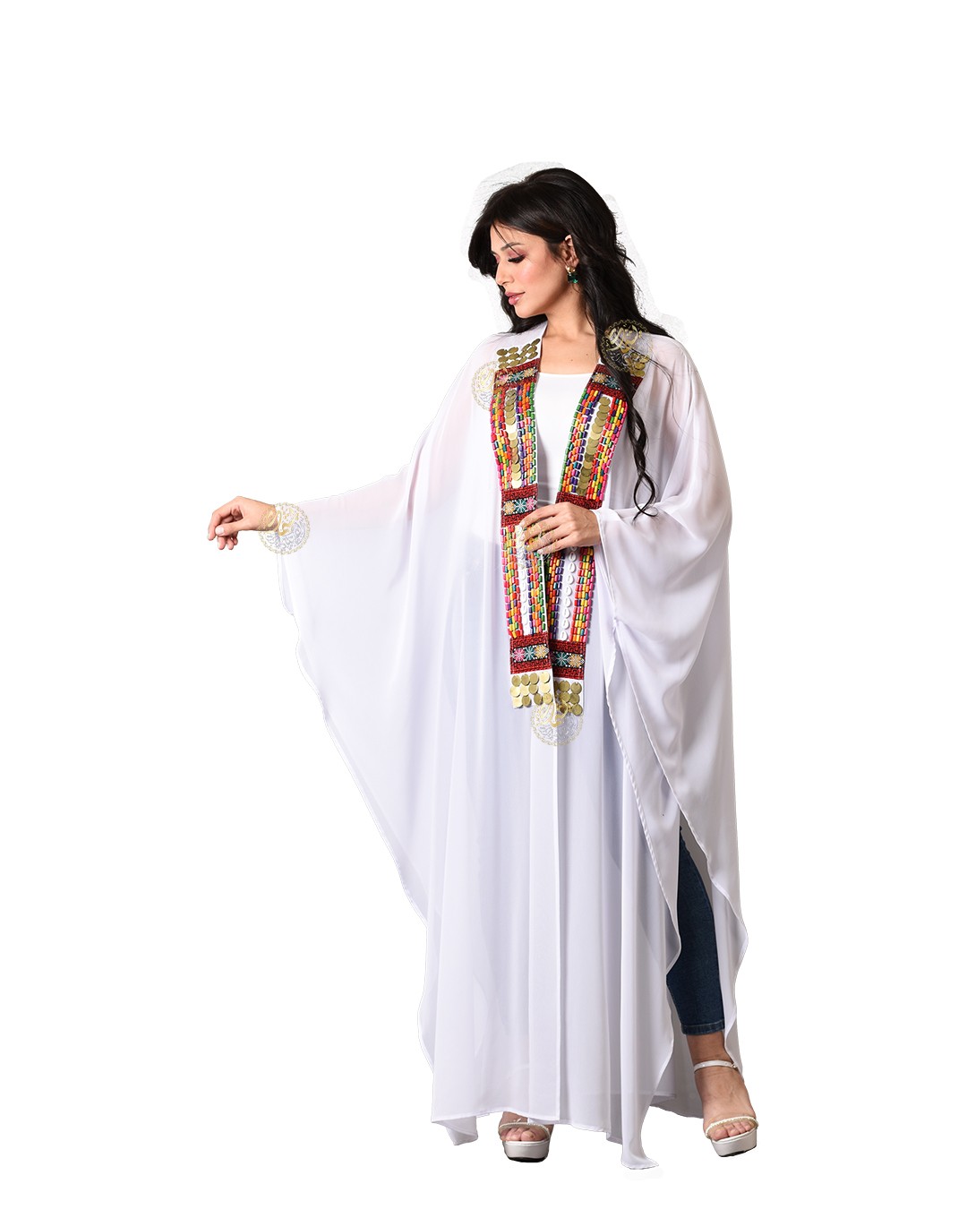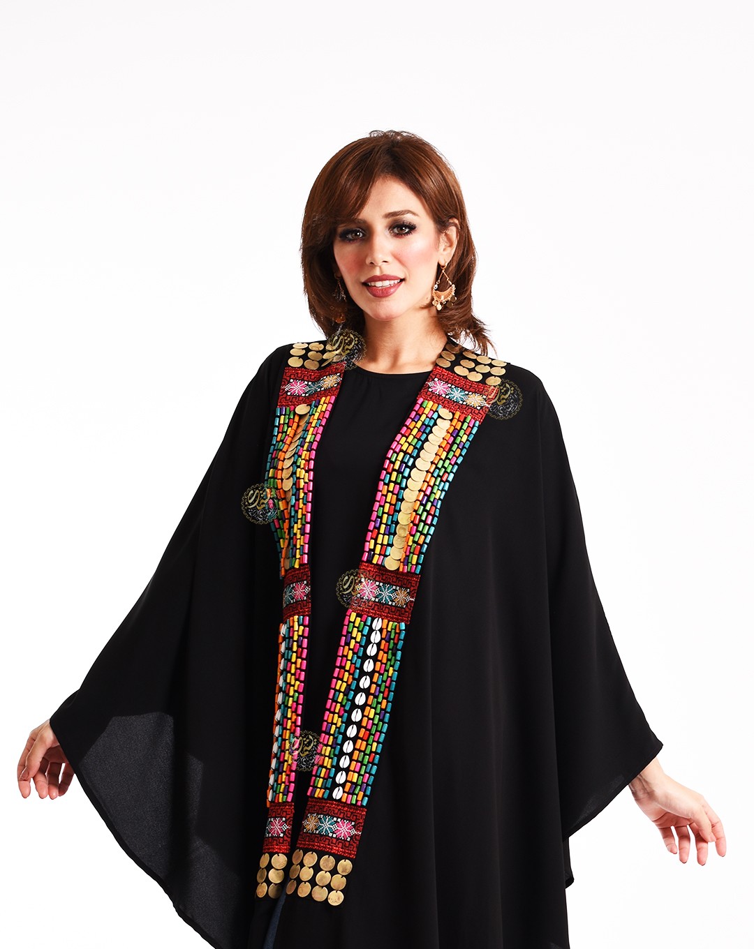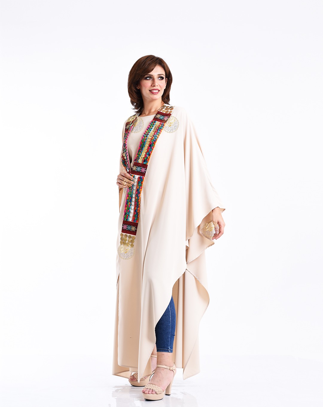 One of the most important and beautiful designs, this very elegant caftan is inspired by authentic Bedouin style. Made from luxurious royal Chiffon fabric with hand-embroidered etamin, and embellished with copper coins and colorful Bedouin beads. Available in a one-size fits all.
