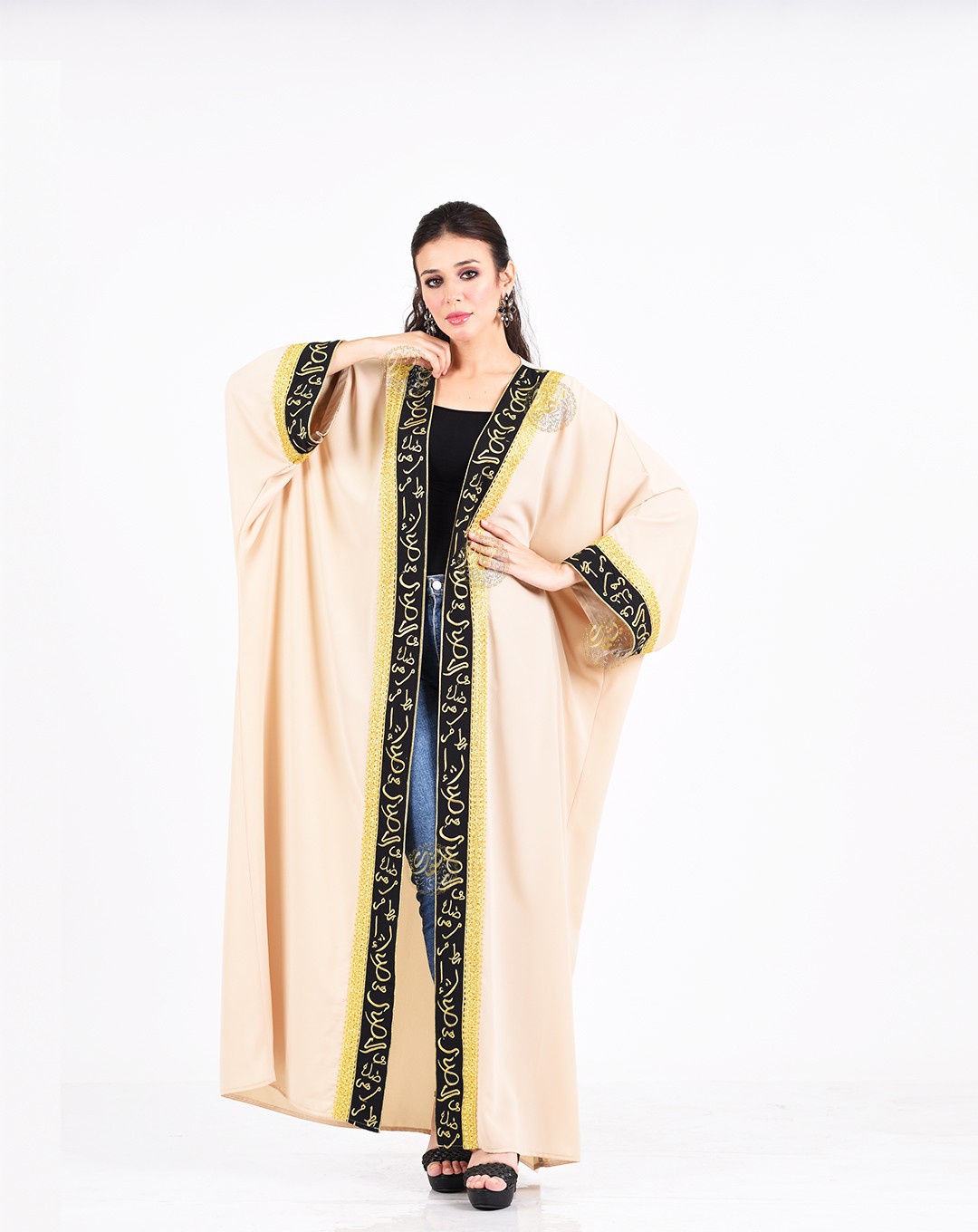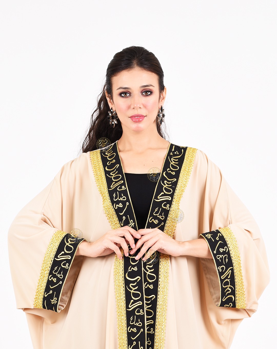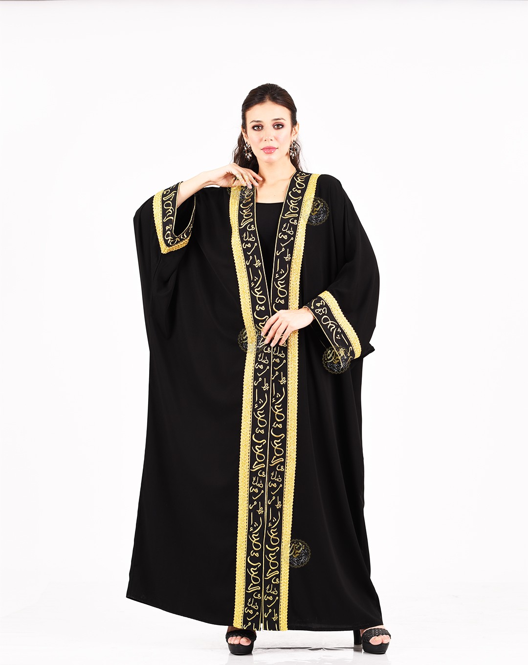 embellished with Kufic script embroidery inspired by Egyptian folk heritage,