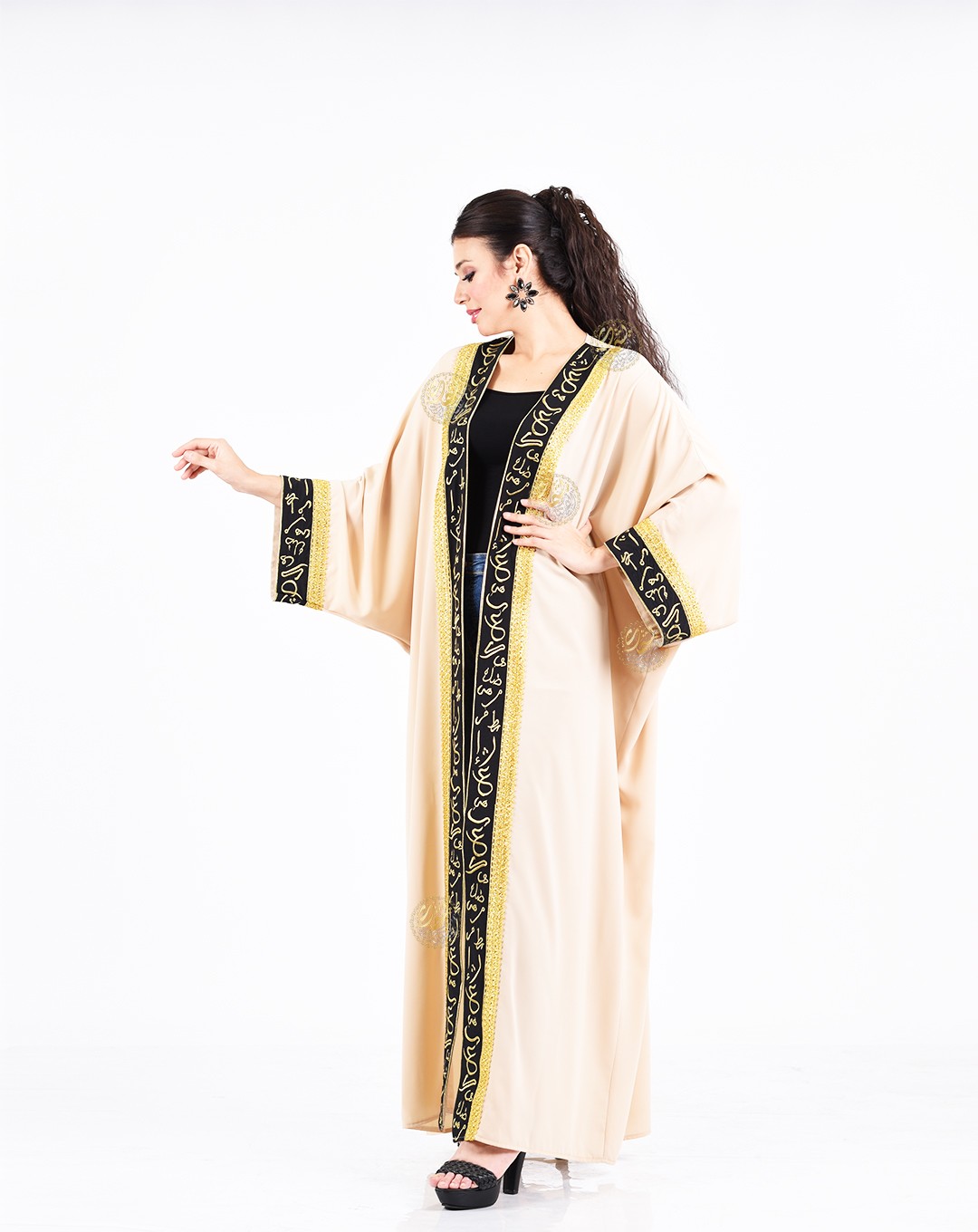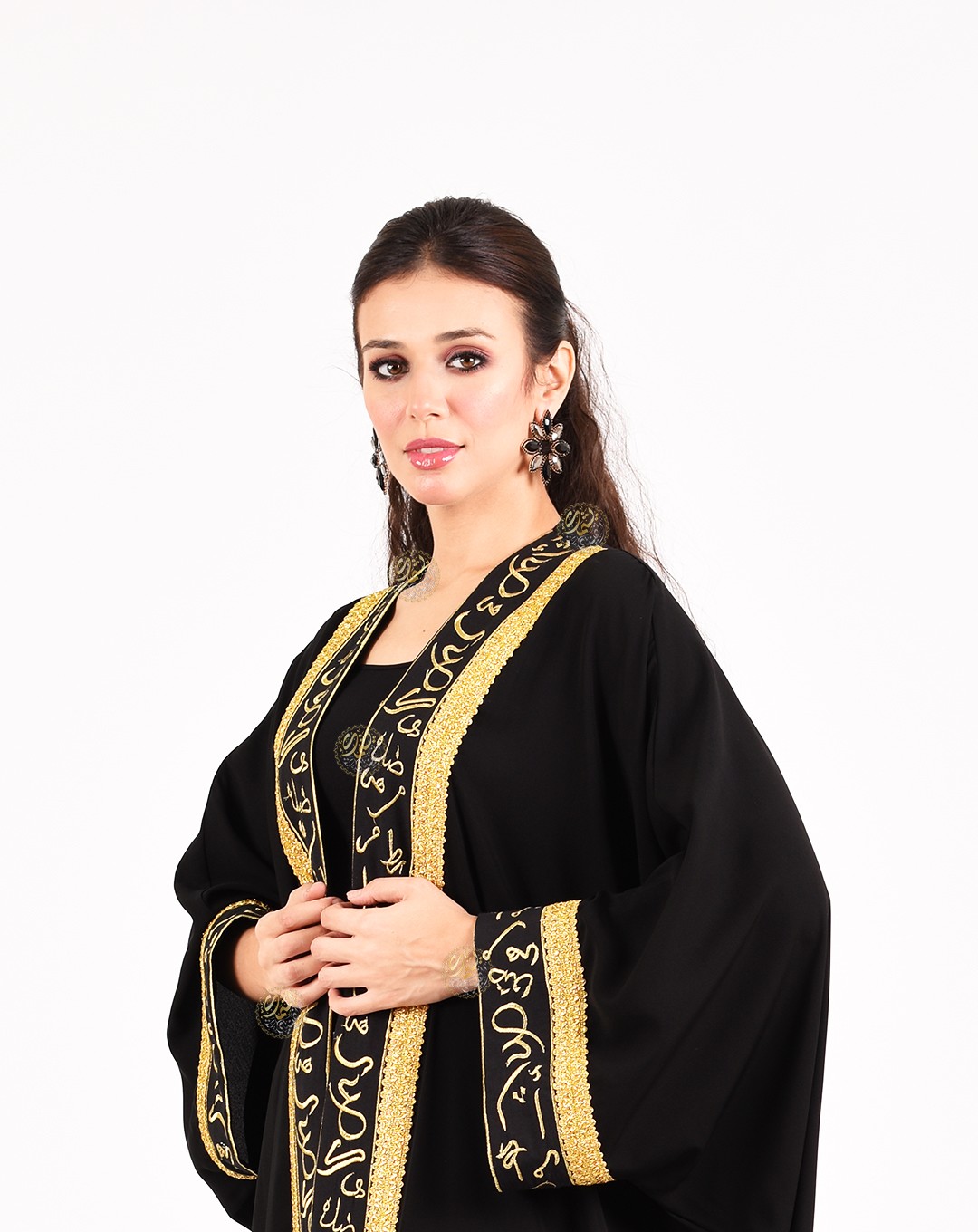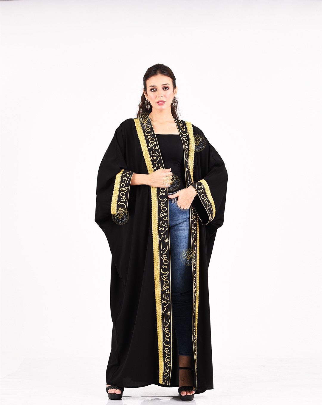 embellished with Kufic script embroidery inspired by Egyptian folk heritage,