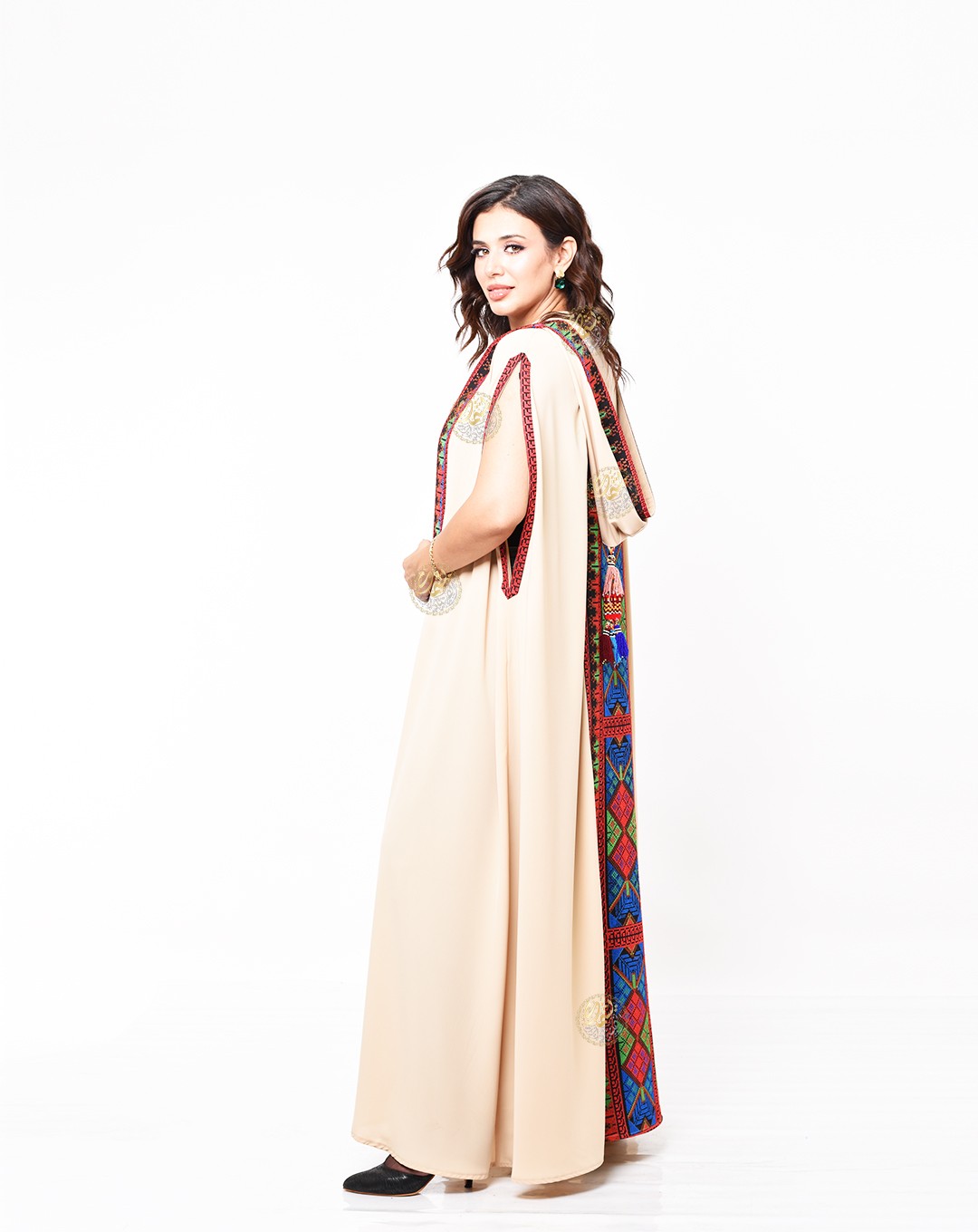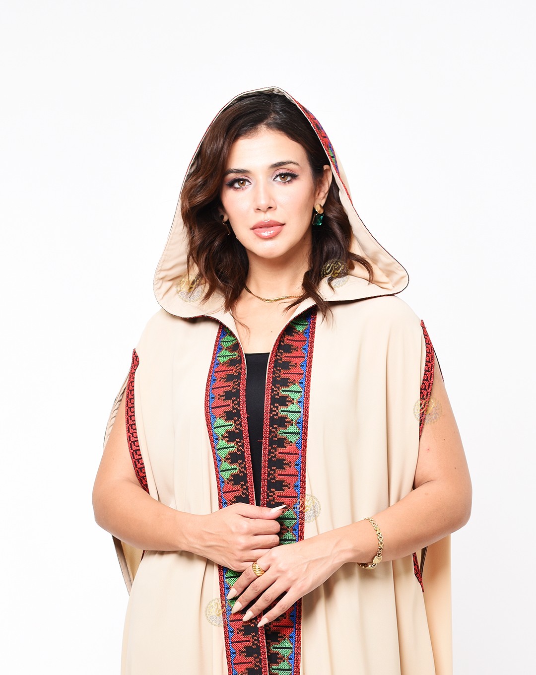 An elegant Moroccan-style cape made from luxurious royal crepe fabric, adorned with unique Palestinian embroidery, adding a distinctive oriental touch. Available in one size (Free Size) to fit all body types.