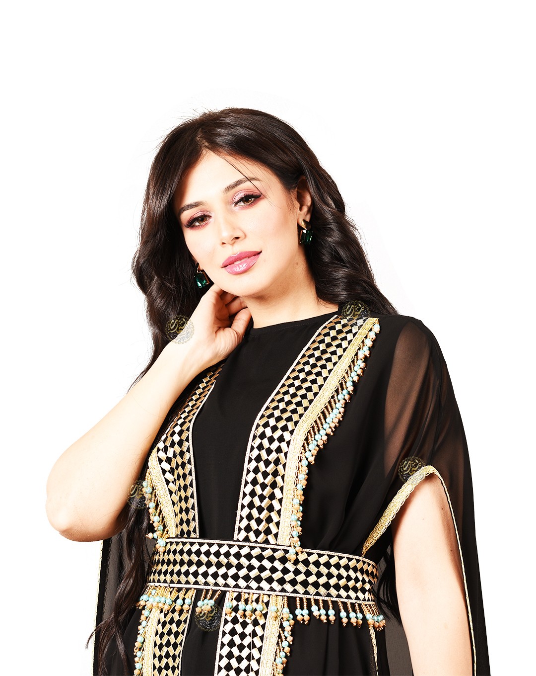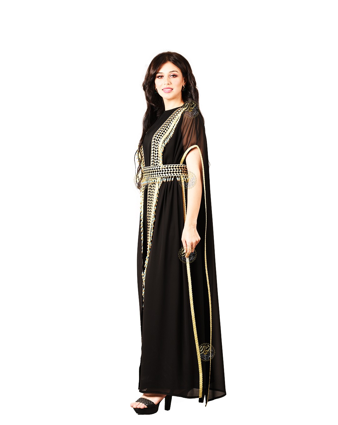 made from luxurious royal crepe fabric, paired with a black chiffon cape,