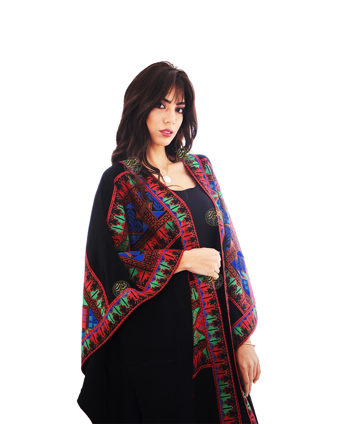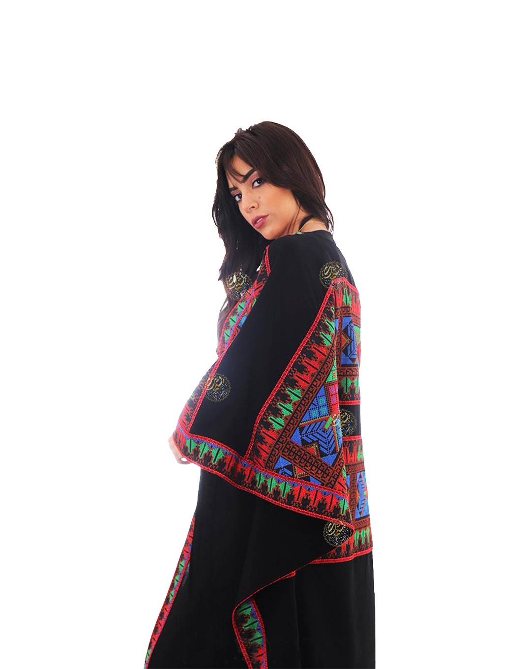 Palestinian design, embellished with oriental fabric and raised stitching,