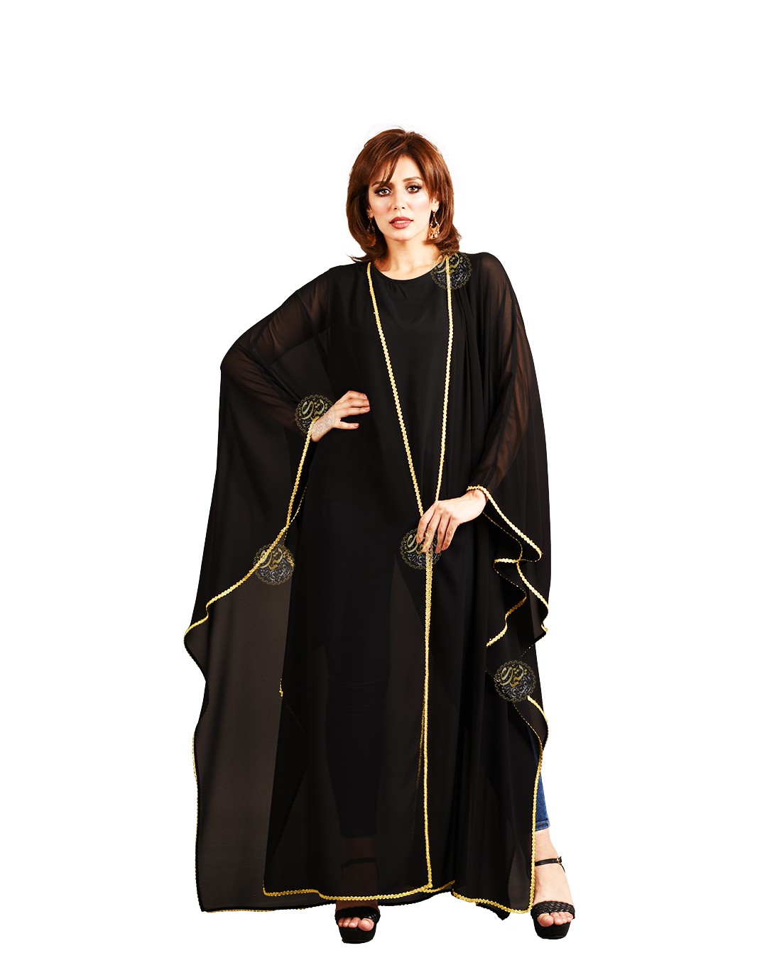the finest chiffon, embroidered with golden silk threads. The back is adorned