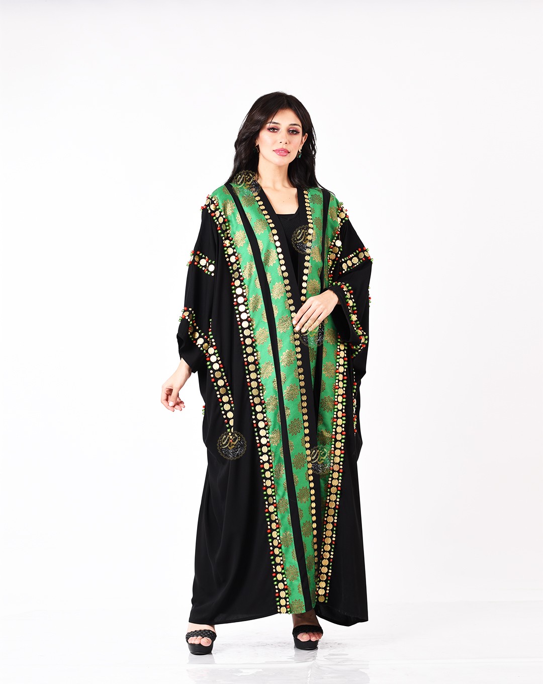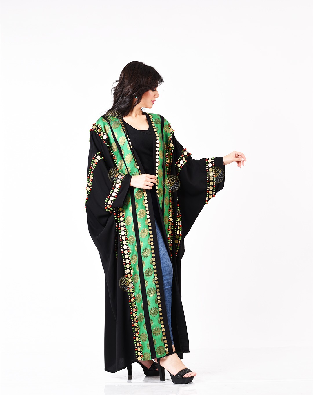 our evening collection, adorned with the distinctive green Indian fabric, and