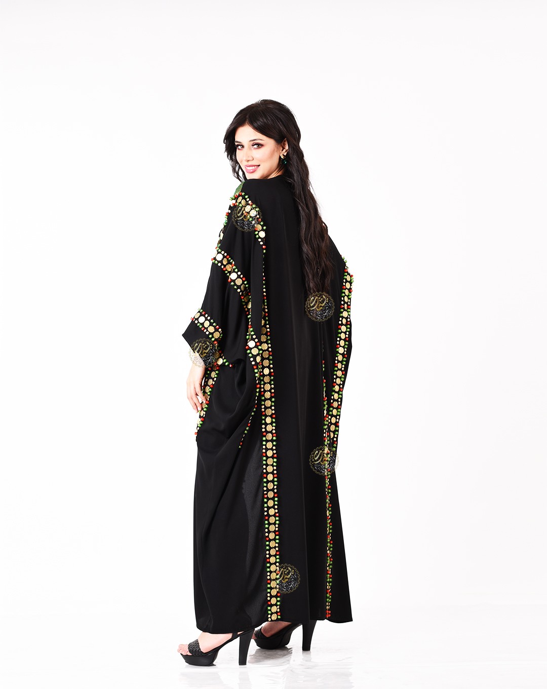 hand-embroidered with brass coins and colorful crystals. An elegant design,