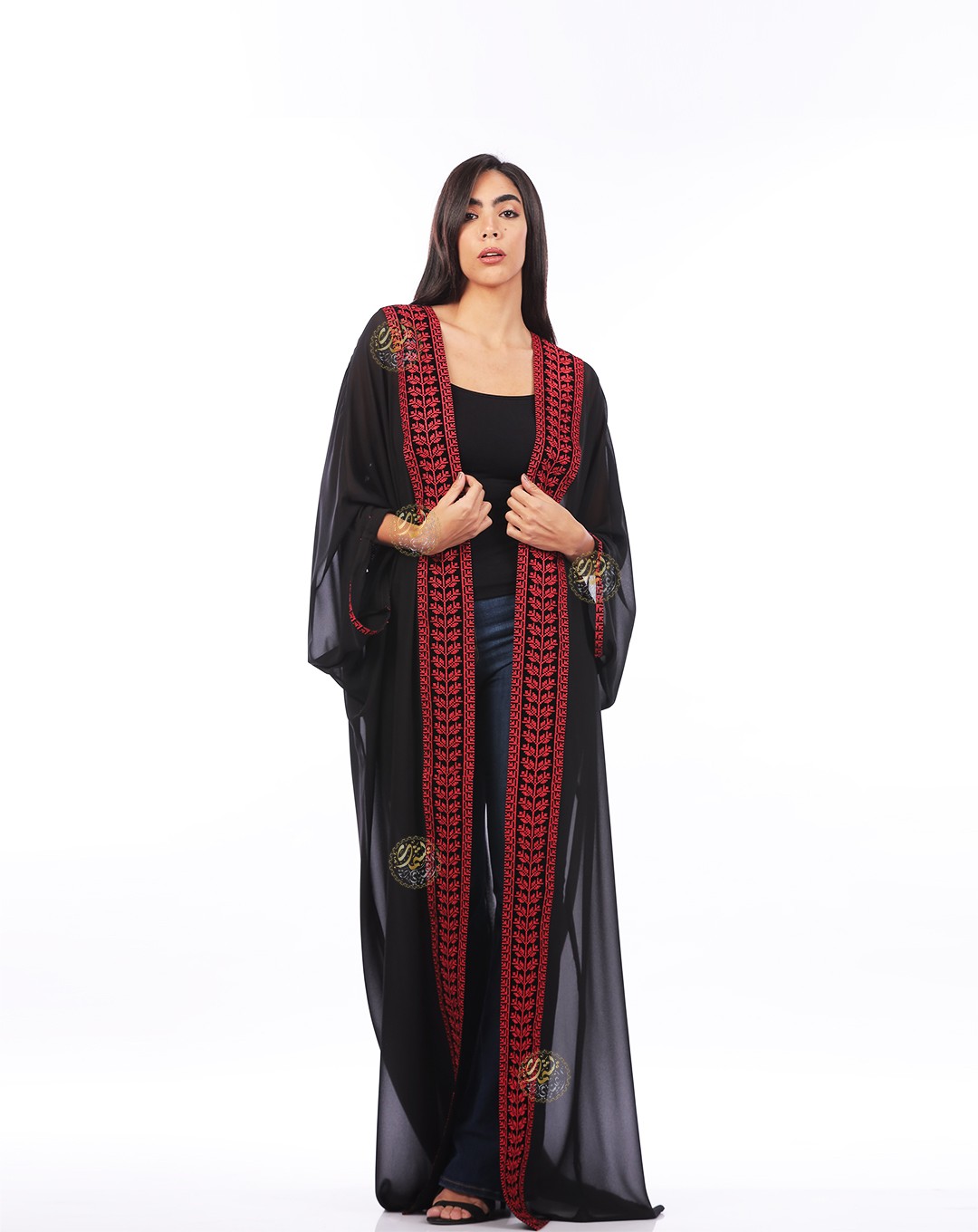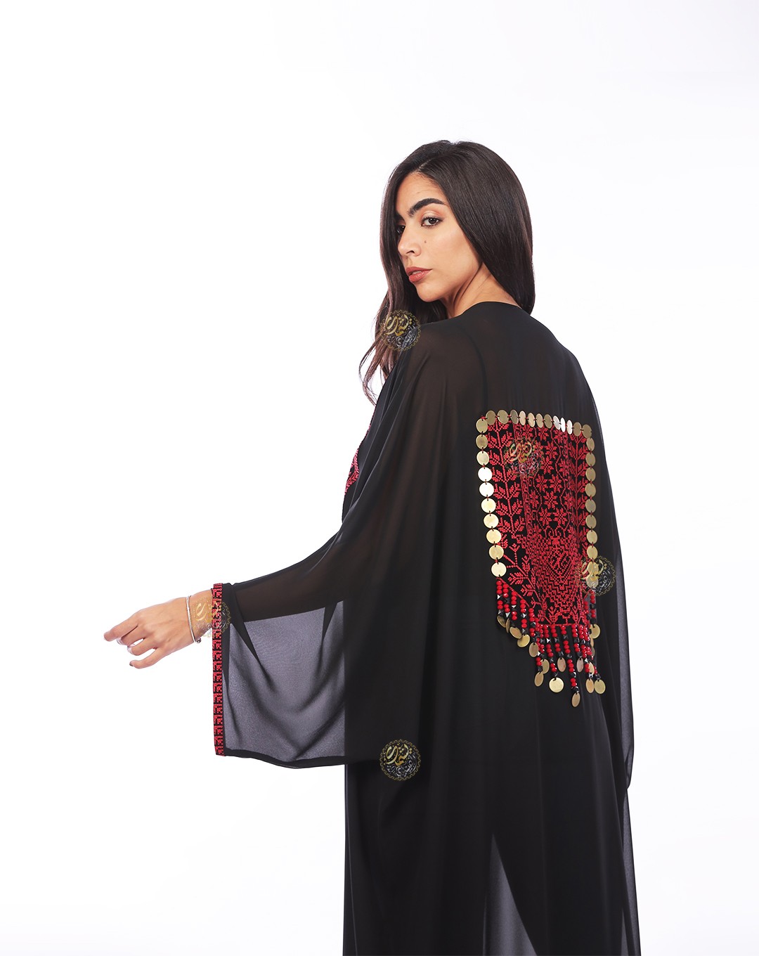 One of the most important and beautiful designs, this very elegant caftan is inspired by authentic Bedouin style. Made from luxurious royal Chiffon fabric with hand-embroidered etamin, and embellished with copper coins and colorful Bedouin beads. Available in a one-size fits all.