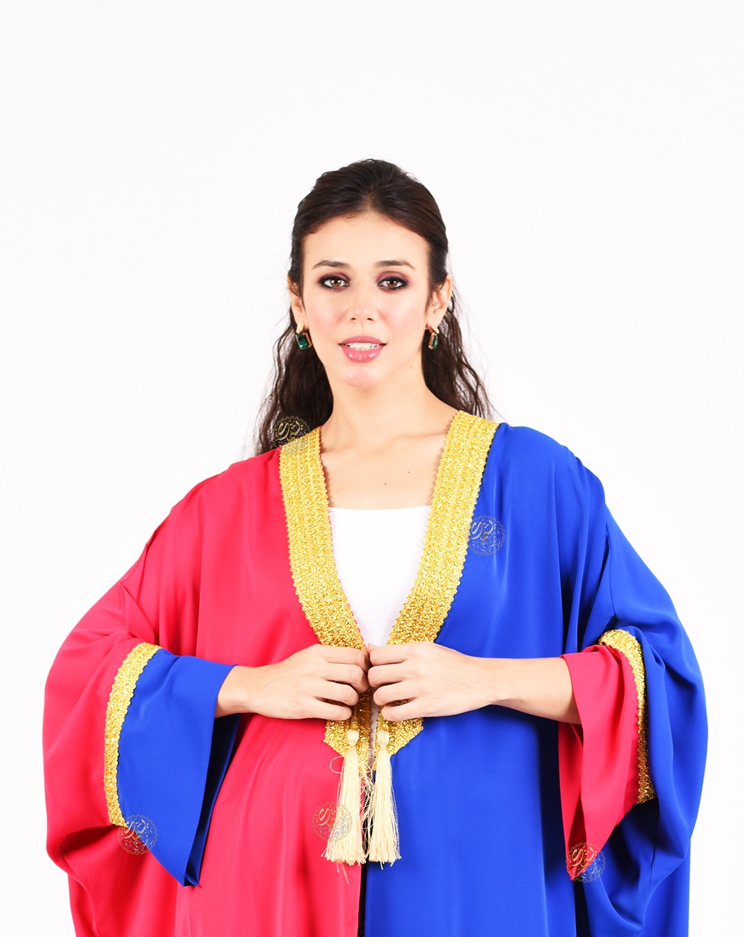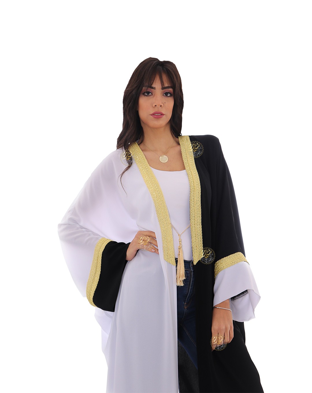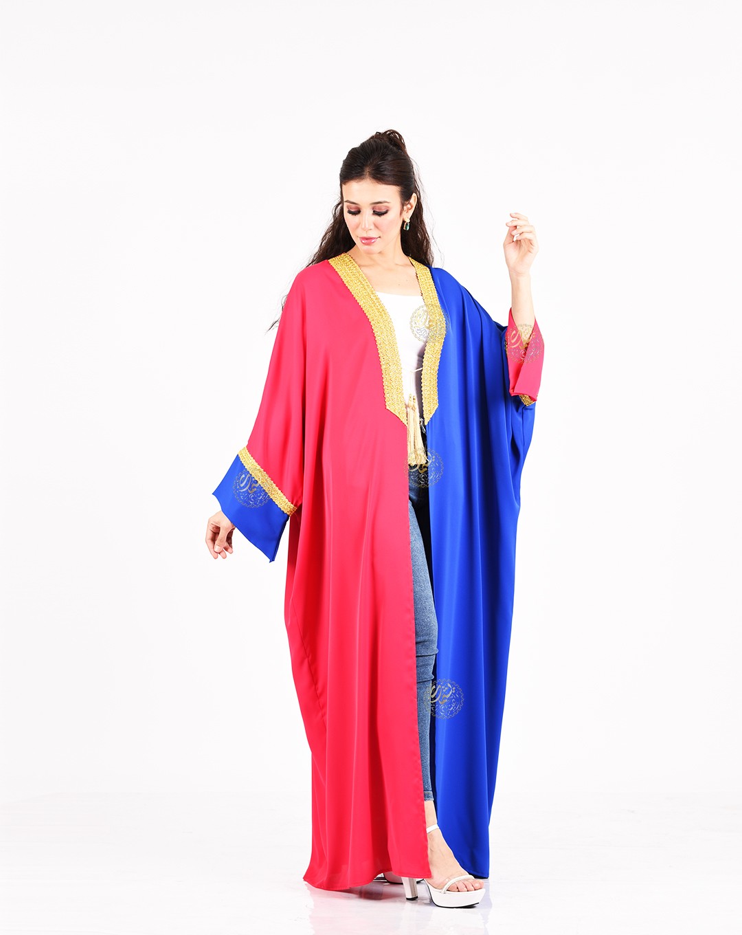 A unique and simple design, combining the beautiful royal crepe colors with elegant embroidery using golden silk threads. A stylish and perfect design for all occasions. Available in one size (Free Size) to fit all body types.