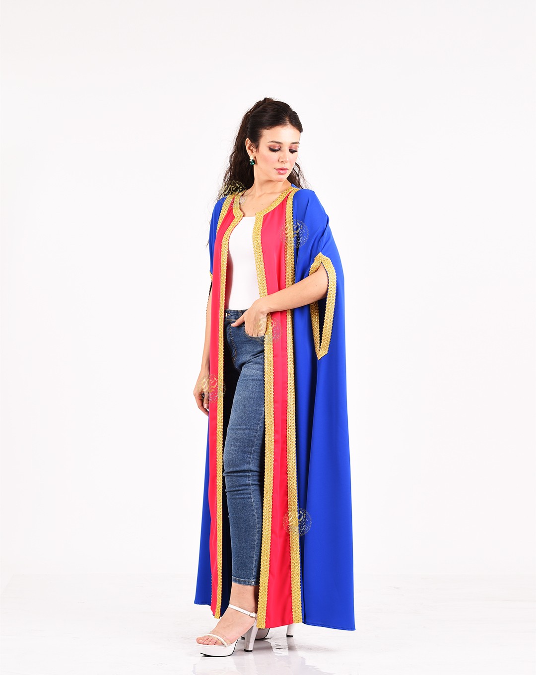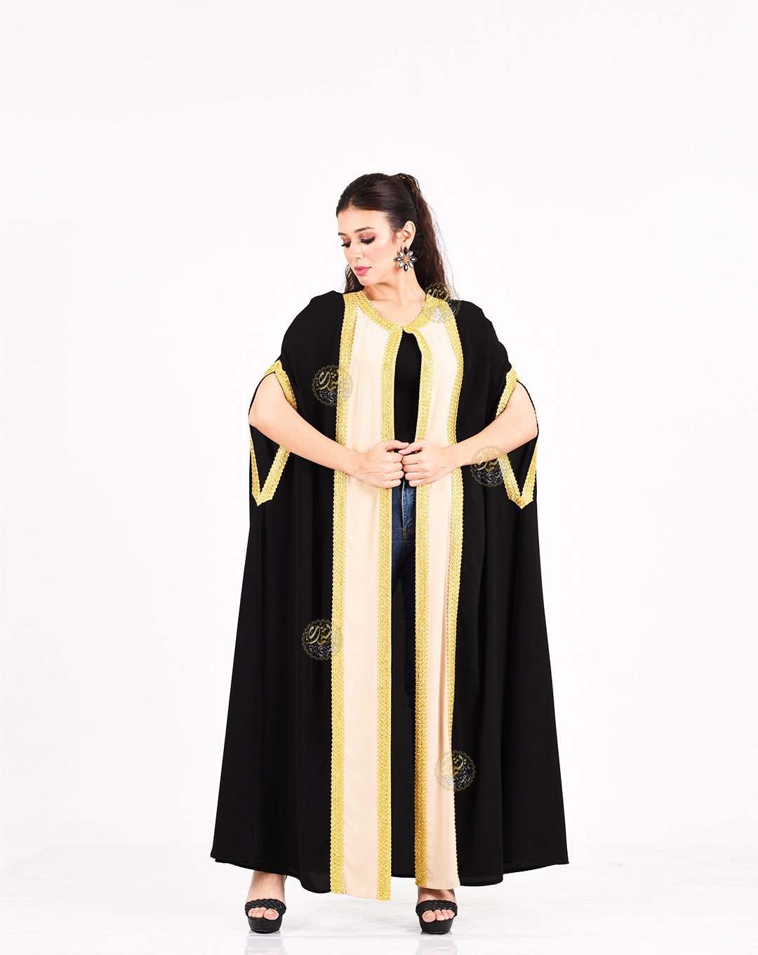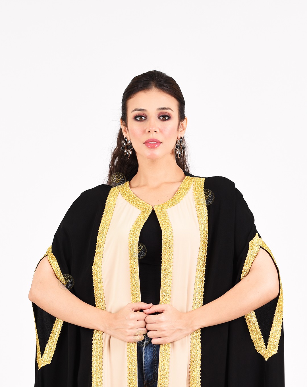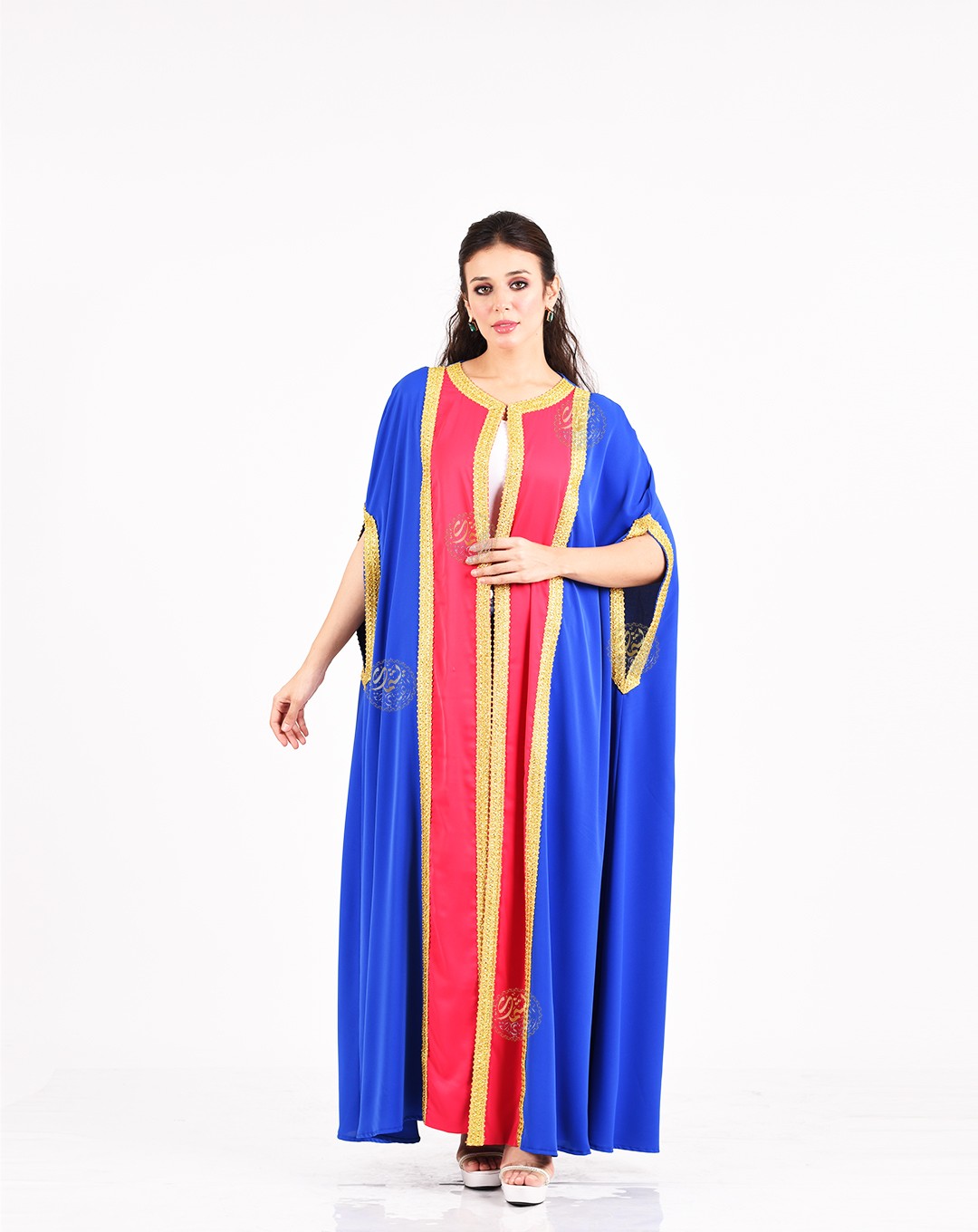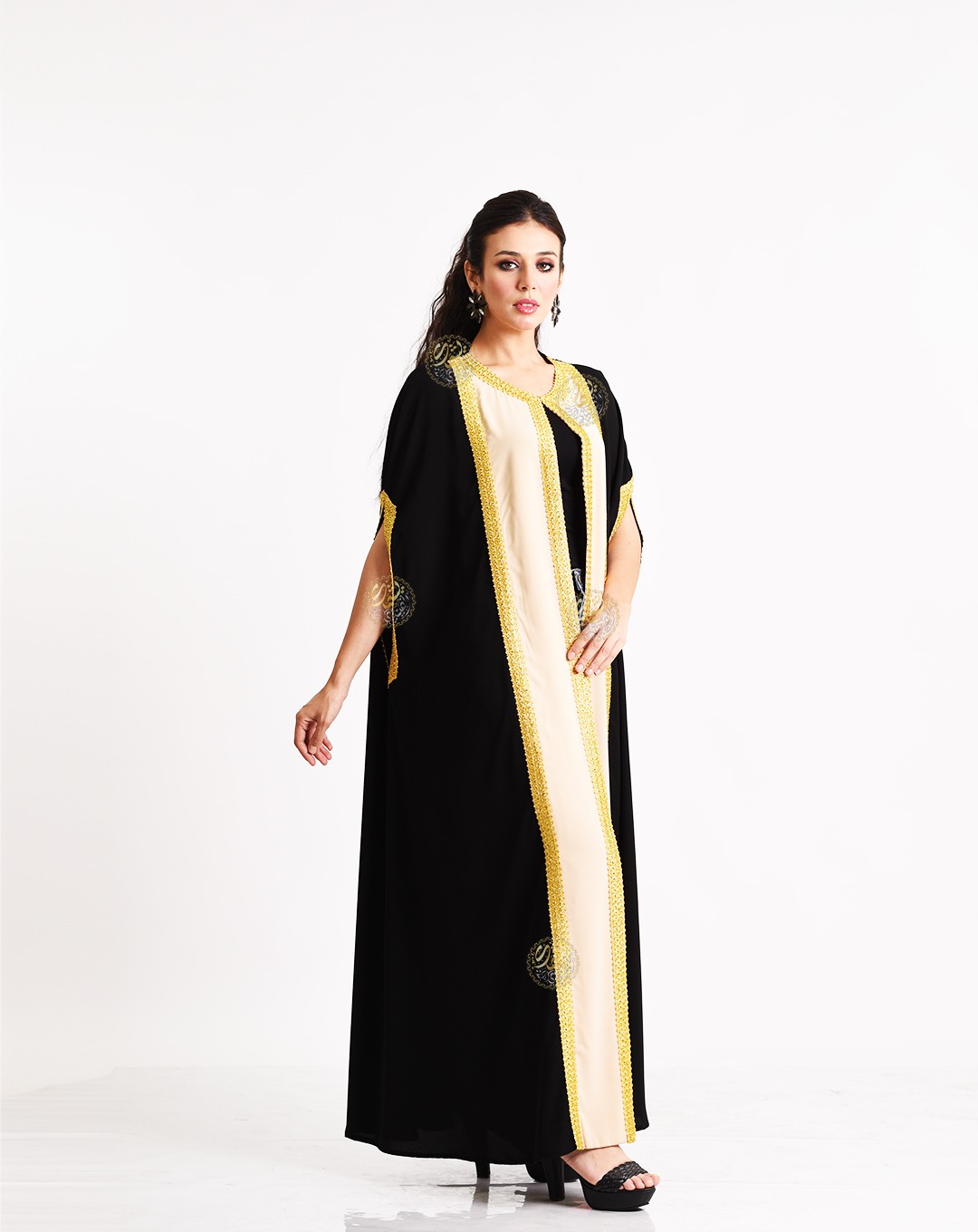 A unique and simple design, combining the beautiful royal crepe colors with elegant embroidery using golden silk threads. A stylish and perfect design for all occasions. Available in one size (Free Size) to fit all body types.