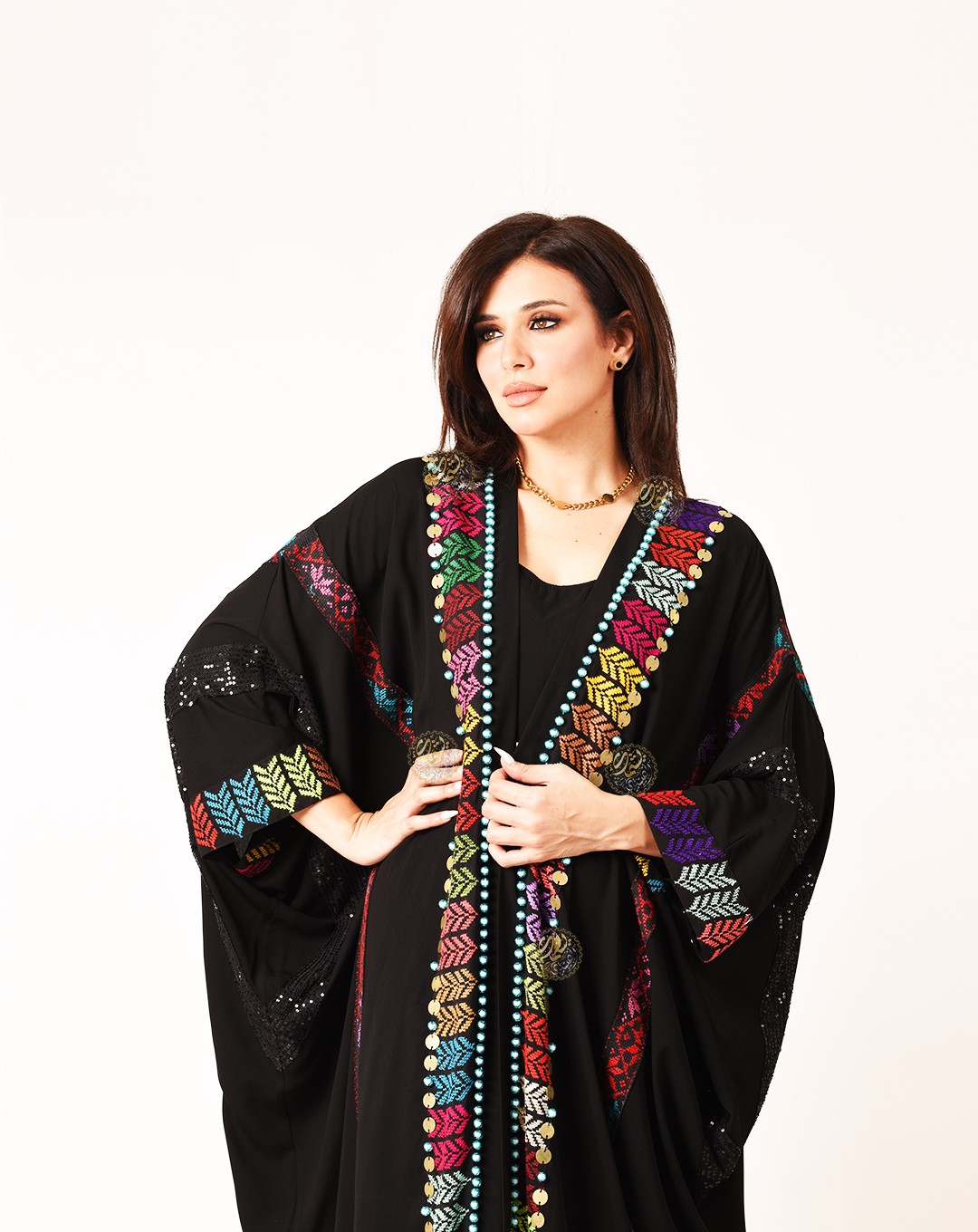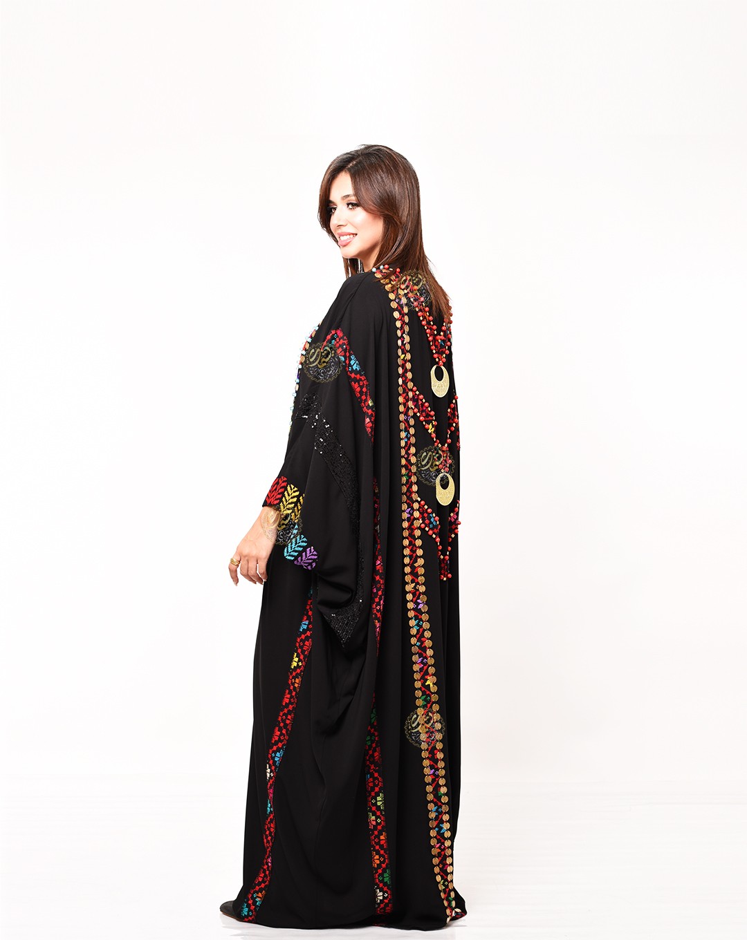 and fully hand-embroidered with brass, colorful beads, and gypsy earrings. An