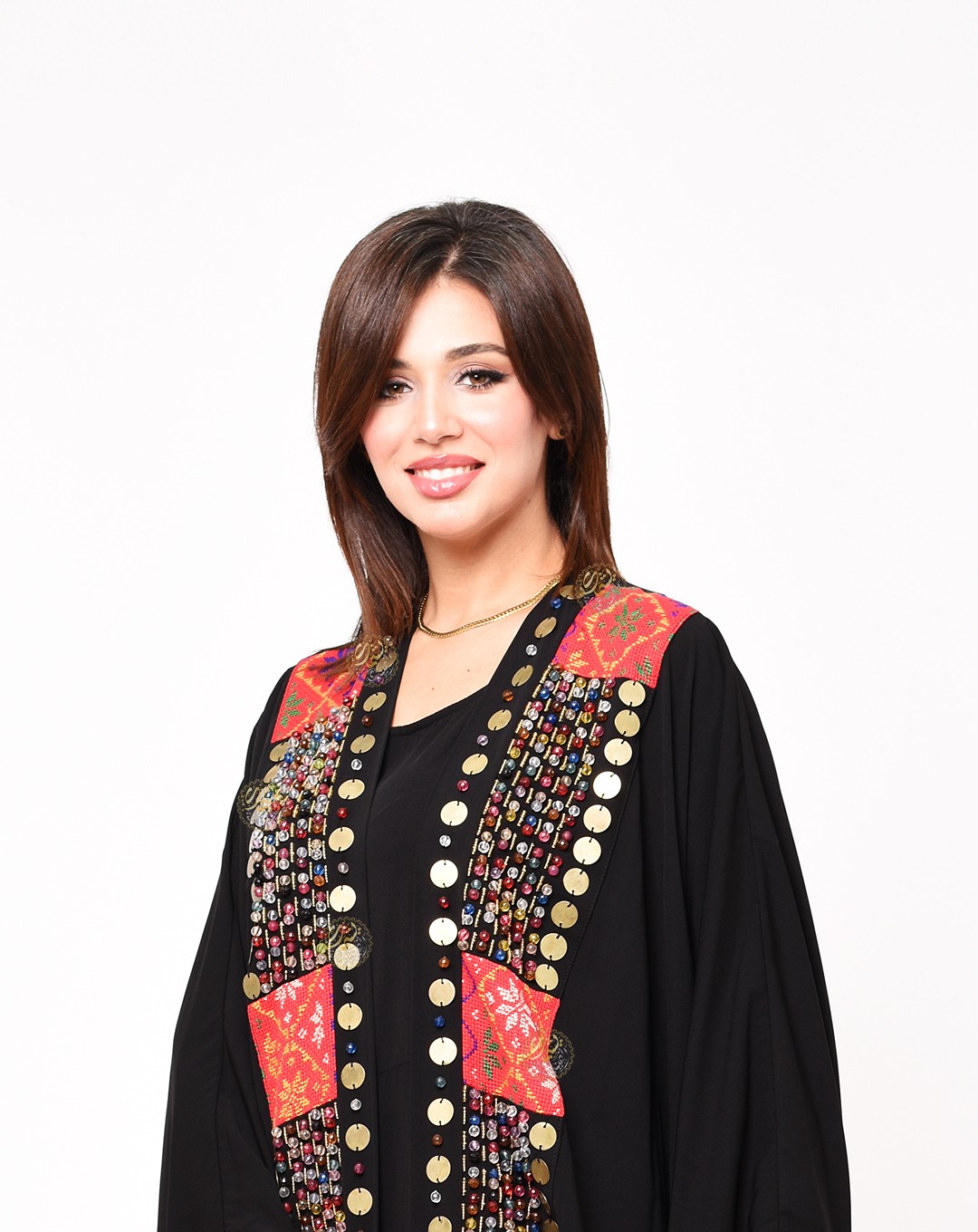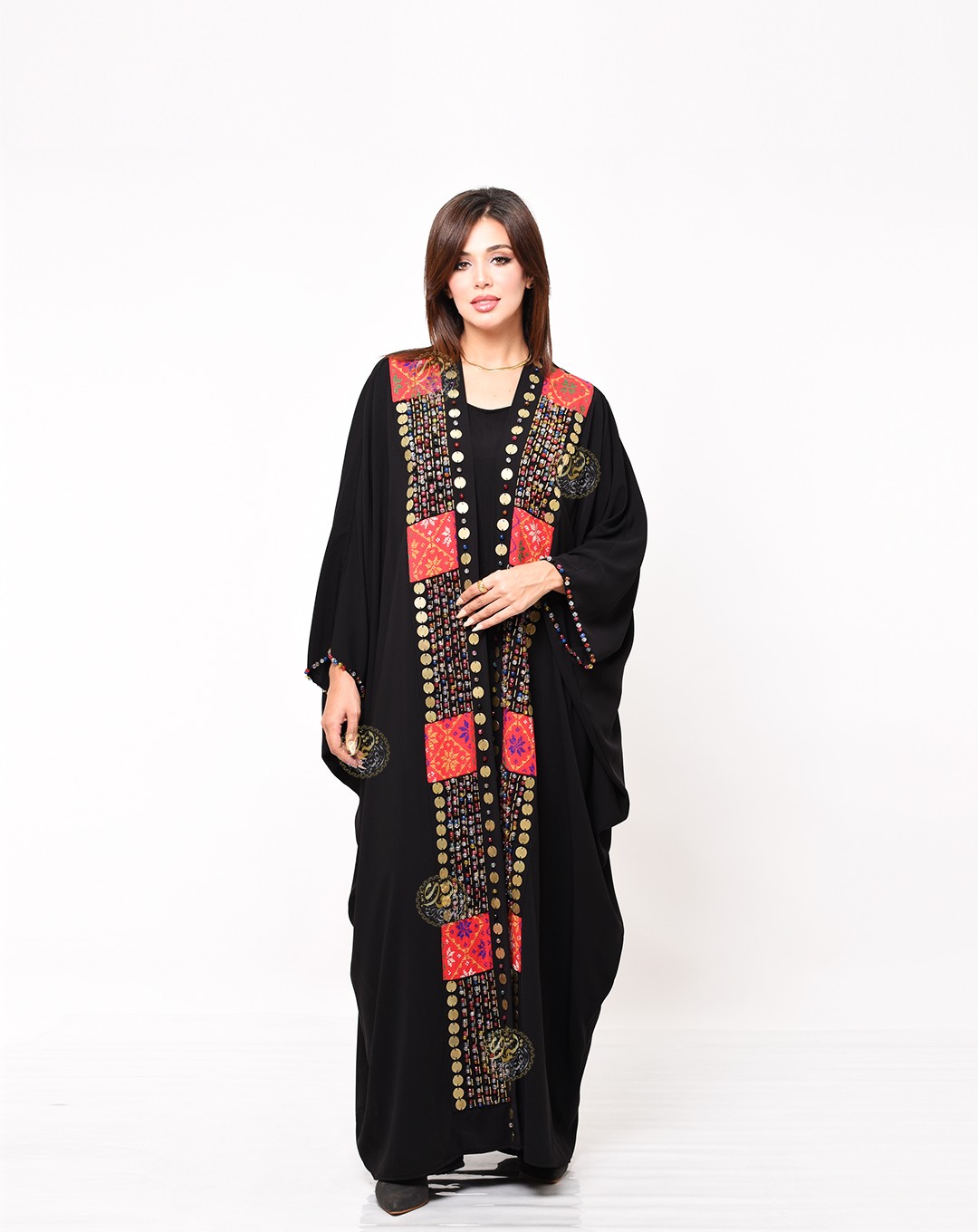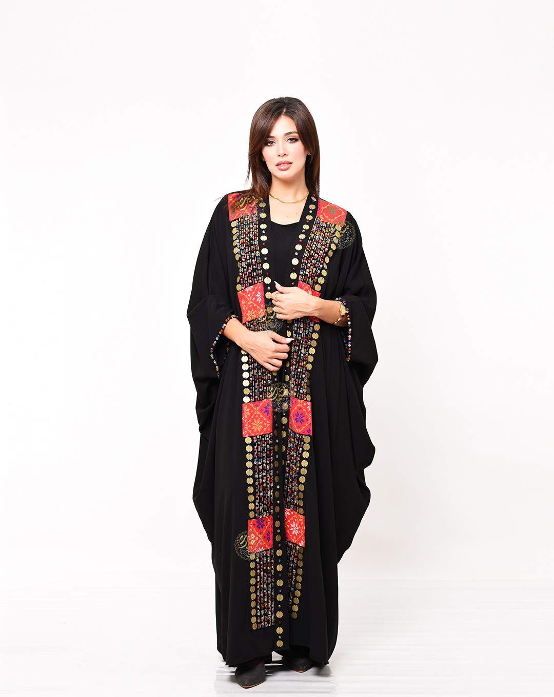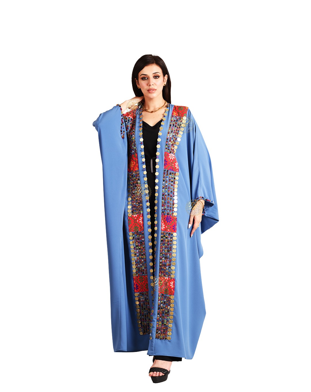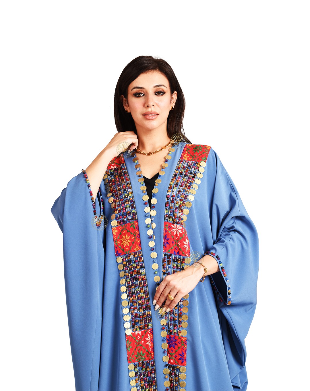 One of the most important and beautiful designs, this very elegant caftan is inspired by authentic Bedouin style. Made from luxurious royal crepe fabric with hand-embroidered etamin, and embellished with copper coins and colorful Bedouin beads. Available in a one-size fits all.