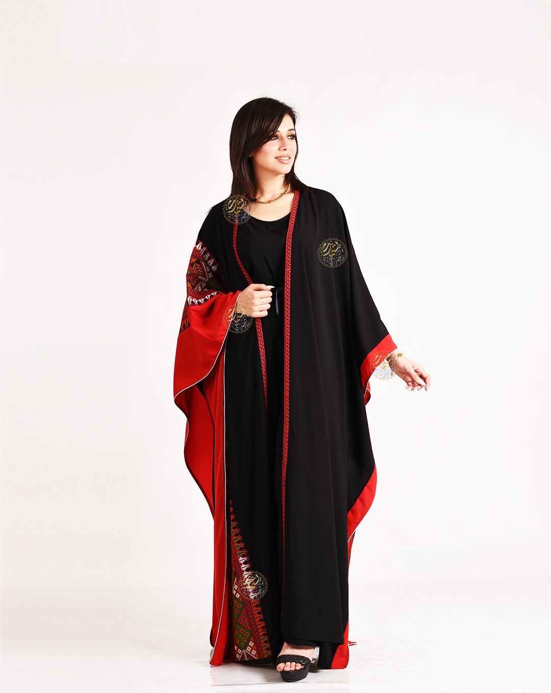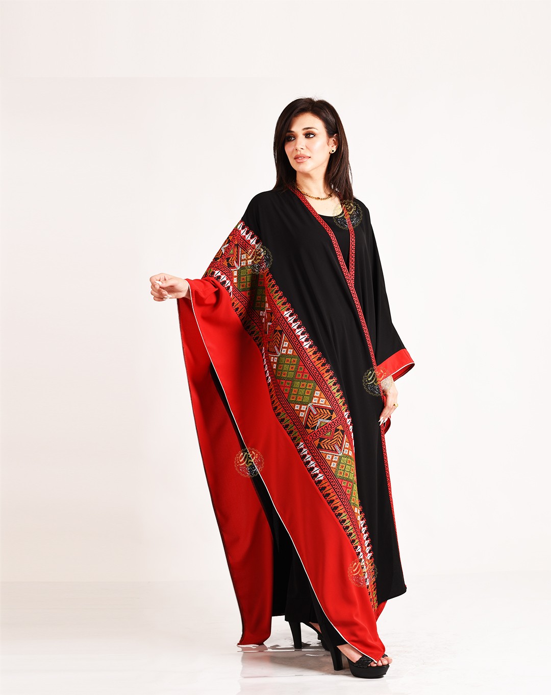 A beautiful kaftan with a unique design made from royal crepe, adorned with authentic Palestinian embroidery. Available in one size (Free Size).