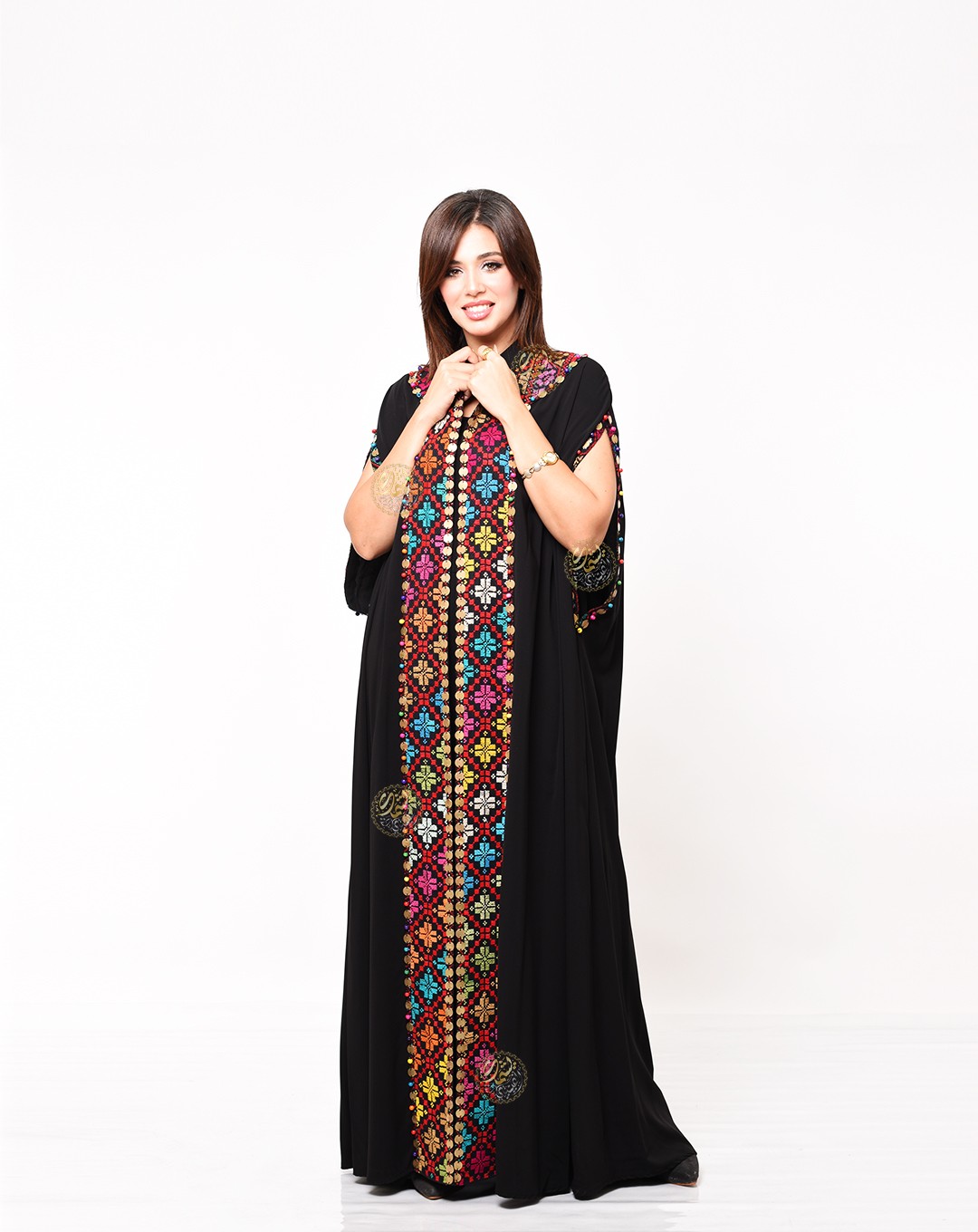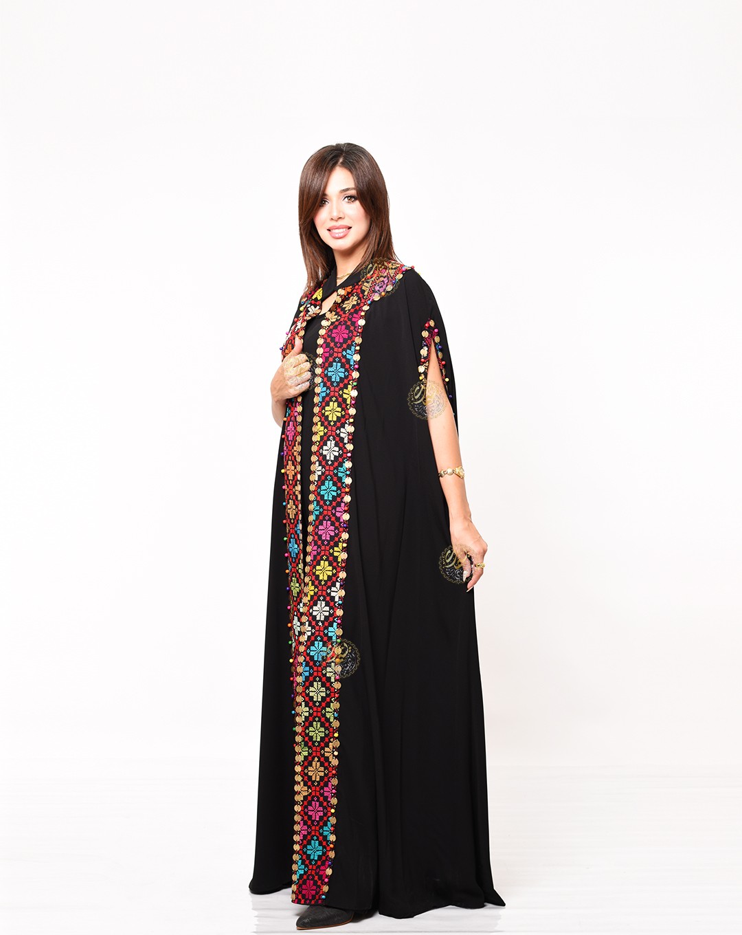 One of the most important and beautiful designs, this very elegant caftan is inspired by authentic Bedouin style. Made from luxurious royal crepe fabric with hand-embroidered etamin, and embellished with copper coins and colorful Bedouin beads. Available in a one-size fits all.